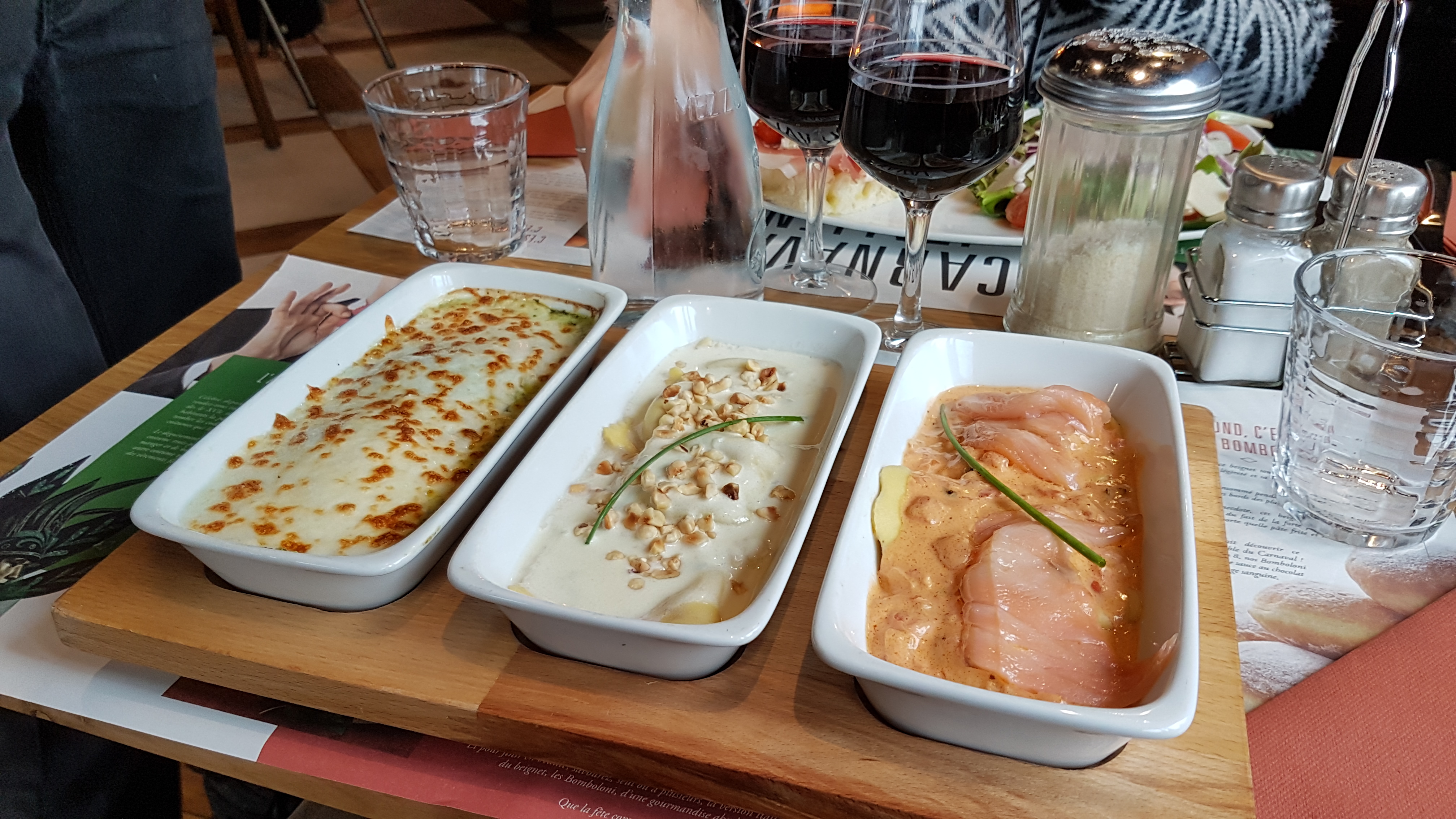 2 repas : 1 le midi et 1 le soir. Très bien accueillis à chaque fois et très bon. Petit bémol sur les gnocchis qui étaient meilleurs avant et sur les courants d'air constants provoqués par des enfants qui n'avaient de cesse de rentrer et de sortir par la sortie terrasse en dérangeant toute la salle.