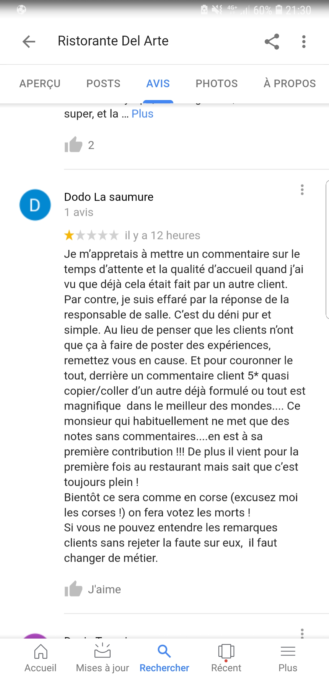 Je m’appretais à mettre un commentaire sur le temps d’attente et la qualité d’accueil quand j’ai vu que déjà cela était fait par un autre client. Par contre, je suis effaré par la réponse de la responsable de salle. C’est du déni pur et simple. Au lieu de penser que les clients n’ont que ça à faire de poster des expériences, remettez vous en cause. Et pour couronner le tout, derrière un commentaire client 5* quasi copier/coller d’un autre déjà formulé ou tout est magnifique dans le meilleur des mondes.... Ce monsieur qui habituellement ne met que des notes sans commentaires....en est à sa première contribution !!! De plus il vient pour la première fois au restaurant mais sait que c’est toujours plein ! Bientôt ce sera comme en corse (excusez moi les corses !) on fera votez les morts ! Si vous ne pouvez entendre les remarques clients sans rejeter la faute sur eux, il faut changer de métier.