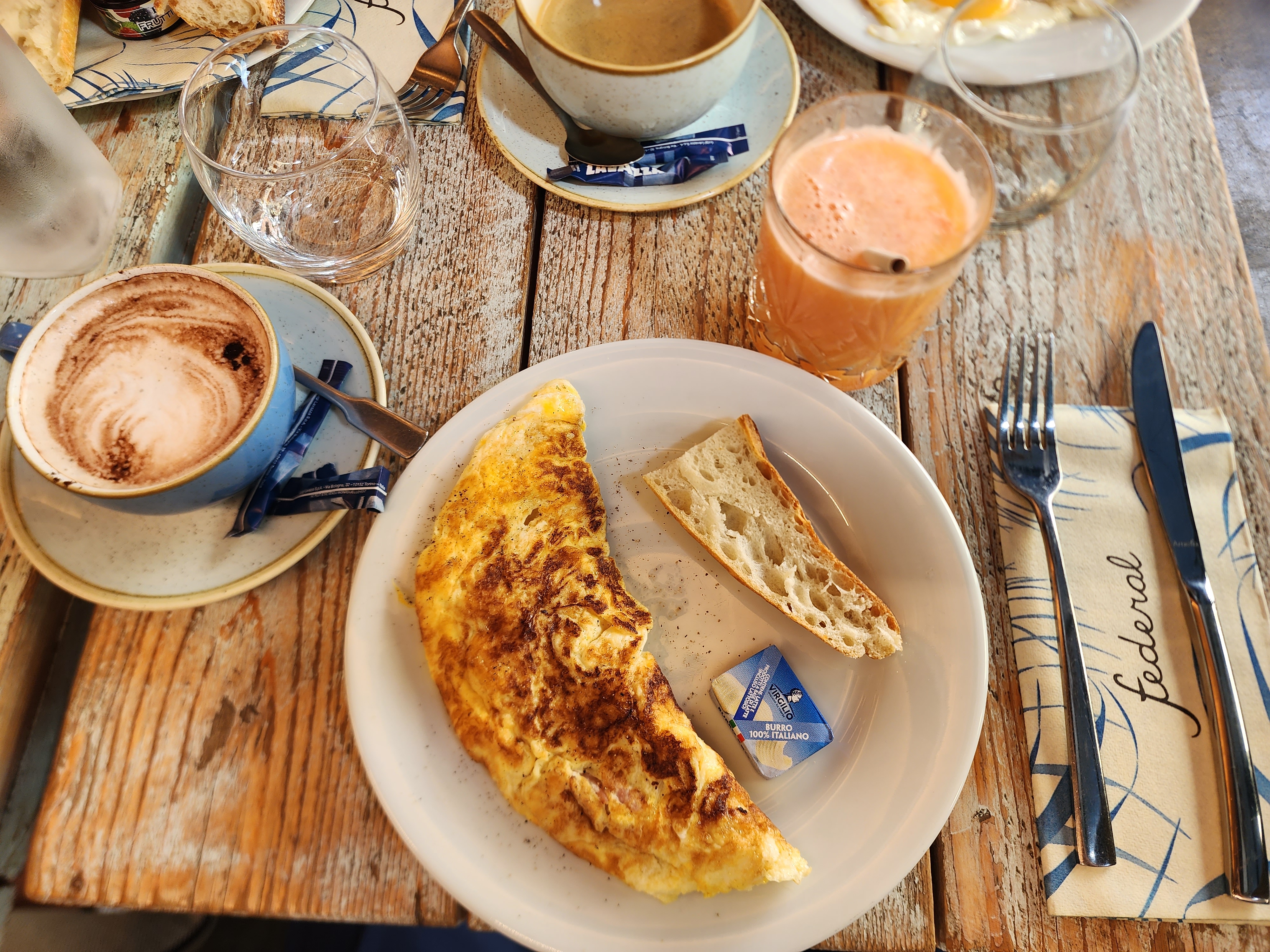 Sélection de petit-déjeuner agréable et savoureuse. croissants, pain français avec beurre et confiture génial, omelette aussi. Le serveur était très poli et disponible, parlant anglais. Café, jus de fruits frais... allez-y