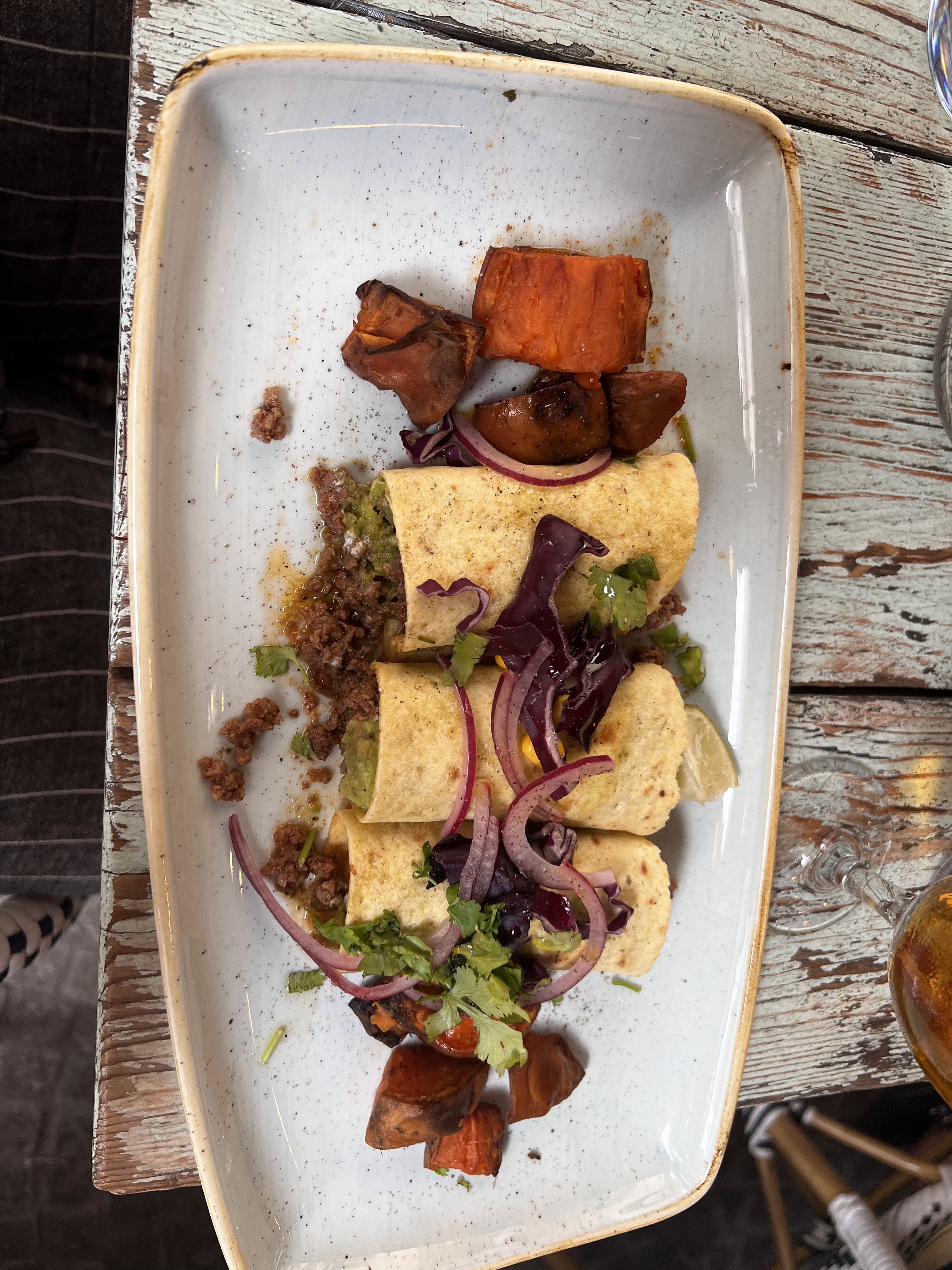 Ambiance agréable mais la nourriture que nous avons commandée était très fade. Nous avions commandé des tacos, pour moi les tacos au poulet, dans lesquels le poulet effiloché, mélangé à de la sauce tomate basique, était sec et sans goût… dommage pour le prix qu'on y paie. Je laisse un avis ici car pas une seule fois les serveurs ne nous ont demandé si nous avions apprécié notre repas (et oui nous parlions français)