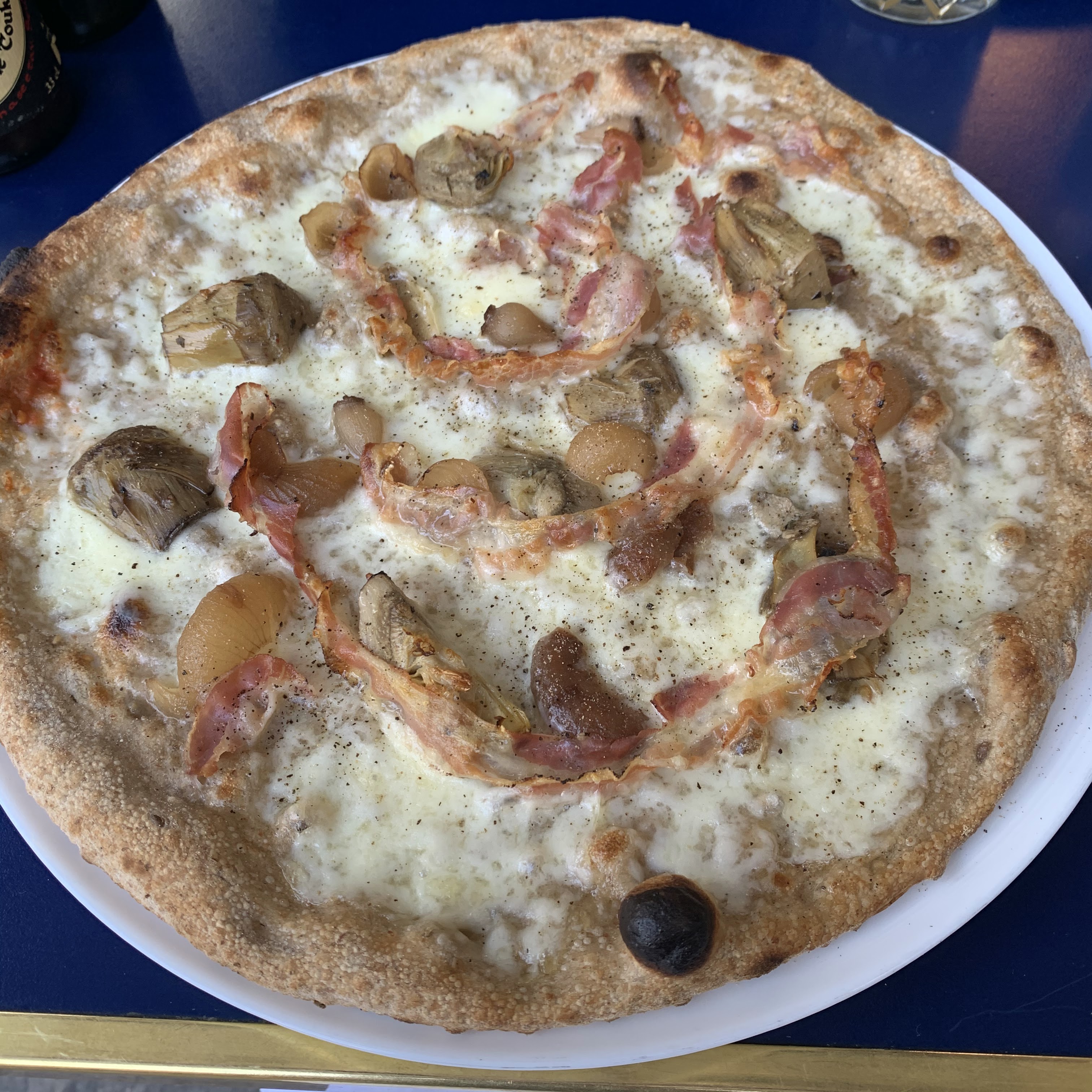 Jy suis allée pour la pizza au lard (car je ne trouve pas bcp de pizzeria qui la font) mais ce n’était pas exactement ce que je cherchais - avec le lard il y avait un legume sur la pizza (je ne me rappelle pas ce que c’était, j’aurais dit du choux mais un peu sucré) qui occupait trop de place. Le lard n’était pas suffisant. Mais la pate de pizza était tres bonne, le service excellent, et la terasse exterieure est tres agréable .
