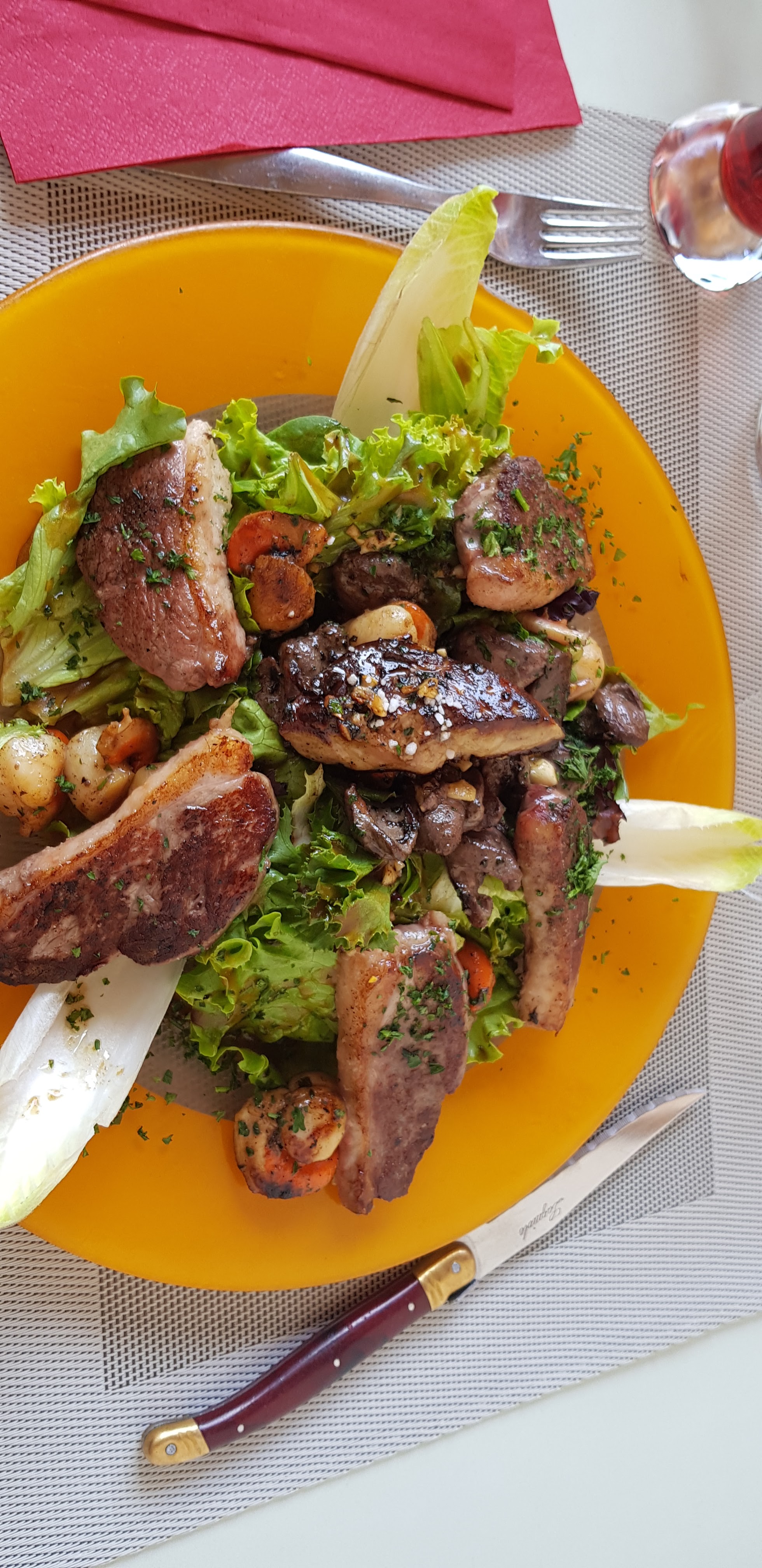Attention ⚠️ lorsque vous mangerez votre salade . Ayant trouvé un morceau de terre dans mon plat , je l’ai signalé au serveur afin qu’il puisse faire remonter ce désagrément. Le serveur étant tout de même très agréable je n’ai pas fais de scandale mais je trouve inacceptable qu’aucun geste commercial nous ai été proposé !!! On laisse partir les clients sur une très mauvaise impression alors que ce n’était pas une première pour nous mais nous ne reviendrons pas . Vraiment décevant…