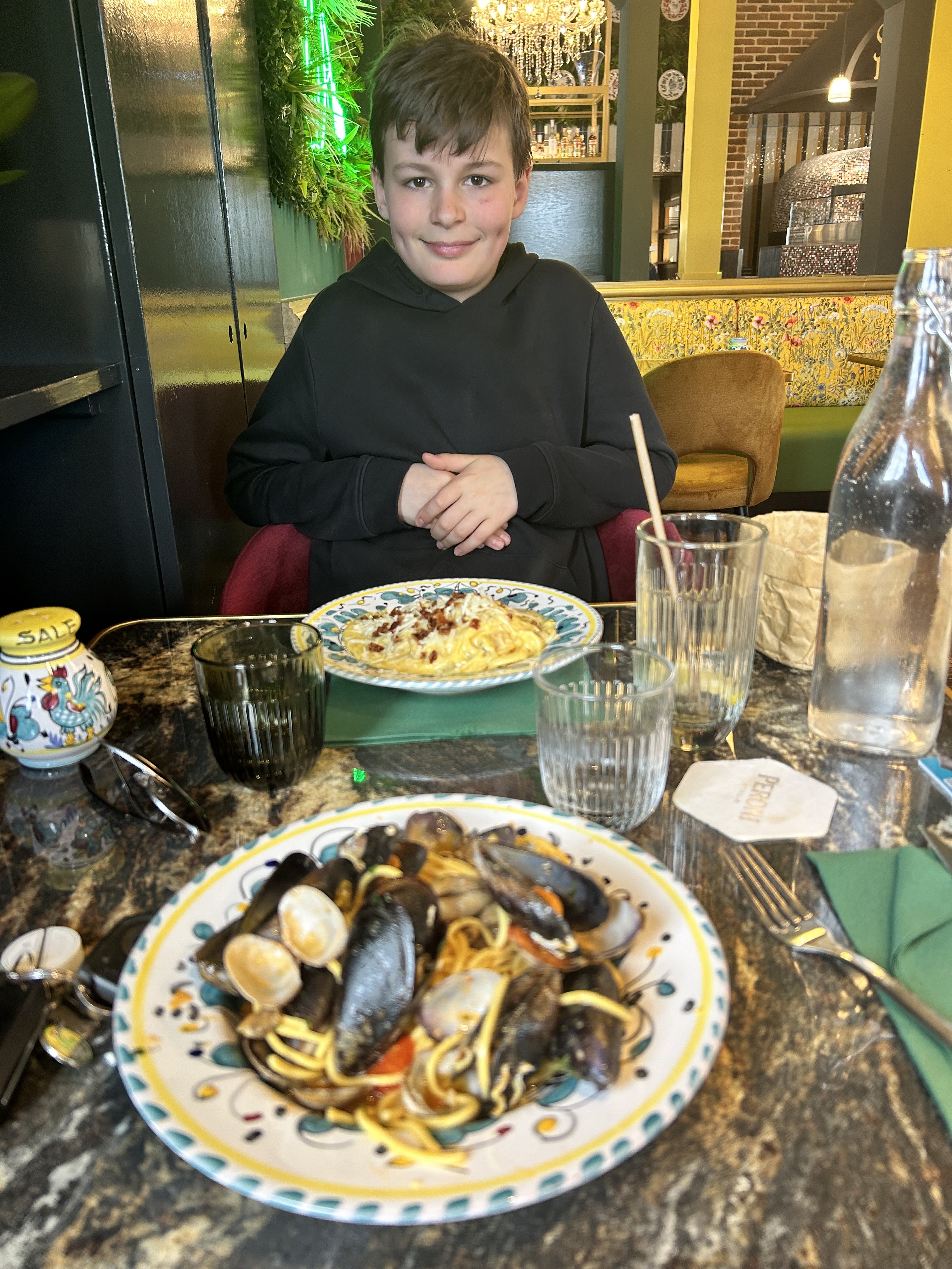 Pas terrible manque de garniture sur ma pizza j'avais pris celle avec la roquette et la stracciatella a la truffe pour moi il manquait des copeaux de truffe car a 18euro une pizza on s'attend a mieux et les pâtes a la bolognaise de notre fils netai pas assez cuite