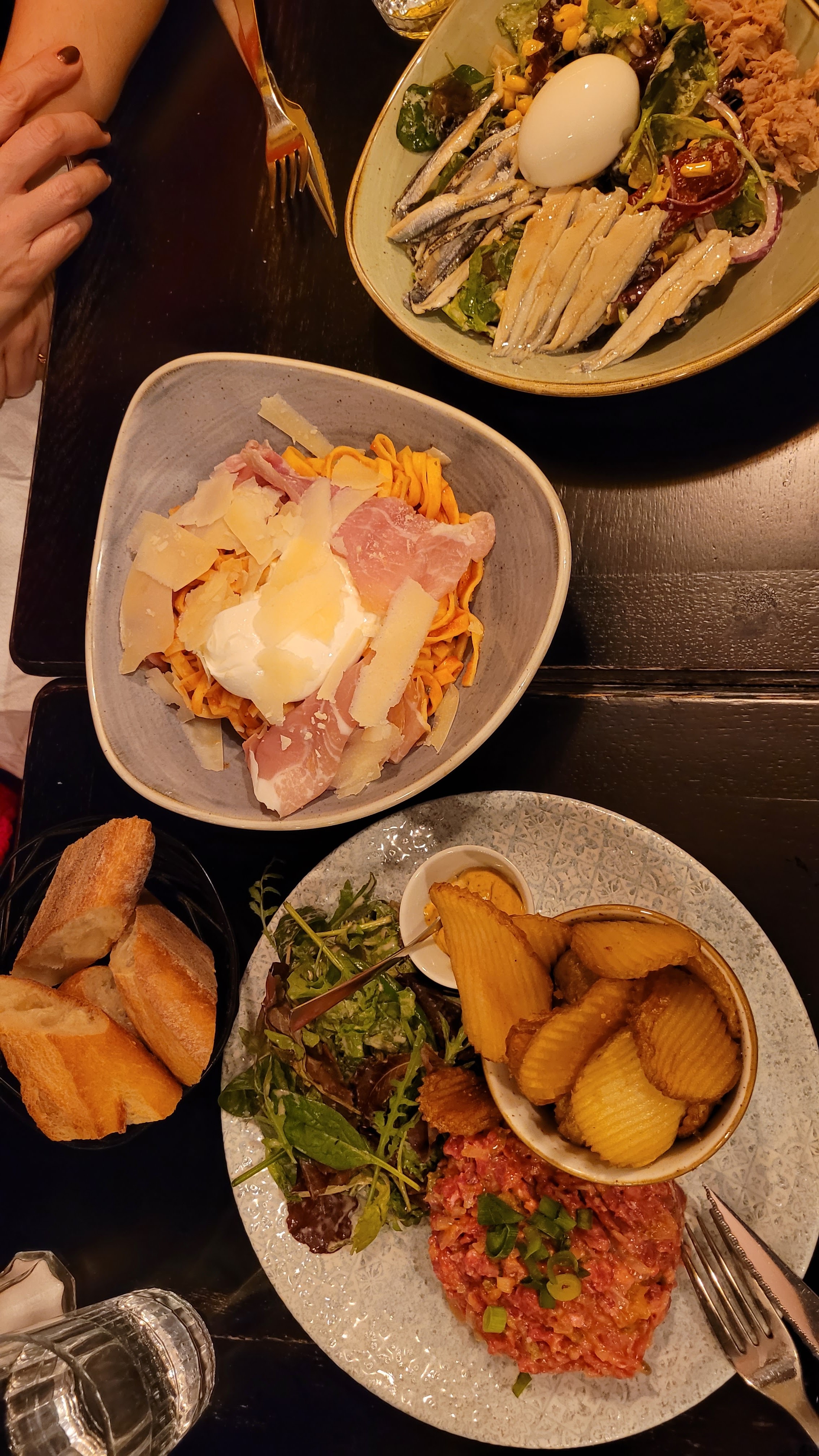 Très bonne nourriture, ambiance agréable, beaucoup de locaux mangent ici, donc vous pouvez supposer que c'est dans l'ensemble un bon restaurant, nous avons également eu une excellente expérience. Nous sommes des touristes au début, les gens étaient un peu hésitants (mais sympathiques), au bout d'un moment ils se détendent et sont très ouverts et accueillants. Nous avons eu un bon repas avec du bon vin, une très bonne expérience globale. (PS : le dessert au fromage est super, mais tellement 😅)