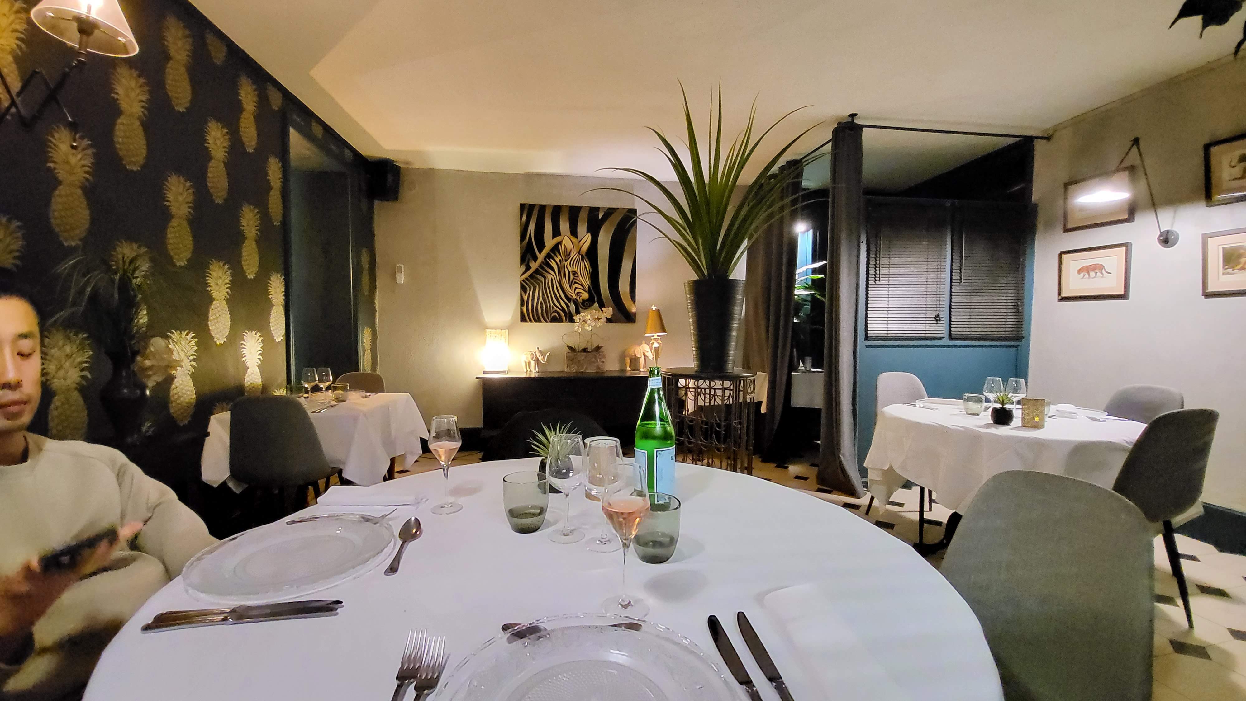 Un ravissement pour les papilles et pour les yeux. Dîner en amoureux pour mon anniversaire. Je ne connaissais ce restaurant que de nom. La carte est limitée mais ce n'est pas une critique, bien au contraire, car on y trouve de quoi plaire à tout le monde : boeuf, veau, saumon, saint Jacques, oeuf poché... L'accueil est très chaleureux et courtois sans être guindé, le service impeccable et le style du restaurant (ambiance safari chic) original et accueillant (Un peu moins fan du papier peint avec des gros ananas dans la salle à l'entrée mais pas choquant non plus) Côté saveurs, un sans-faute de l'entrée au dessert autant pour moi que pour mon amoureux. On a particulièrement aimé les ravioles aux champignons en entrée et les st Jacques avec sa fondue de poireaux en plat et le sauté de veau aux gambas. Ces plats sont plutôt des classiques, certes, mais au final vraiment originaux car on y trouve des sauces, réductions ou ingrédients pas habituels et particulièrement bien travaillés avec des produits indéniablement frais et de qualité. Seule petite déception pour moi pour la tarte au chocolat choisie en dessert. Je m'attendais plus à une vraie tartelette ou part de tarte mais j'aurais plutôt appelé cela un dessert façon tarte au chocolat avec une sauce au chocolat un peu trop prononcée à mon goût, mais bien contre-balancée par la crème anglaise servie à côté. Ceci dit c'était très bon mais juste pas ce que j'affectionne le plus. C'est pour cela que je mets tout de même la note maximale. J'ai particulièrement apprécié que le chef passe voir toutes les tables en fin de service, avec beaucoup de modestie, pour savoir si tout s'était bien passé. Côté prix ce n'est pas le restaurant que je pourrais fréquenter toutes les semaines mais ces plats succulents méritent vraiment ces prix. Ce sont pas non plus des prix dignes d'un restaurant chic ou étoilé même si la qualité, elle, n'en est pas loin je pense. J'y retournerai avec certitude lorsque j'en aurai l'occasion et je sais déjà qu'il me sera difficile de choisir autre chose que les st Jacques qui sont les meilleures st Jacques à la fondue de poireaux que j'aie jamais mangées ( en sachant que ce plat fait partie de mon top 3 depuis des années!)