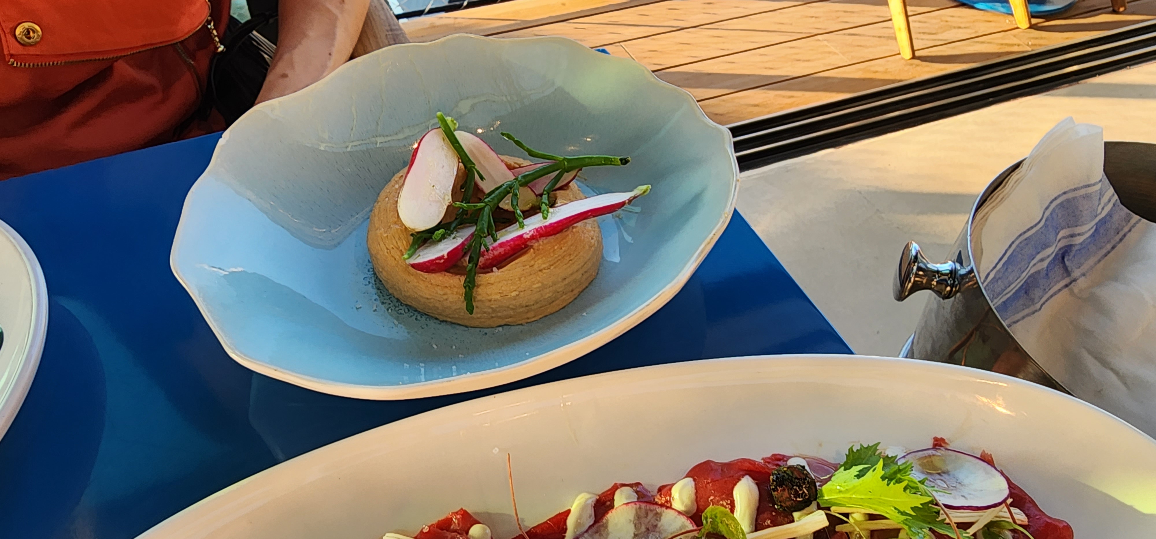 Je suis assez mitigée Venue pour mon anniversaire avec une amie et fêter ça tranquillement avec une belle vue. La belle vue ça aucun doute, la cuisine en revanche on a pas trop compris. Nous avons pris le menu déjeuner pour se laisser surprendre et c’était une belle promesse au début. Pour l’entrée (thon mi cuit avec asperges vertes et sauce mangue) c’était délicieux, en revanche pour le plat c’était des gnocchis à la patate douce TROP cuit, on ne pouvait pas planter la fourchette dedans et selon le ou les cuisinier(s) c'est normal 🥸 (il ne faut pas prendre les gens pour des idiots), le remplacer par des pâtes n’aurait tuer personne mais la mousse de citron vert et champignons étaient délicieux. Heureusement le dessert extrêmement léger était très bon (chantilly, sorbet mangue et granola). Allez y les yeux fermés pour les tapas 👌 On voulait remercier notre serveuse Océane qui a été génial du début à la fin malgré les péripéties (pluies). Souriante, avenante et elle nous a fait passé un agréable moment donc merci ☺️ je ne doute pas que les autres serveurs sont tout aussi sympa. Merci !