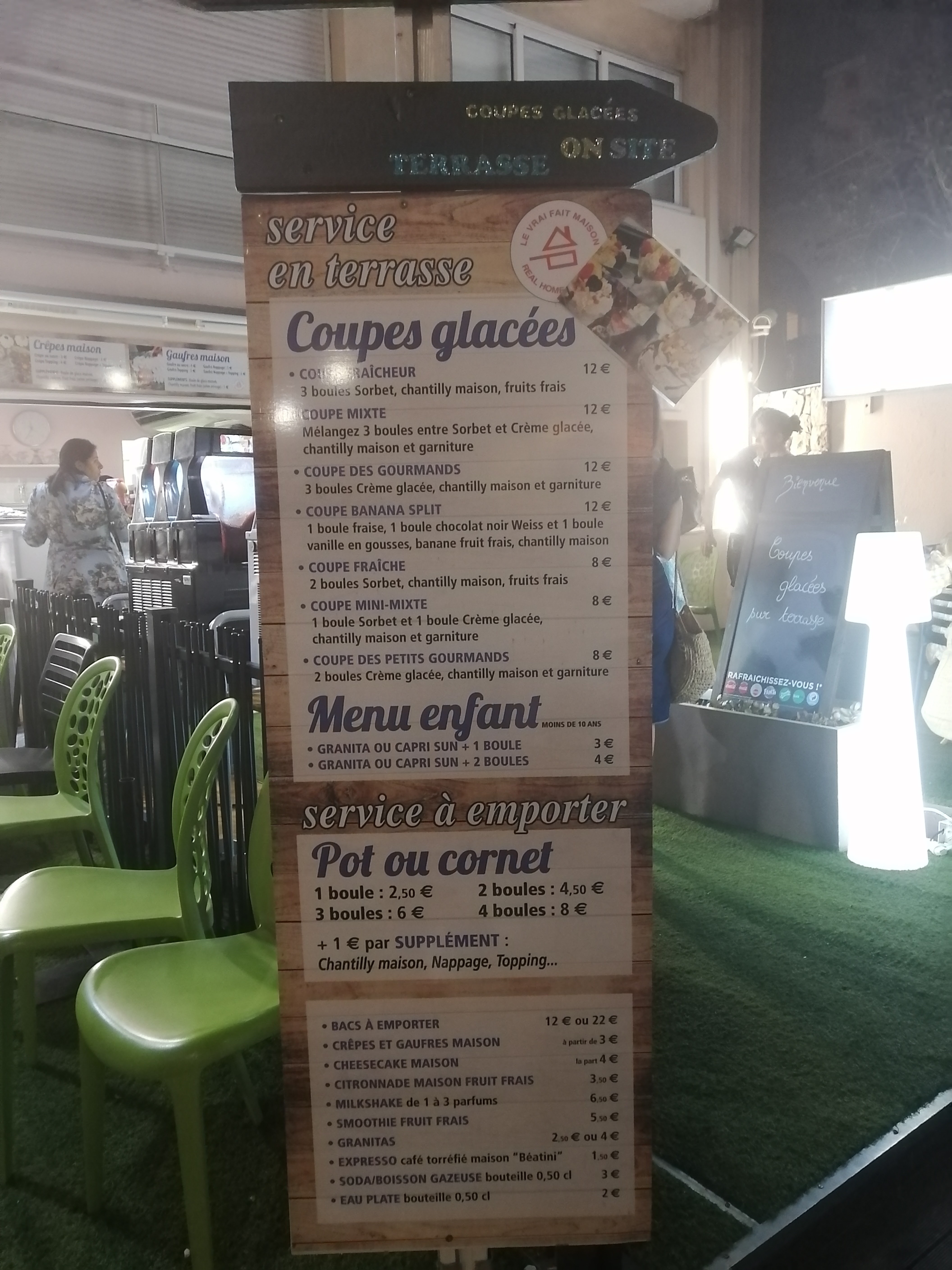 Les glaces et le service sont très bien, beaucoup de choix. 3euros la boule, je la trouve un peu petite mais bonne