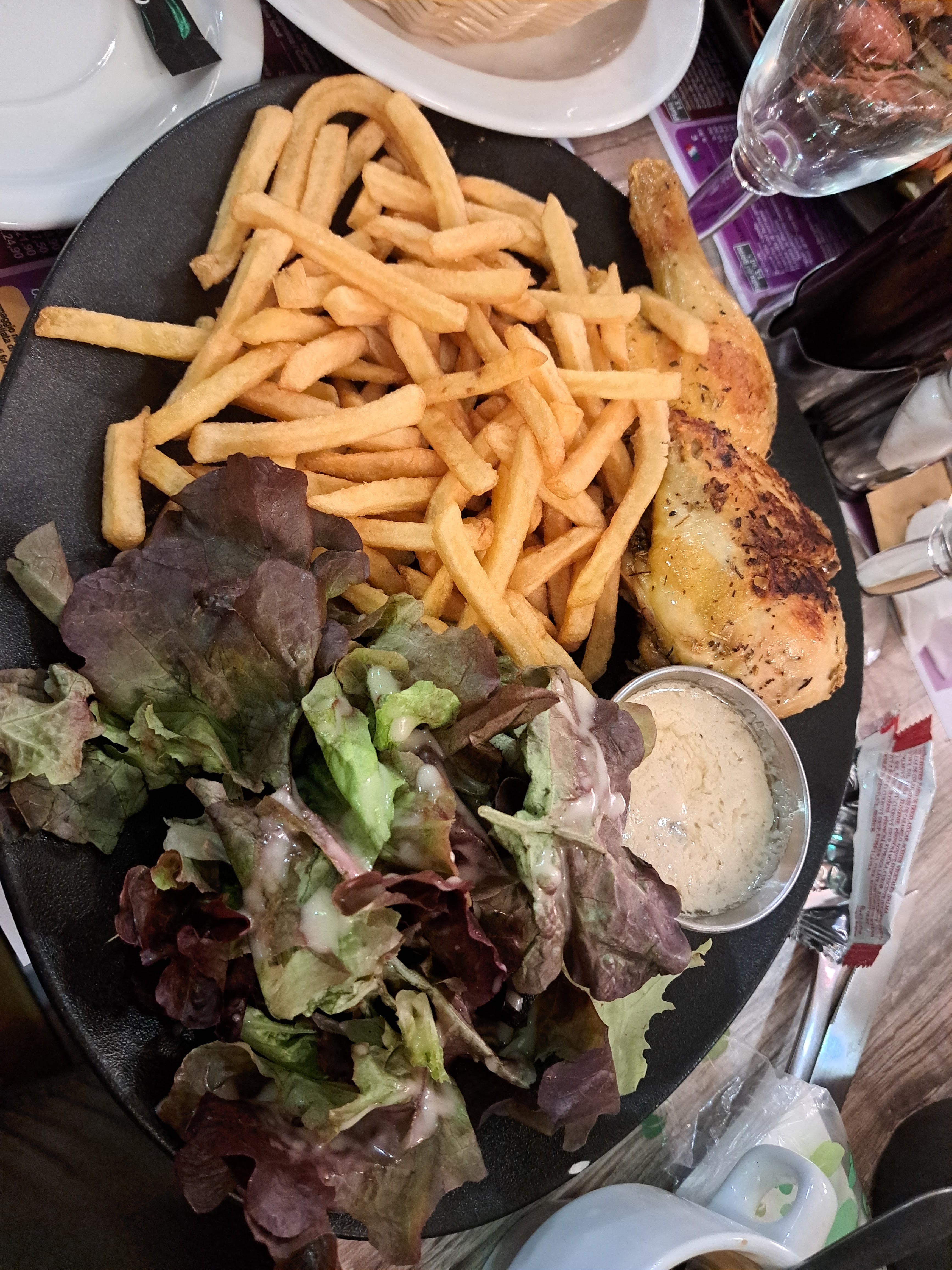 Repas basique, simple, rien d'exellent. Poulet sec, sauce mise sur le poulet or je n'ai rien demandé et j'aime pas la sauce. Pas beaucoup de frites, à la limite de l'abus sur la quantité. Cela ne nous à pas donner envie de prendre 1 dessert. Pas cool les personnes qui fume à côté de vous, sur la terrasse couverte (pluie) Le personnel est sympathique.