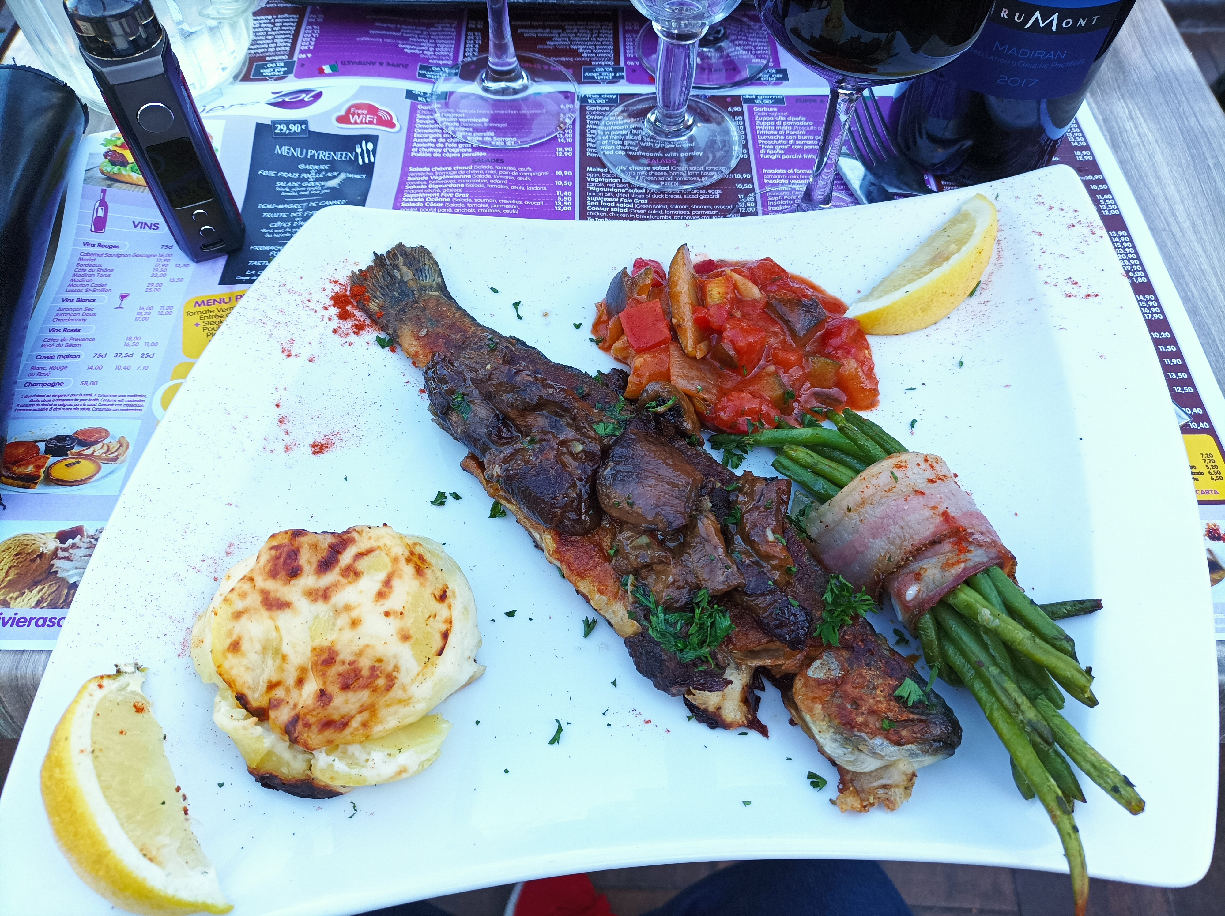 Difficile de trouver un restaurant ouvert après 20h sur Lourdes… celui-ci nous a accueilli chaleureusement et nous avons mangé au bord de l’eau sur la terrasse. Bon repas mise à part la cuisson de mon magret qui a demandé un aller-retour en cuisine et une truite qui aurait mérité une sauce. Très bon service à part ça.