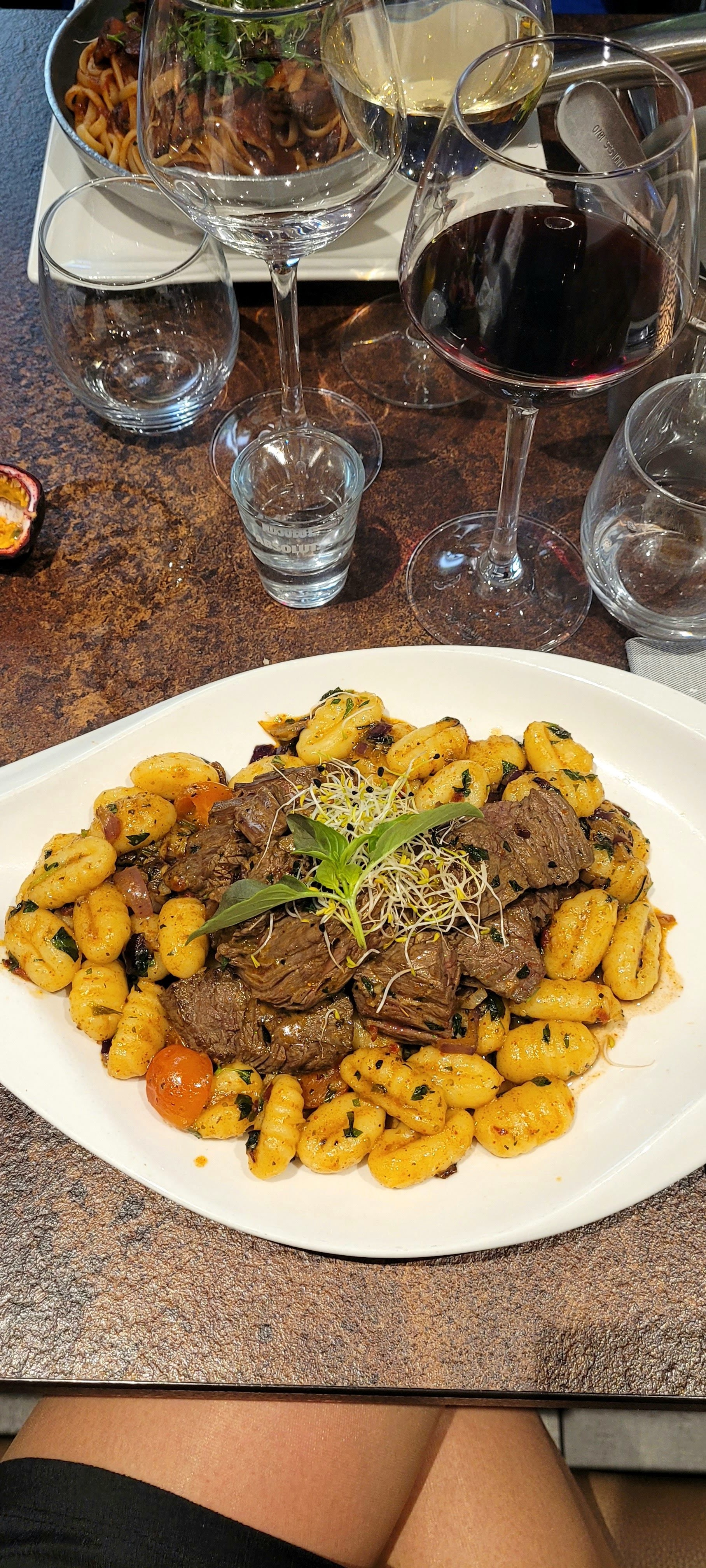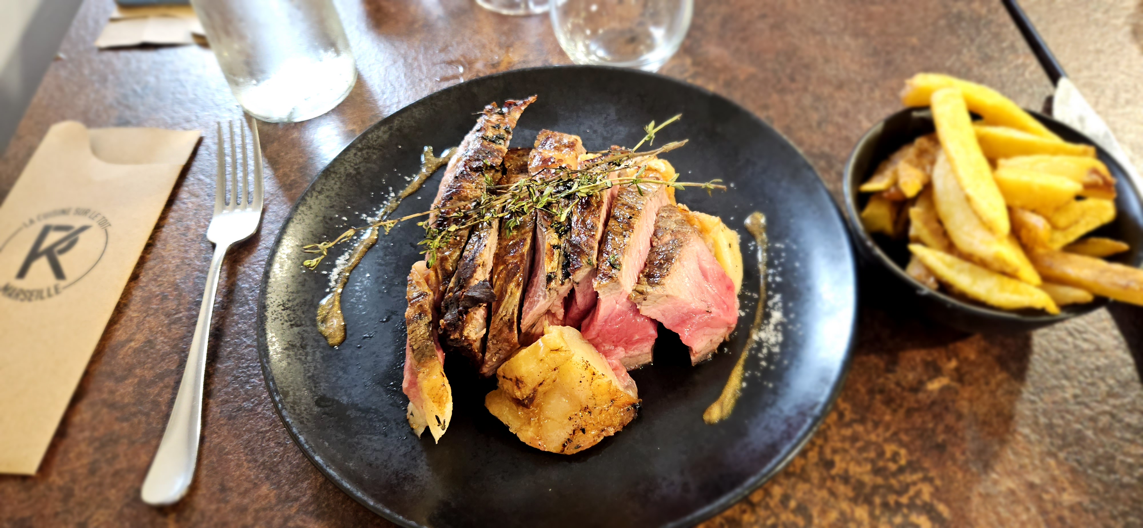 Surprenant !! Terrasse aménagée sur les toits, très moderne. Des viandes d'exception, des plats cuisinés et bien assaisonnés, des desserts généreux. Personnel attentionné ( proposition d'un plaid pour les femmes car du vent ce soir là), digestif offert. Merci beaucoup