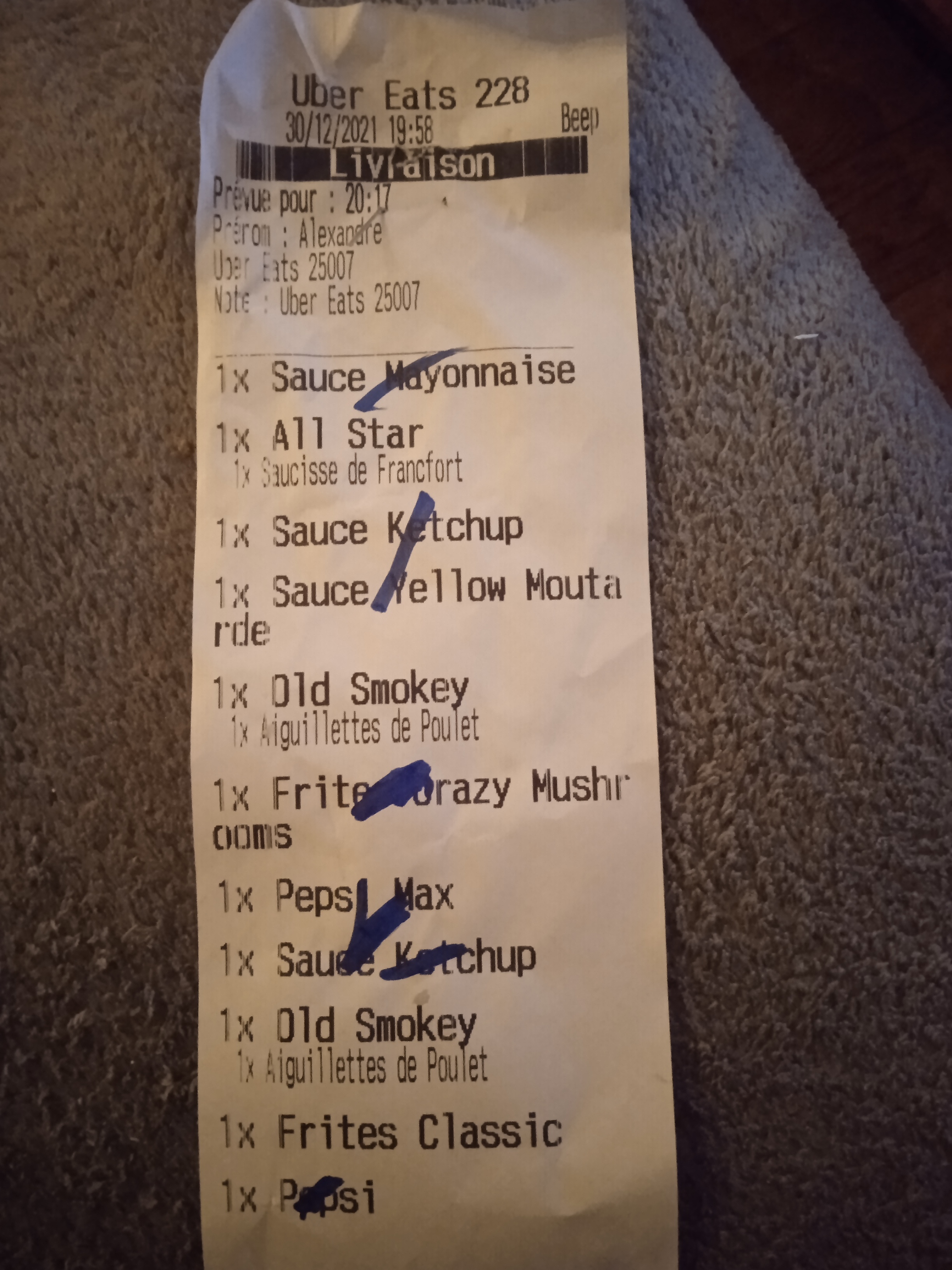 Commande en livraison le 30 décembre à 20h. Manque une frite, le burger est complètement écrasé. Deuxième fois que la livraison arrive incomplète (sauces commandées sur la commande précédente). En restaurant , au vu de l'état de ma commande, le plat serait retourné en cuisine. Le principe de cocher au fur et à mesure de la commande est visiblement a revoir, puisque la frite absente n'est pas cochée... Une chance que nous ayons eut nos burgers d'ailleurs ! La commande est arrivée avec 25 minutes d'avance. Il serait sans doute plus judicieux de prendre plus de temps à la préparation. Sac bien fermé, le livreur n'a pas fait de détour et n'a livré que cette commande dans un sac Uber, rien à redire sur la livraison. Restaurant que nous apprécions auparavant en livraison comme sur place, mais que nous remplaceront à l'avenir au vu des prestations en déclin.