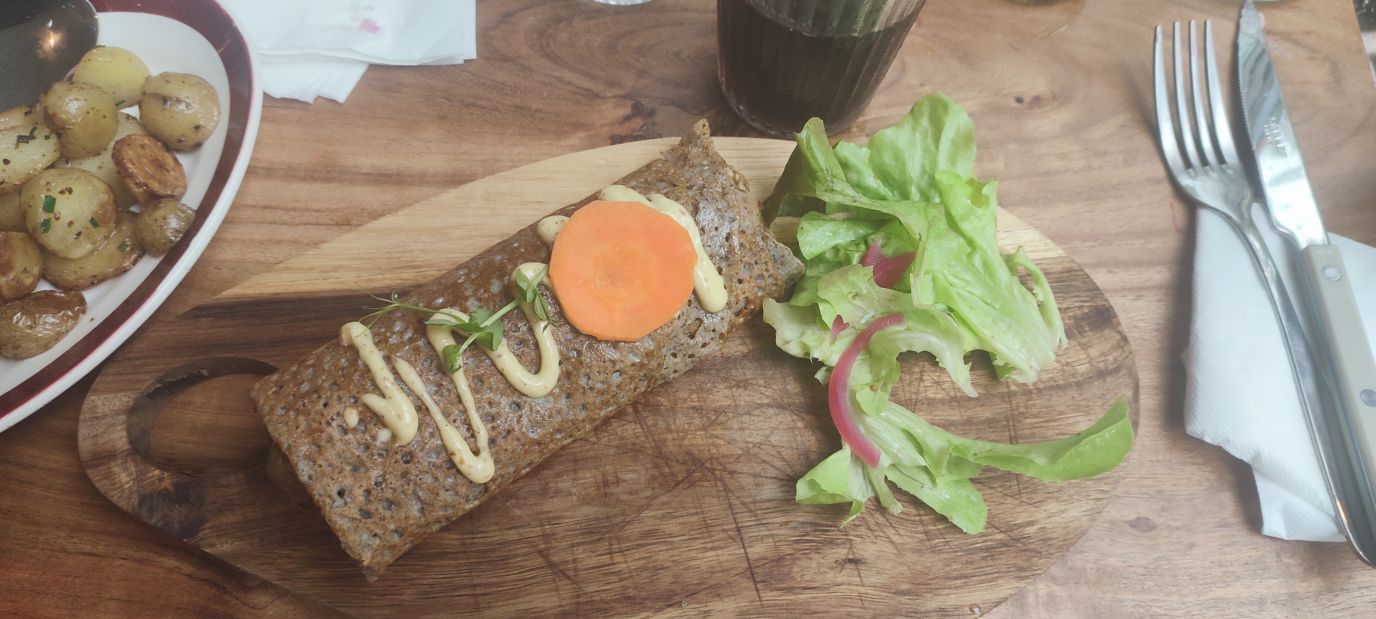 Belle expérience de passage à Rennes en fin de notre séjour. Dans une petite rue en retrait. Cadre agréable pour se retrouver entre amis (table adaptée, quel que soit le nombre), service effectué par des personnes jeunes et fort sympathiques, et la cuisine a du goût. Nous avons forcément testé cette robiquette qui a donné son nom à ce lieu, une galette saucisse revisitée qui s'est avérée être une belle réussite. Mais aussi le poisson du jour (lieu jaune pour l'occasion) accompagné de son risotto de sarrasin : là aussi, convaincus. Tout comme par le dessert crumble pommes /sarrasin. Pour ne rien gâcher, les tarifs sont raisonnables. A recommander donc les yeux fermés.