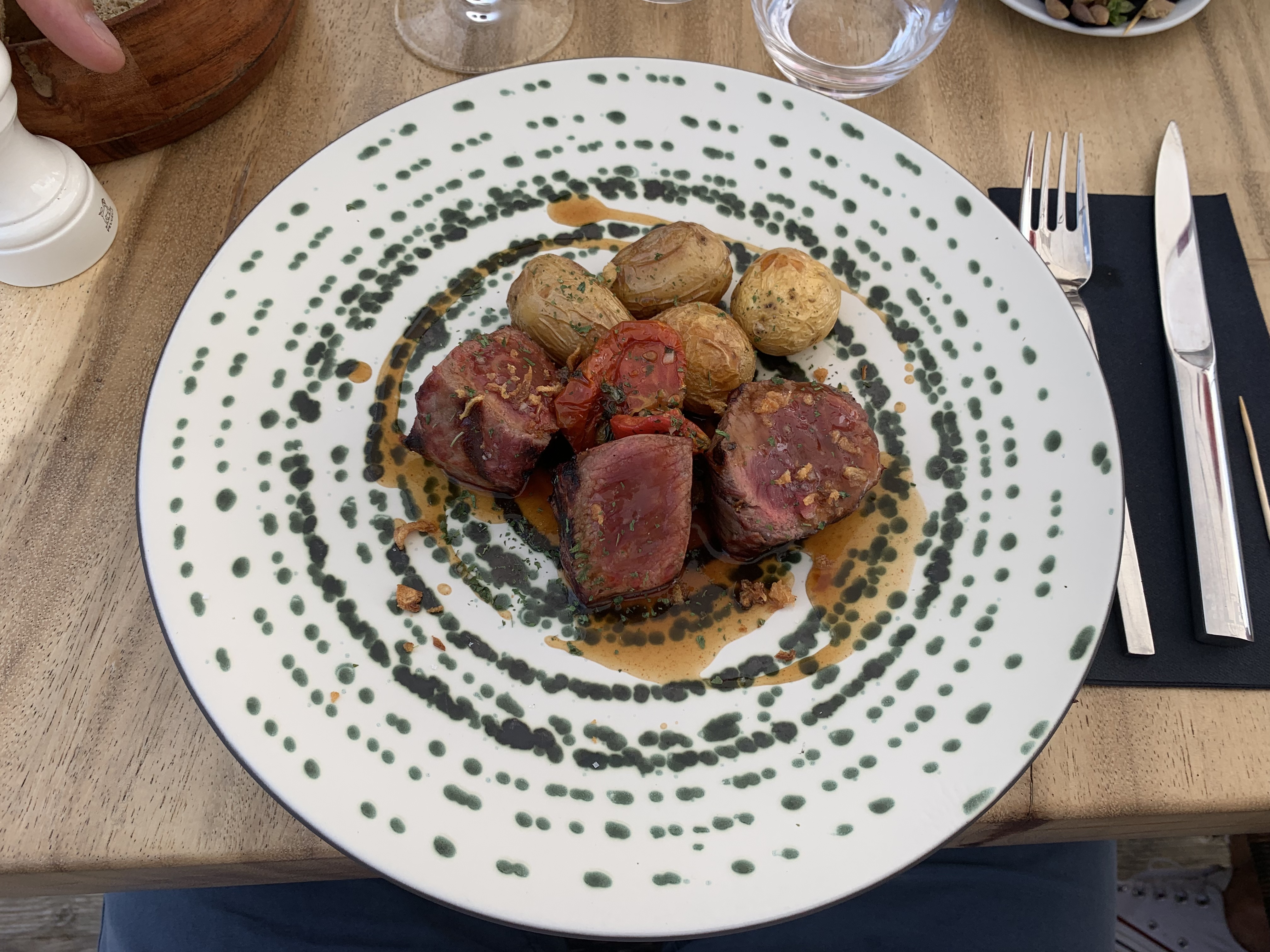 Très bel endroit, décoré avec beaucoup d'élégance. Le personnel est très pro, souriant et aux petits soins. Les mets cuisinés avec originalité. Une petite tentacule de plus pour le poulpe aurait été appréciée... Pour ma part, je n'ai pas aimé le tiramisu : trop de crème, pas assez de biscuit et trop d'alcool. Une inquiétude quant à la santé des serveurs et serveuses à la fin de la saison : le service se fait sur d'énormes plateaux ovales sur lesquels ils disposent tous les plats d'une même table et qu'ils portent sur l'épaule, le dos totalement vrillé !
