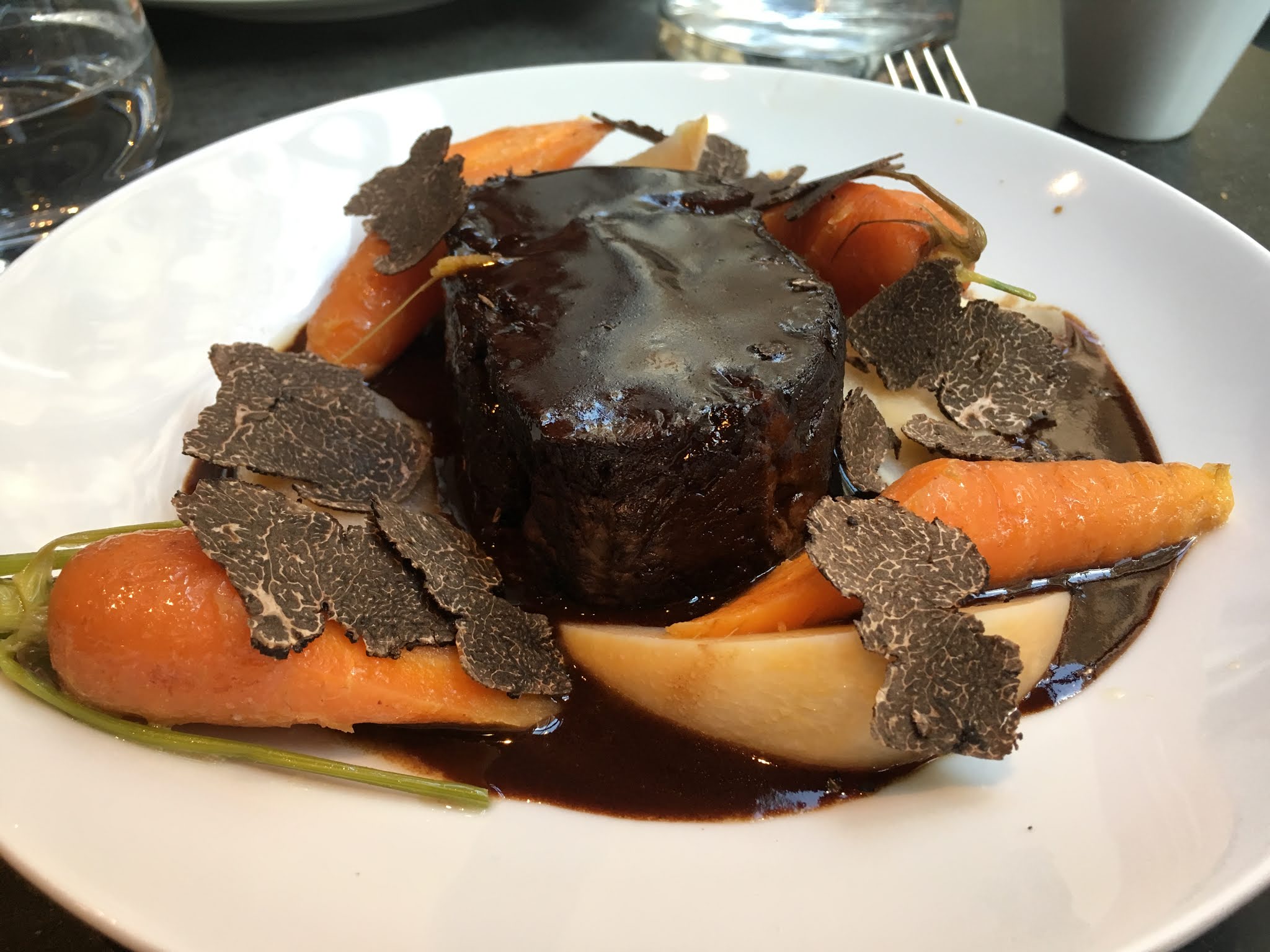 Je déconseille. Entrée: le carpaccio de pied du cochon, c’était bon Plat: filet de boeuf, je n’ai pas réussi à l’avaler, j’ai jamais goûté une piece de viande aussi pire que cella. J’ai laissé mon plat et j’étais tellement dégoûté que j’ai perdu mon appétit. Mes amis ont goûté cette viande et ont remarqué le goût bizarre aussi. Le chef a dit qu’il ne comprenait pas pourquoi ma pièce n’est pas bonne… mais il va quand même me faire un geste… le geste fait? Rien du tout. Dessert: figues rôties, rien d’excellent, ça ne te fait pas rêver. Sur la même table il y a des gens qui ont apprécié leur repas et des gens qui ont détesté. Je pense alors que ça va dépendre de votre choix ;)