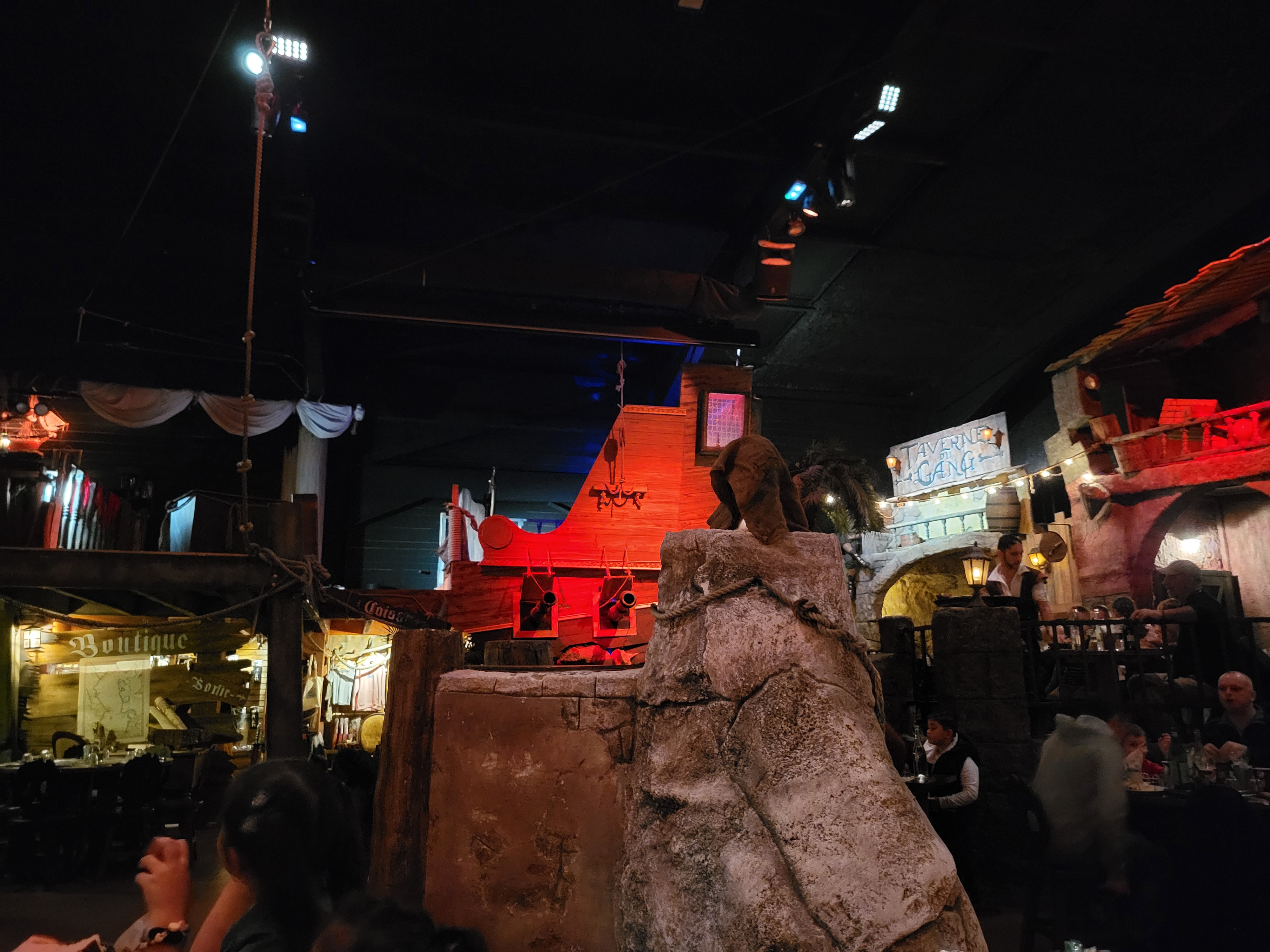 Le décor et l'ambiance sont originales, les jeunes adoreront. Tout est axé sur le thème des pirates niveau décor et tenue du personnel. Un spectacle est donné à heures précises si il y a assez de monde. Il s'agit en gros d'une jouxte entre 2 pirates joué par 2 membres du personnel, avec effets sonores et visuels, c'est plutôt sympa. Question menu, il n'y a rien de grandiose, ce n'est pas un 3 étoiles. La carte est simple tout comme la qualité des plats. L'expérience n'est donc pas gustative mais bien visuel avec le lieu.