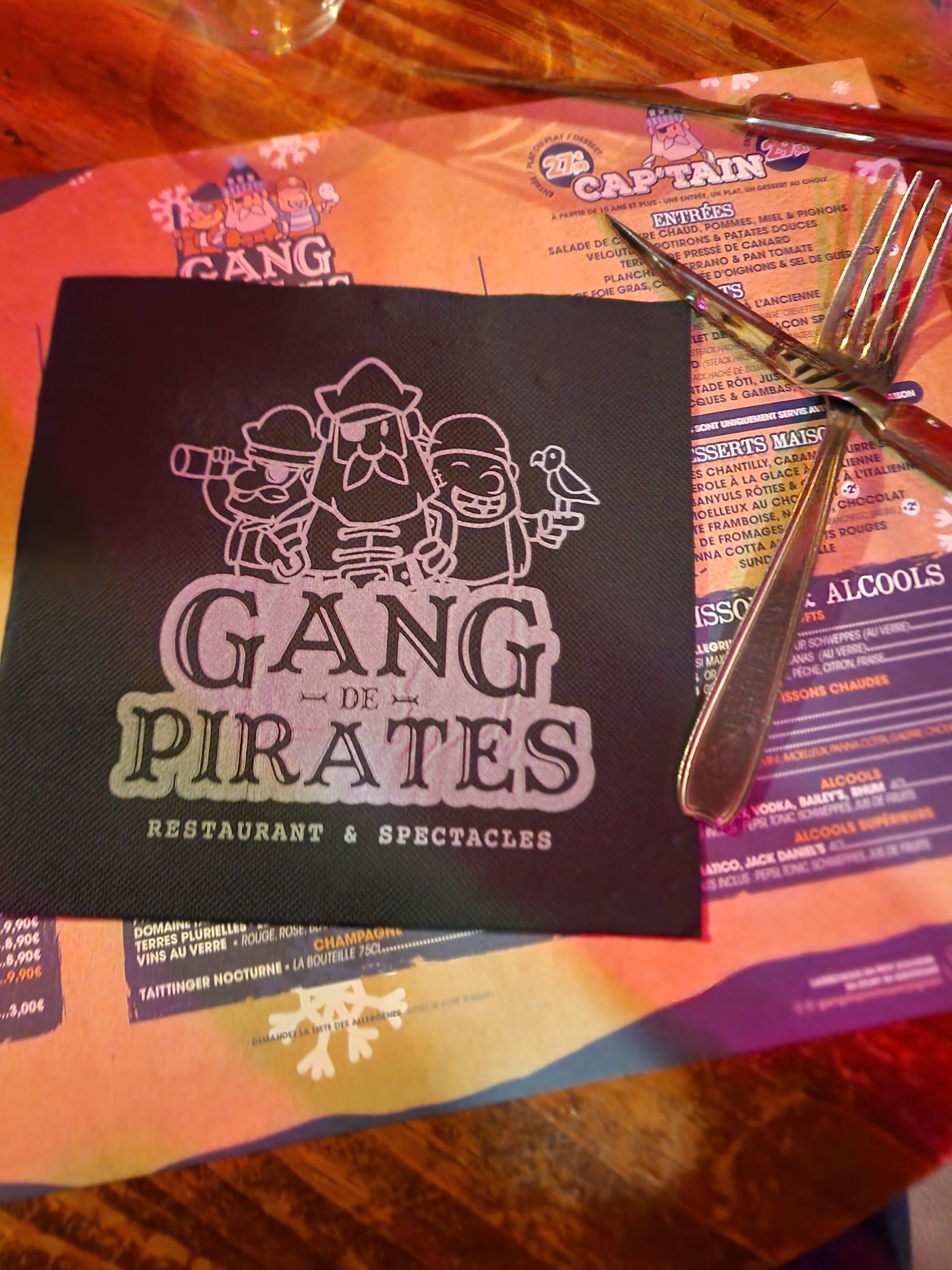 Avis mitigé. Le service rien à dire. Les serveurs[es] sont dynamiques très serviables. Par contre on a trouvé le spectacle un peu violent pour un enfant de 3 ans. ( coup d'épée - bagarre -grosse pointe sous le coup) difficile pour eux de comprendre qu'il ne faut pas taper ou se bagarrer et de faire la différence avec une show. Le spectacle peut être tourné sur le trésor, la découverte par exemple. La formule unique entrée plat dessert à 40 euros est justifiée car belle présentation des assiettes, c'etait bon et ça comprend le spectacle qui dure environ 20 minutes. Dommage pour les suppléments.. Bravo à l'équipe de manière général.