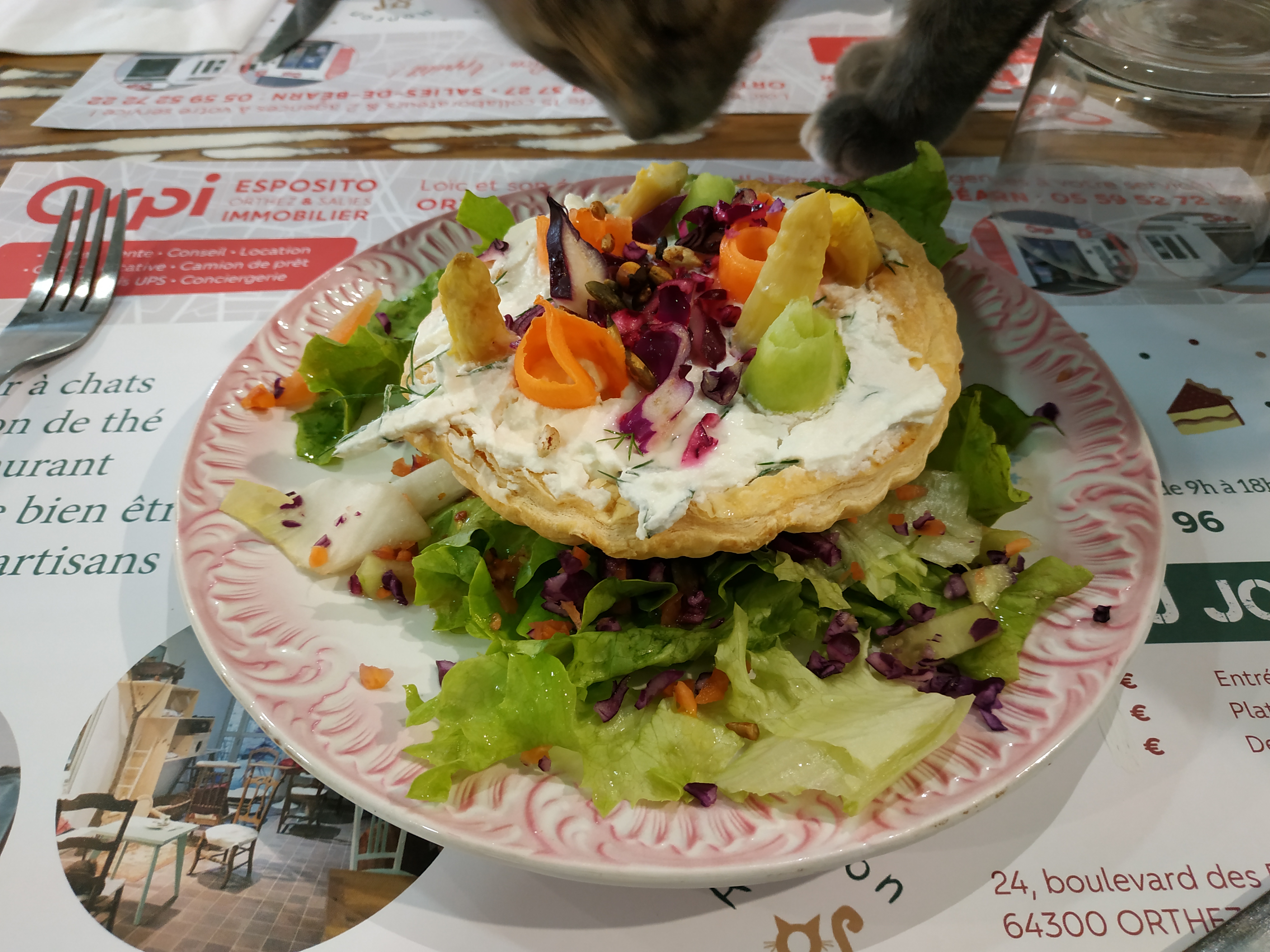 Accueil très sympa. Le restaurant est très propre même avec nos amis les chats. Vous pouvez également demander à manger sans avoir les chats. Tout est fait maison. Pensez à réserver et commander votre plat pendant votre réservation. Nous avons pu manger dans le salon et côtoyer les chats de l'association Patounes de chat de sauveterre, et qui sont à l'adoption. Nous avons passé un agréable moment dans un cadre convivial et reposant. Il y a également une galerie composée d'exposition vente, d'un coiffeur de produits régionaux et de vêtements. A l'étage deux salles sont a disposition de thérapeute ou d'atelier peinture, couture..... et en soirée des conférences ont lieu.