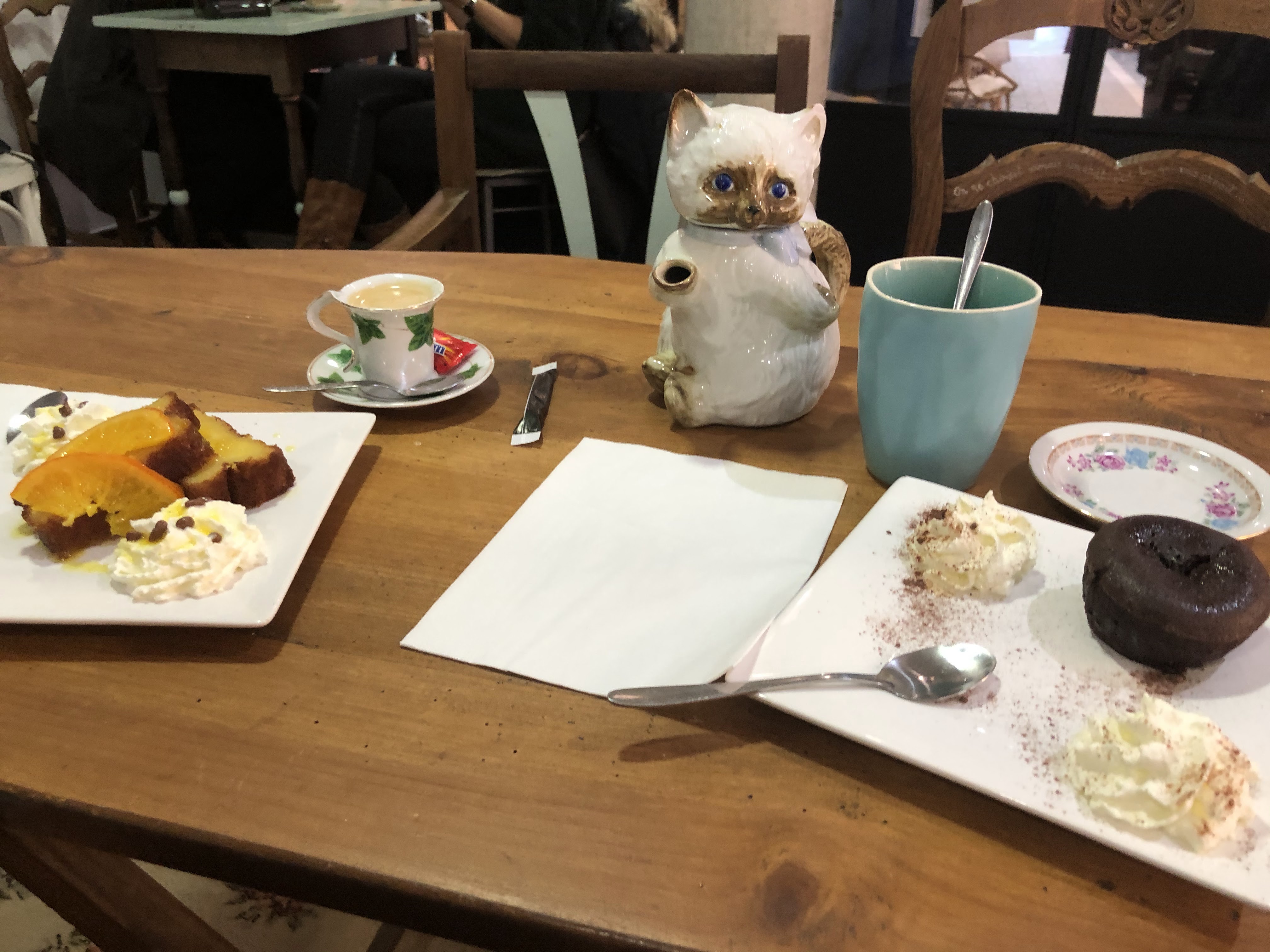 Chaleureux, et pleins de chats ! Les gâteaux sont très bon en prime !
