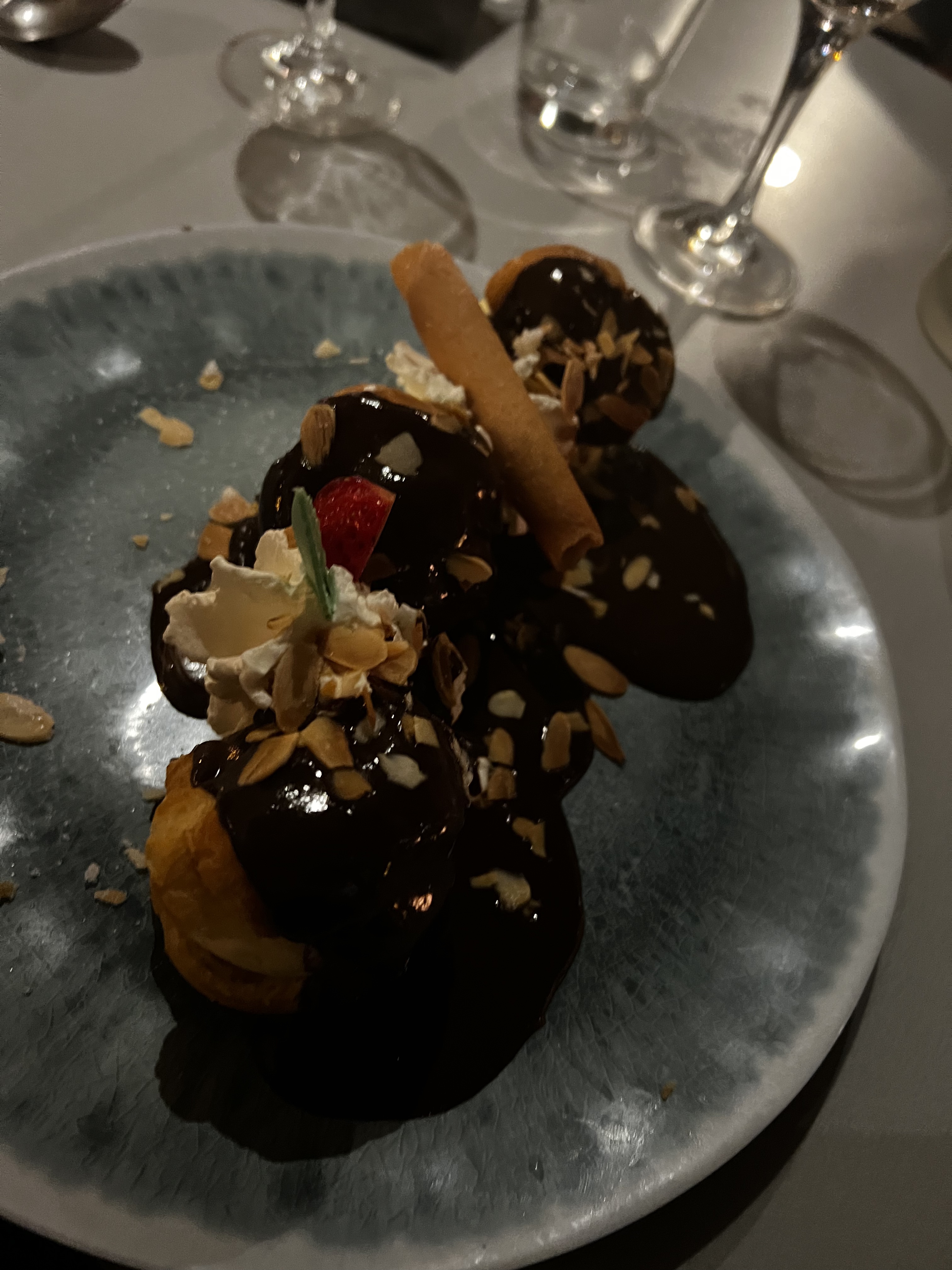 Diner entre collègues, un accueil très agréable, des serveurs et serveuses aux petits soins, et des plats et desserts aussi beaux à regarder qu'à manger ! Rien à redire !! Continuez et félicitations au Chef !