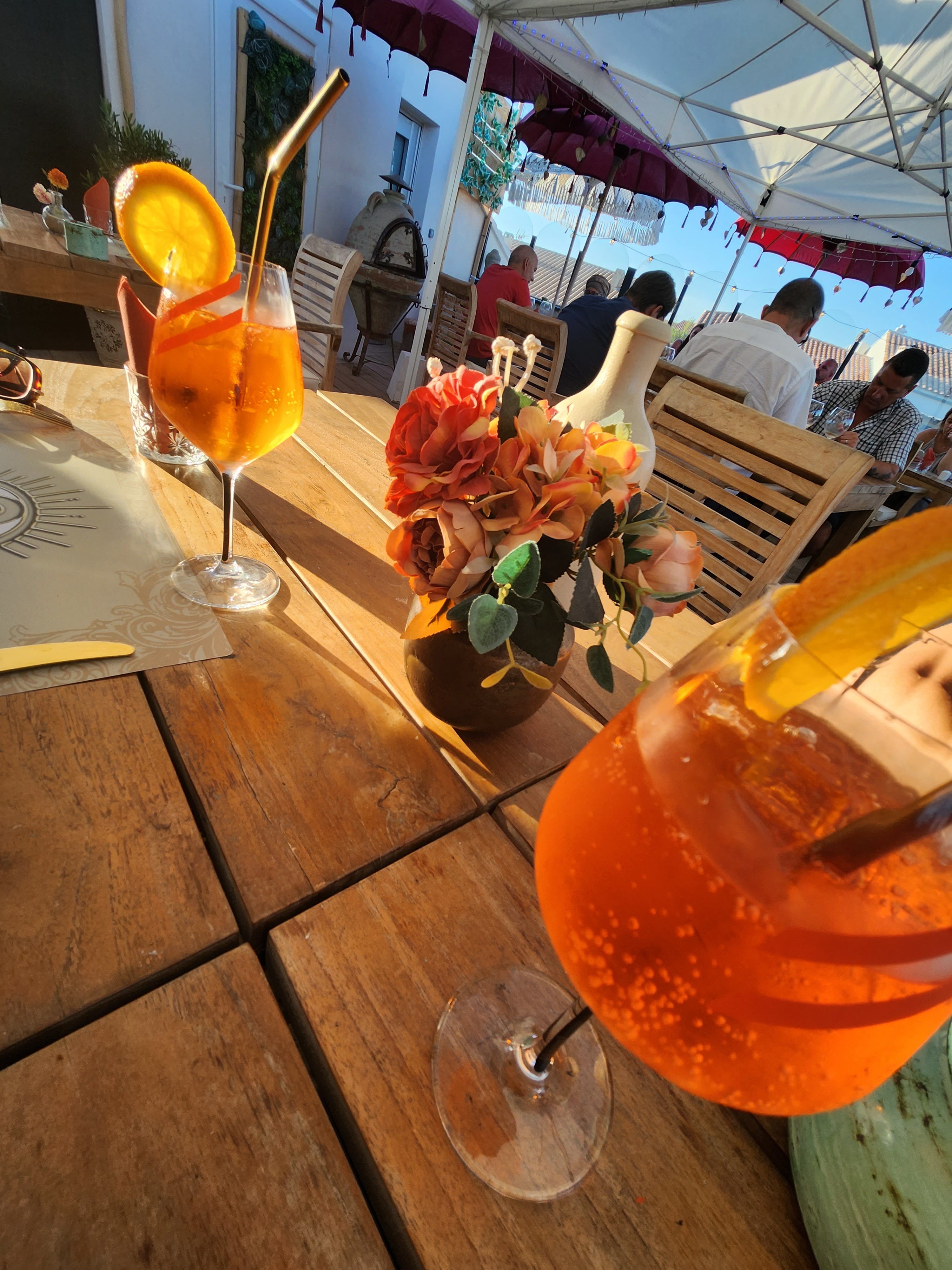 Au court de notre séjour sommes venus boire un apéritif puis fini par de délicieuses pizzas, et goûté un petit rosé local, excellent conseil Le lendemain avons pris notre petit déjeuner au soleil en terrasse face à la mer personnel super accueillant et bon rapport qualité prix, je recommande fortement