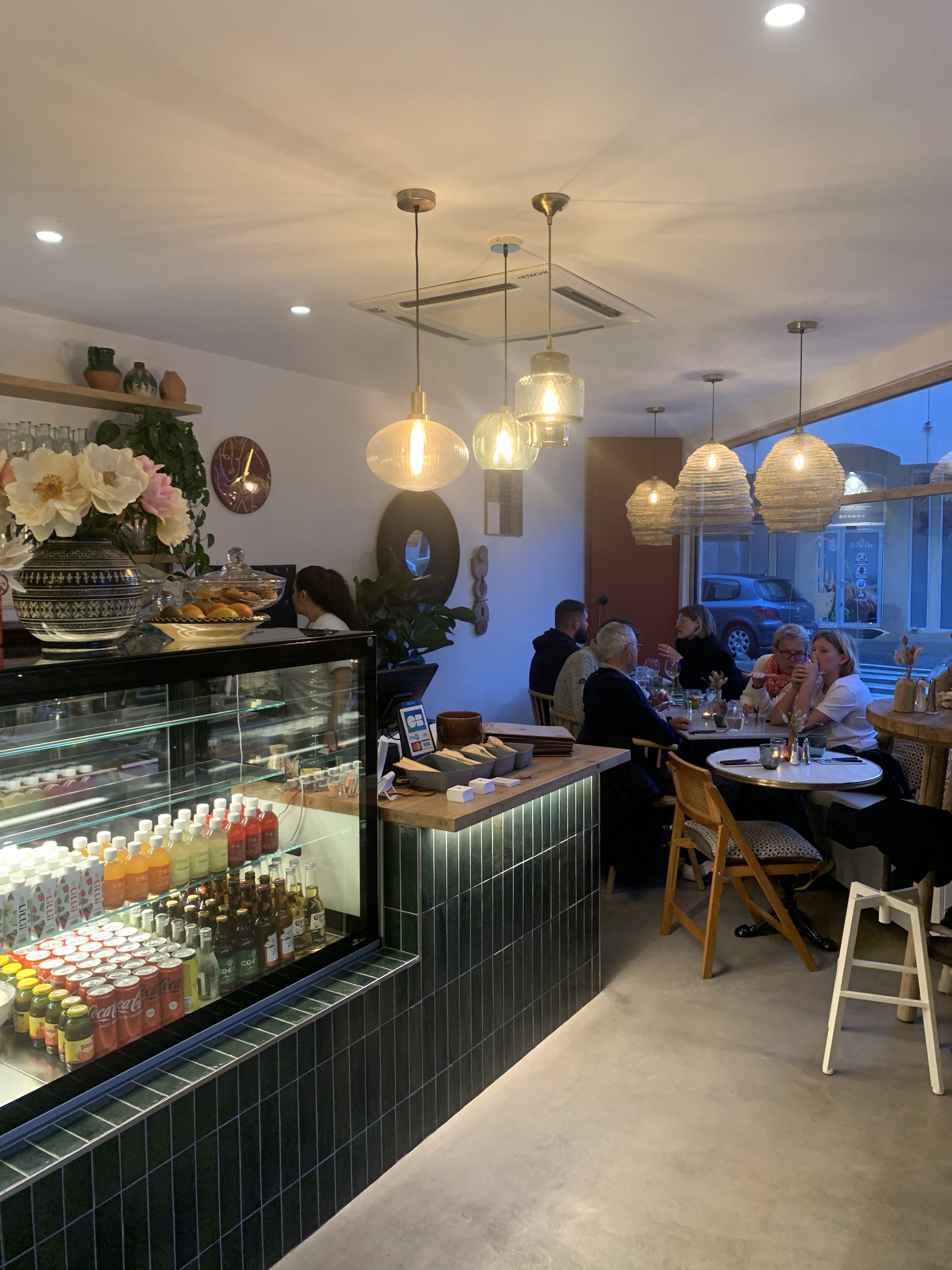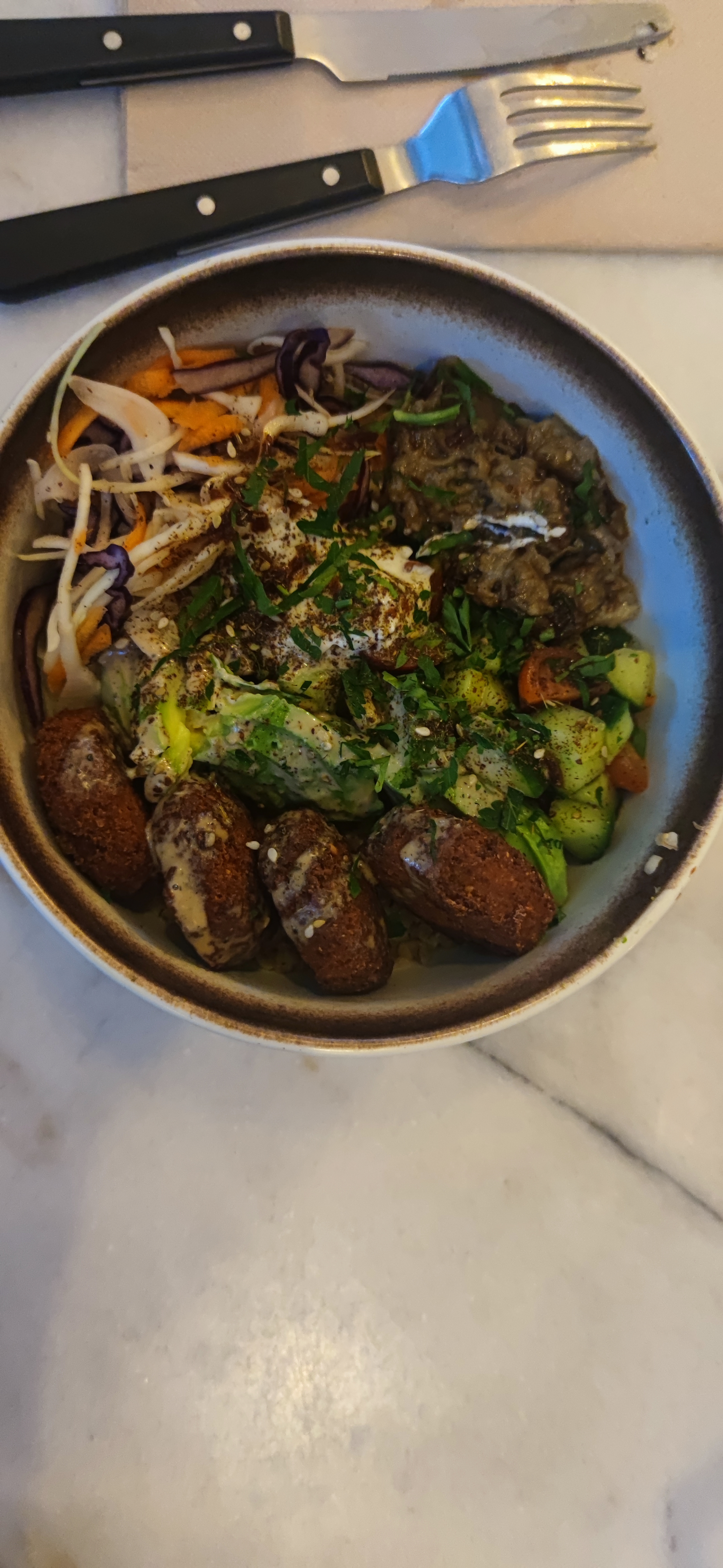 Nourriture délicieuse (végétarienne); personnel super sympa; excellente entrée et bol de falafel en plat principal