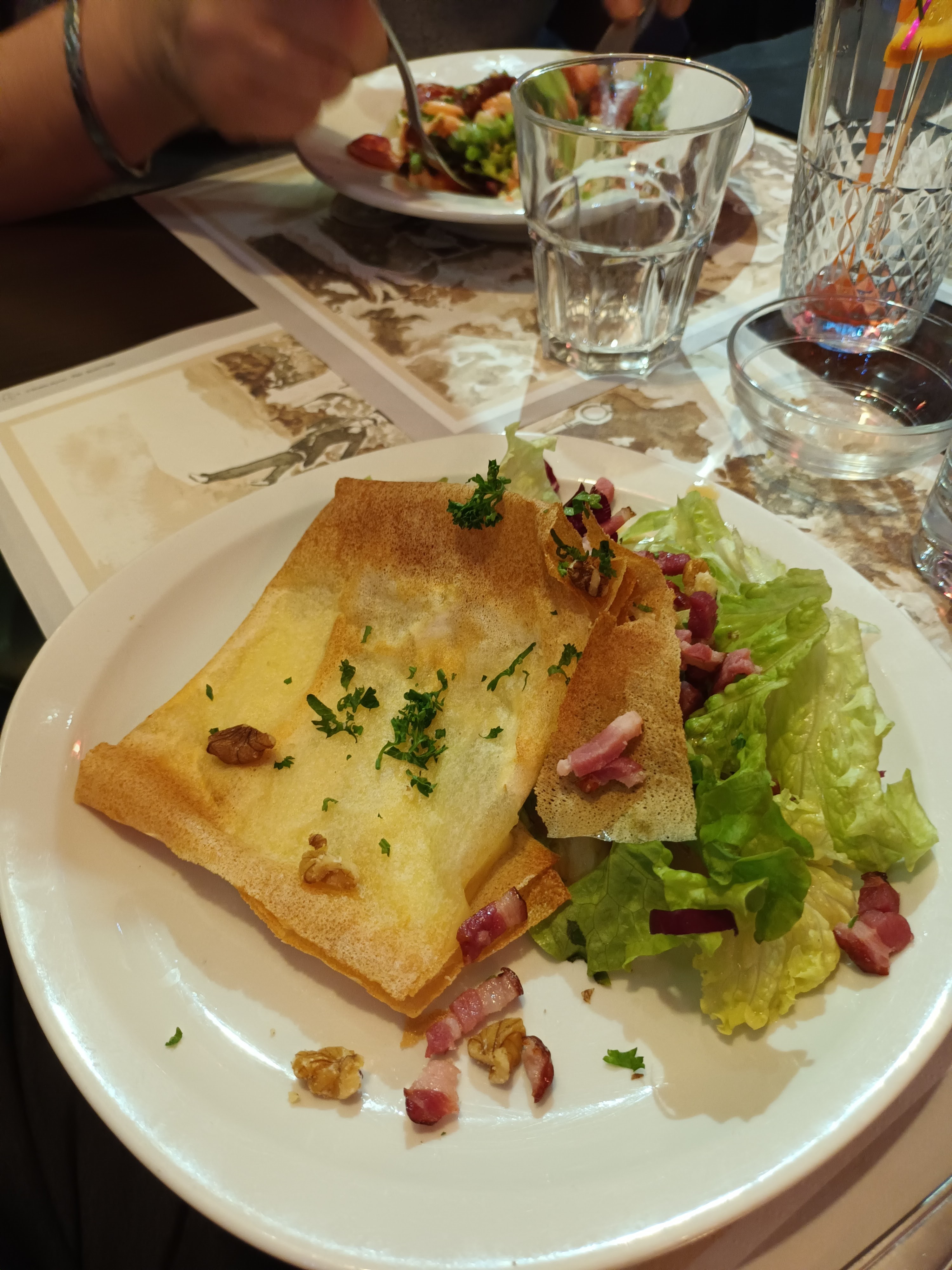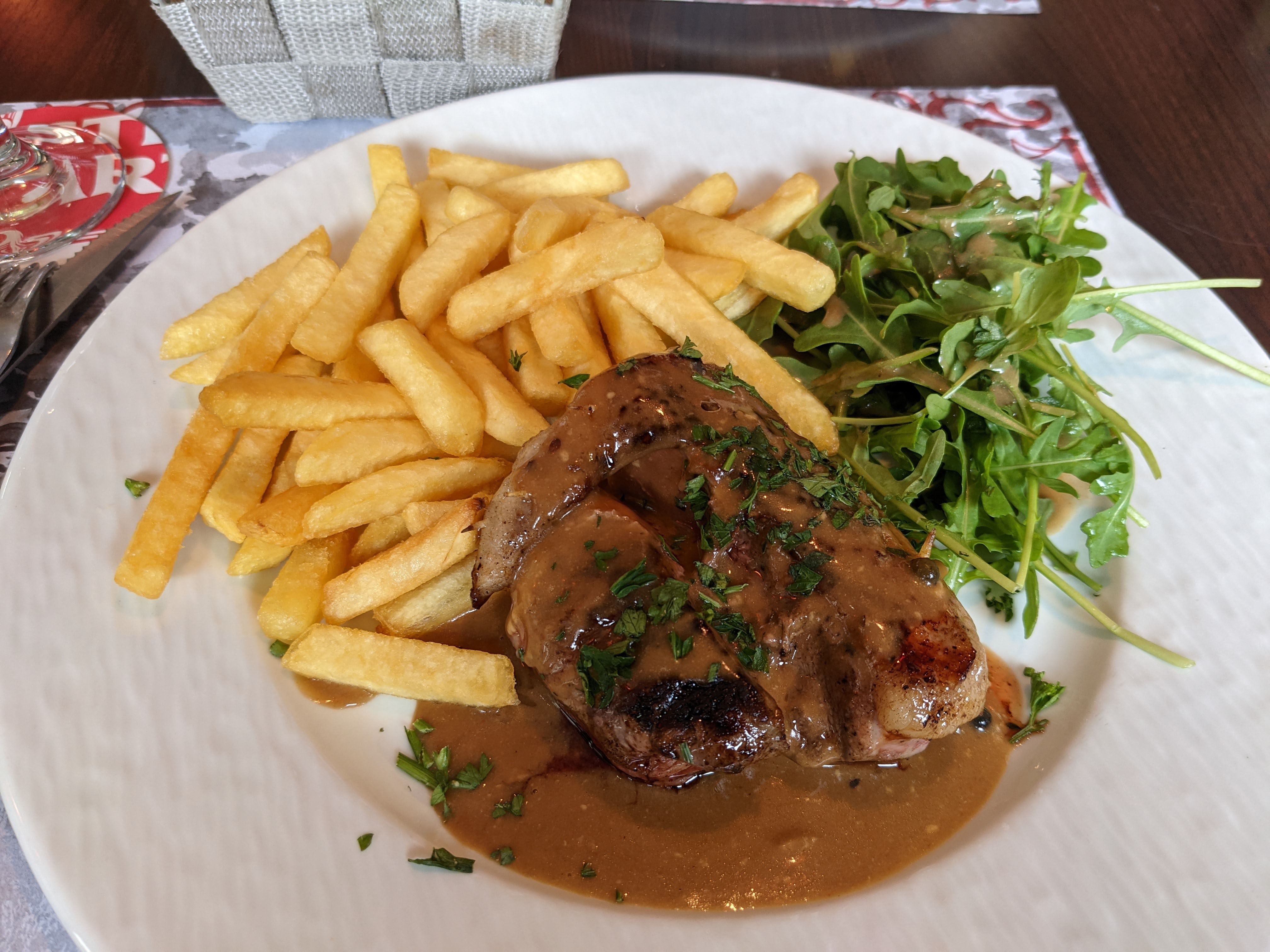 La nourriture était correcte... Mais le principal problème était que les éléments du menu qui nous avaient attirés n'étaient pas disponibles, bien qu'ils aient été répertoriés sur des panneaux spéciaux à l'extérieur et à l'intérieur du restaurant. Mes compétences en français sont passables, mais le propriétaire n'a pas réussi à nous faire comprendre clairement que ce que nous avions commandé serait complètement différent de ce qui devait être livré. L'autre problème pour nous était que le jeune serveur français, bien meilleur en anglais que la dame qui était clairement la patronne, se faisait régulièrement réprimander par la patronne à proximité de la clientèle. Il était en fait bien meilleur en réception et en relations clients que son patron. Quant à l'ambiance... Nous avons créé la nôtre 🙂
