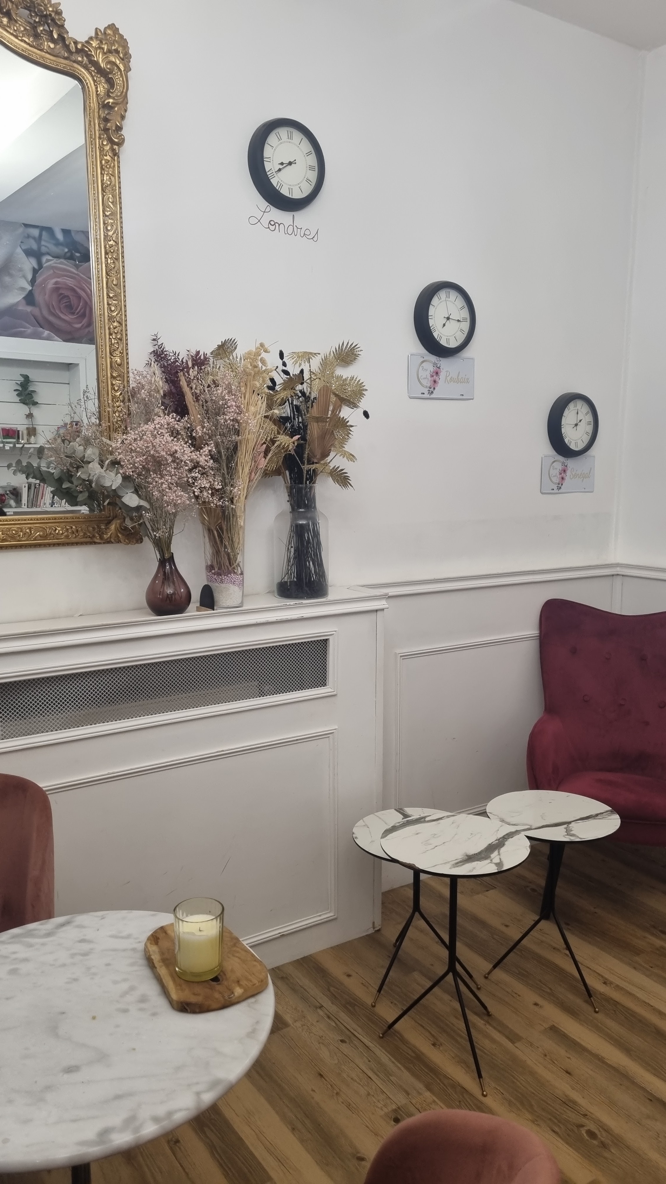 La décoration du salon est très jolie. On s'y sent bien. On est accueilli par une personne très souriante. Les gâteaux ainsi que les boissons sont très bons.