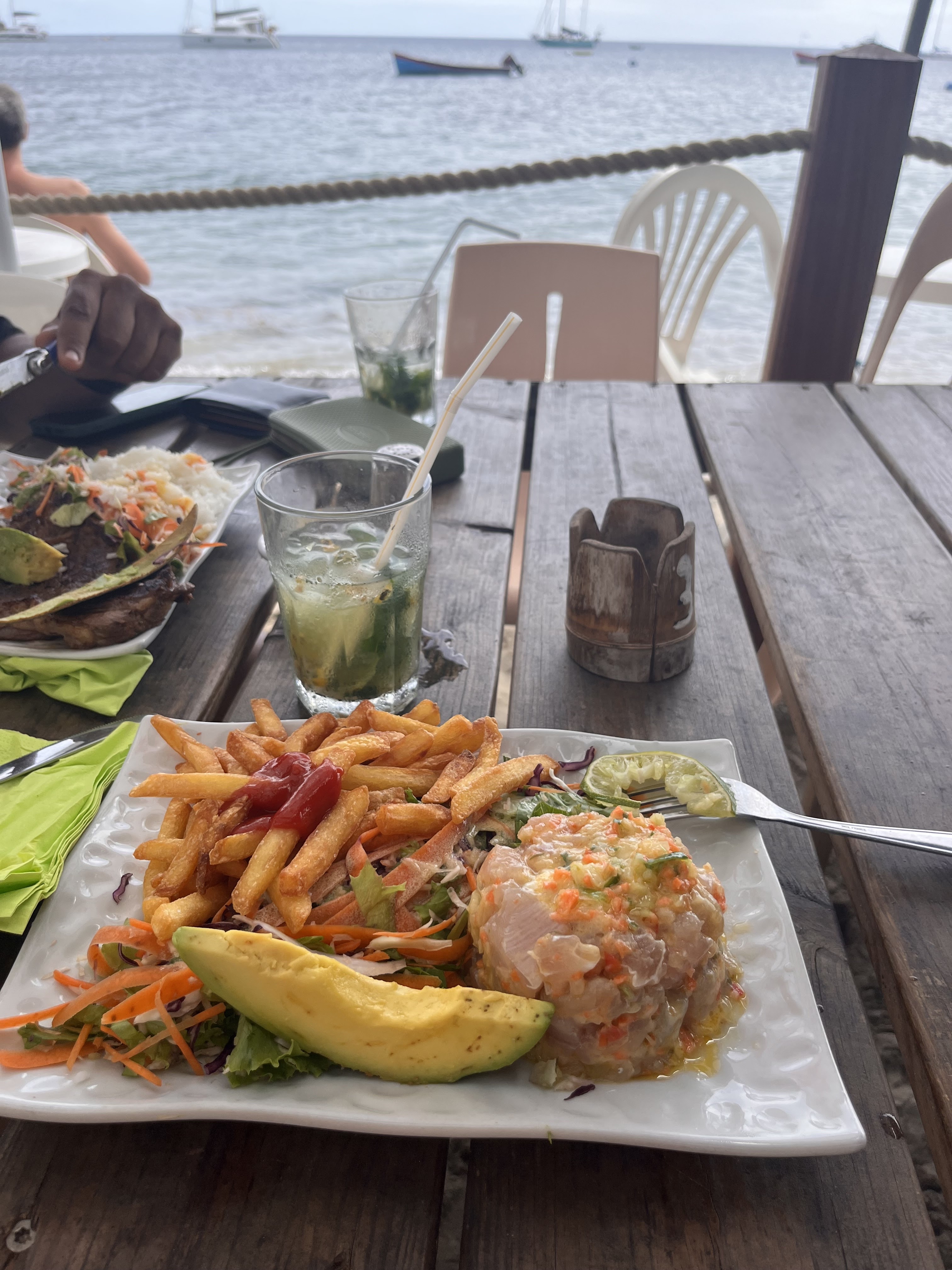 Balaous frits, riz safrané et pina colada très bon et bien servi. Serveur souriant, disponible et au fait de sa carte, nous avons pu déjeuner à 8 alors qu'il était assez tard. Un peu cher mais bon comme partout en Martinique notamment lorsqu'on est les pieds dans le sable sur une magnifique plage avec la mer juste à côté.