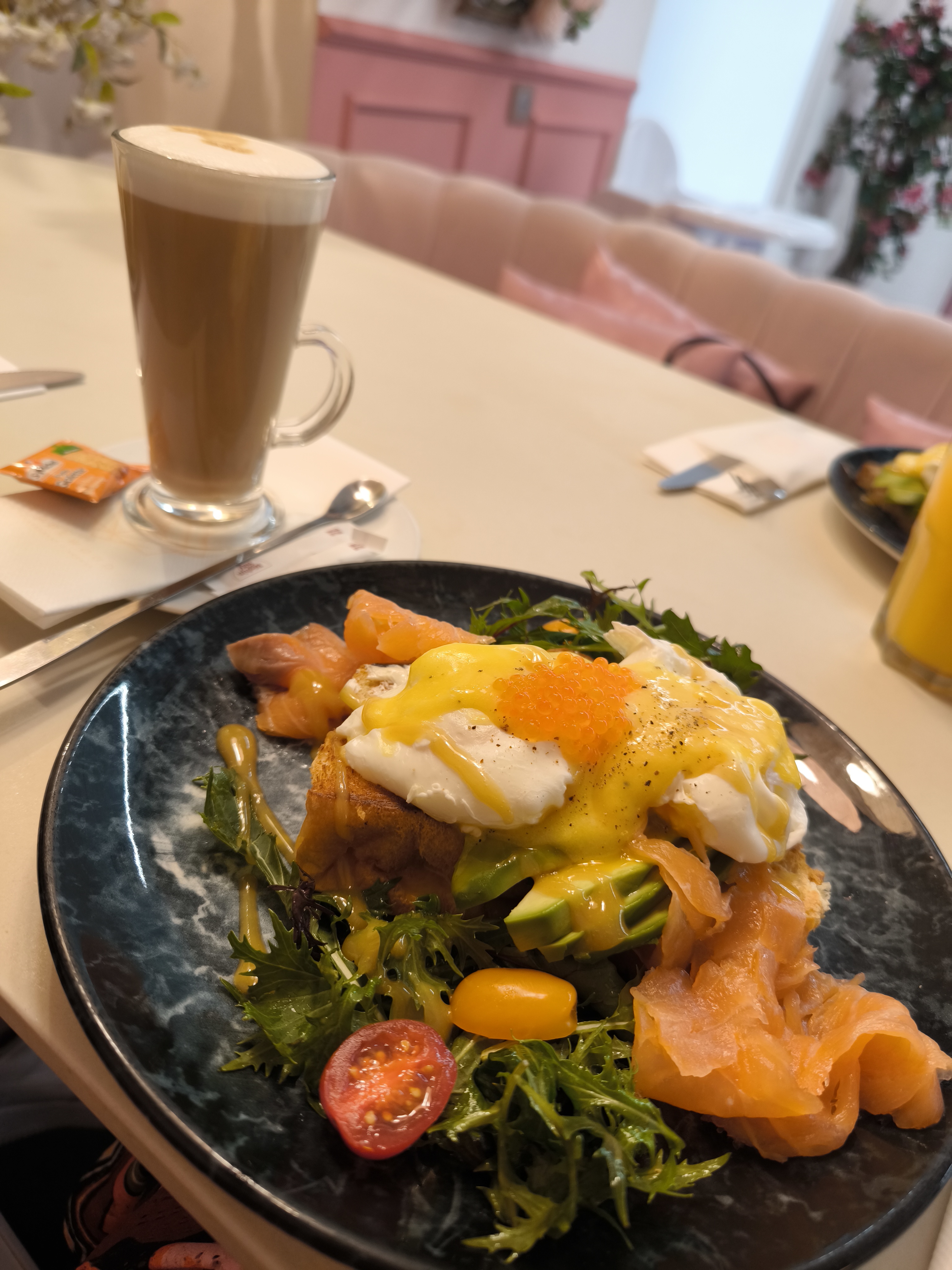 Décoration unique et très girly ! Carte variées et honnêtement tout est bon ! Que ce soit le brunch russe, les pancakes et croissants salés, le burger mais aussi les smoothies frais (mention spéciale pour le vert) Franchement venez vous en serez pas déçu, y’en a pour tout les goûts !