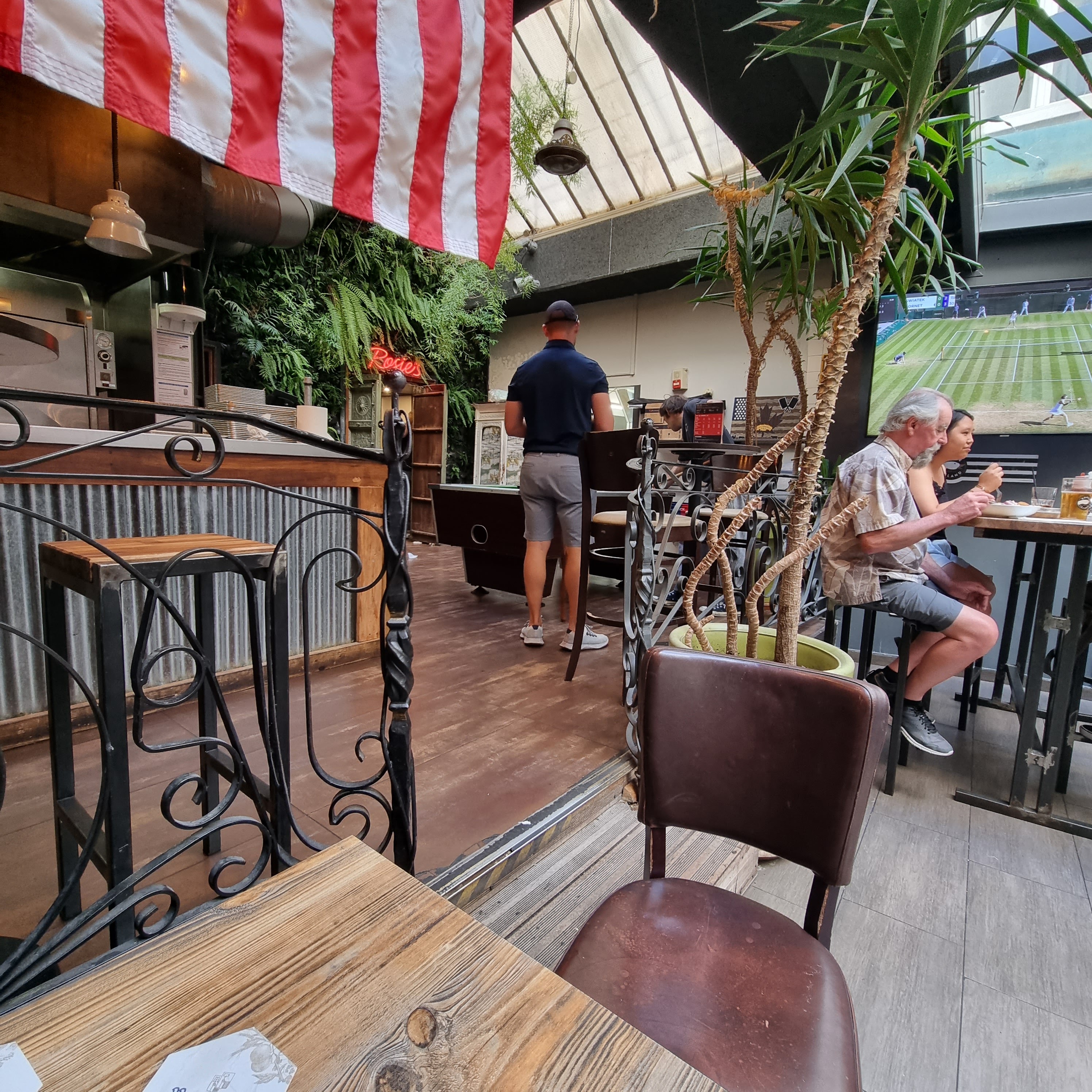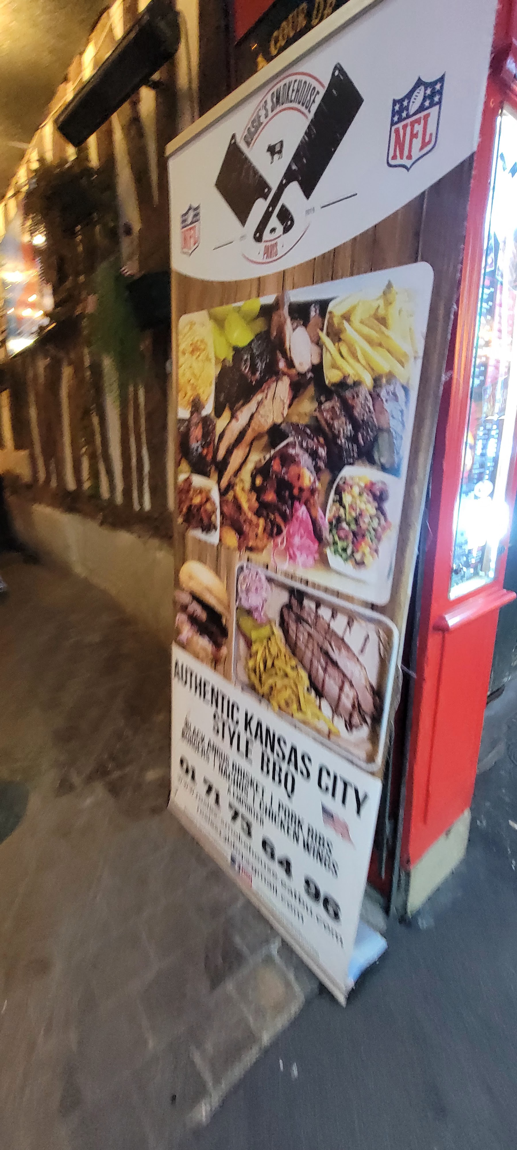 Nouveau bar sportif avec nourriture BBQ/Smokehouse. Service rapide par un personnel attentionné et sympathique. Bonne sélection de cocktails et de bières. 4 étoiles car aujourd'hui, ils ne peuvent afficher qu'un seul match/chaîne sur plusieurs écrans. Apparemment, ce problème sera bientôt résolu avec un nouveau FAI. Propre et lumineux, ambiance agréable.