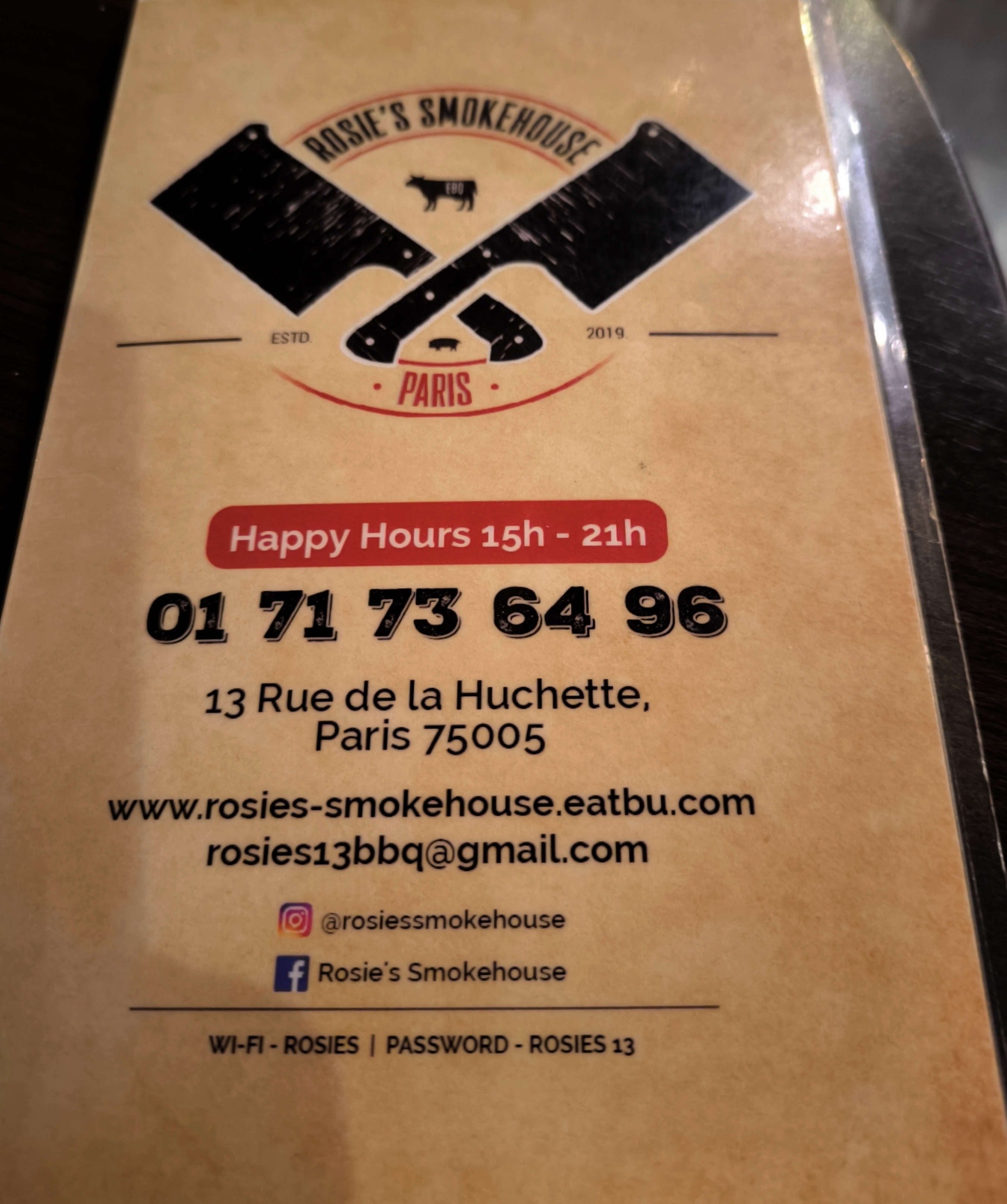 Voici toutes les informations sur le Restaurant Rosie's Smokehouse BBQ qui ce trouve au 13 Rue de la Huchette, 75005 Paris (75). Sur cette fiche vous trouverez les photos, l'adresse, les horaires d'ouverture, le numero de téléphone et les avis clients.Vous pouvez églement rédiger un avis si vous le souhaitez en bas de page.
