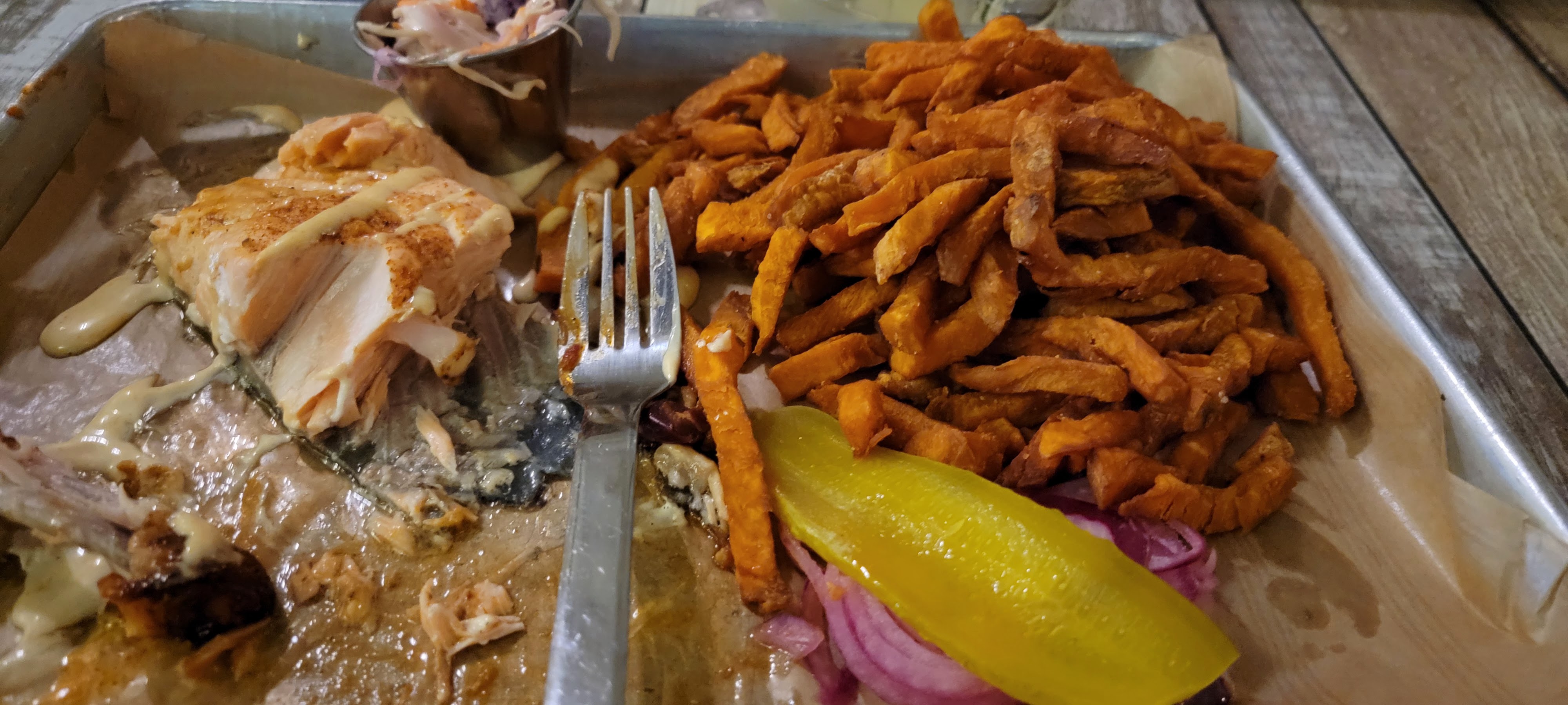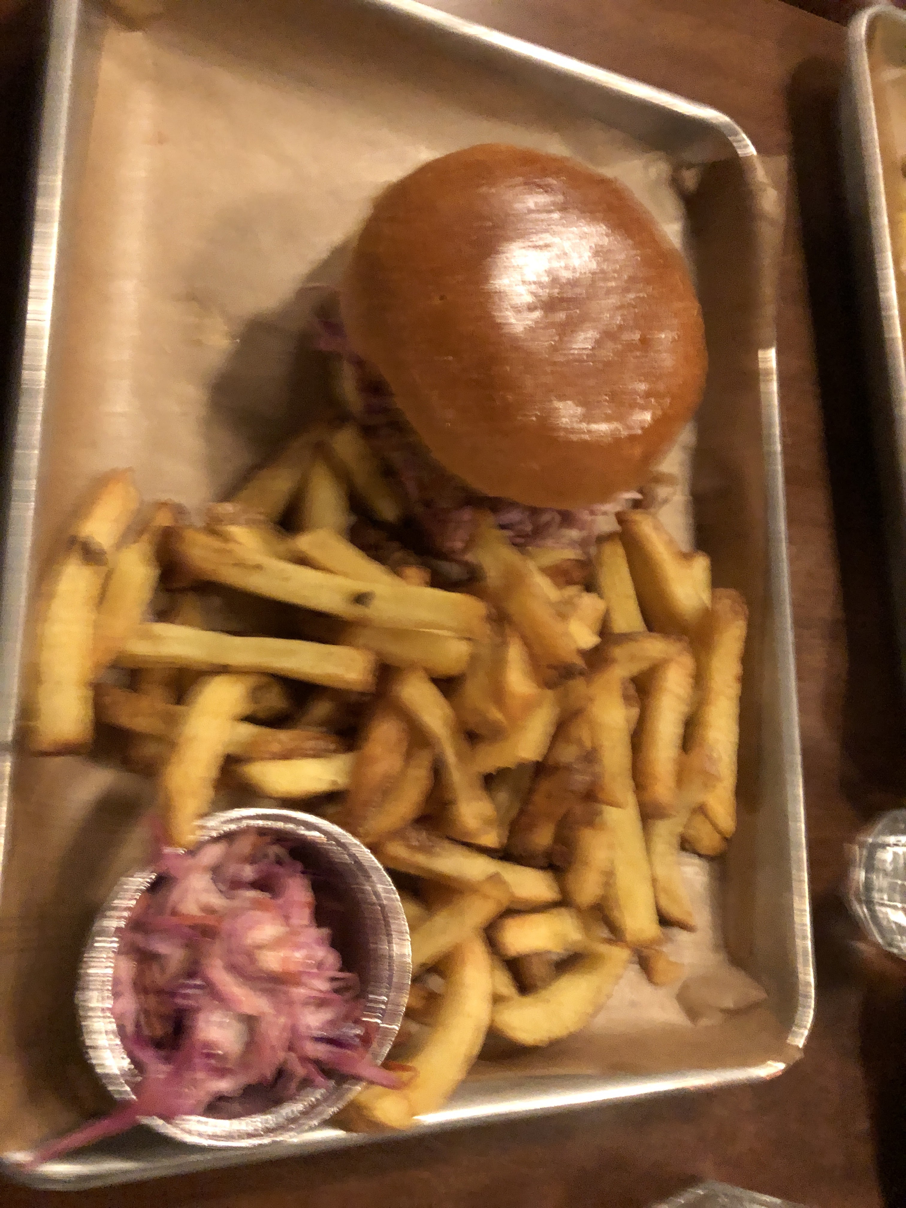 Le porc effiloché ne ressemble à aucun de ceux que j'ai jamais mangé auparavant, et pas dans le bon sens. Il flottait dans cette sauce aqueuse (?). Vraiment difficile de décrire à quel point c'était horrible. Et ils doivent décider si la salade de chou est crémeuse ou vinaigrée… et ne pas faire les deux à la fois. Je ne peux pas recommander cet endroit.