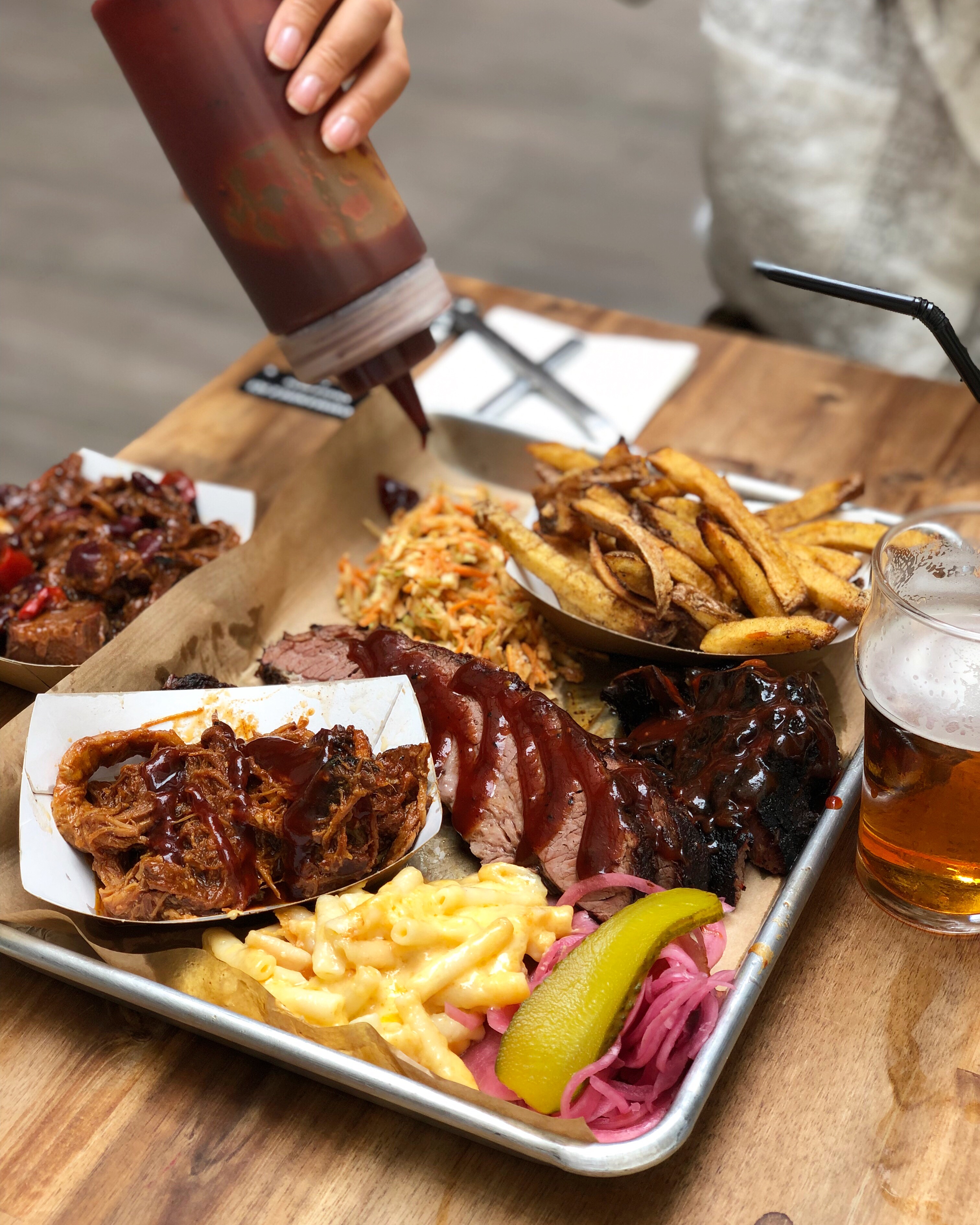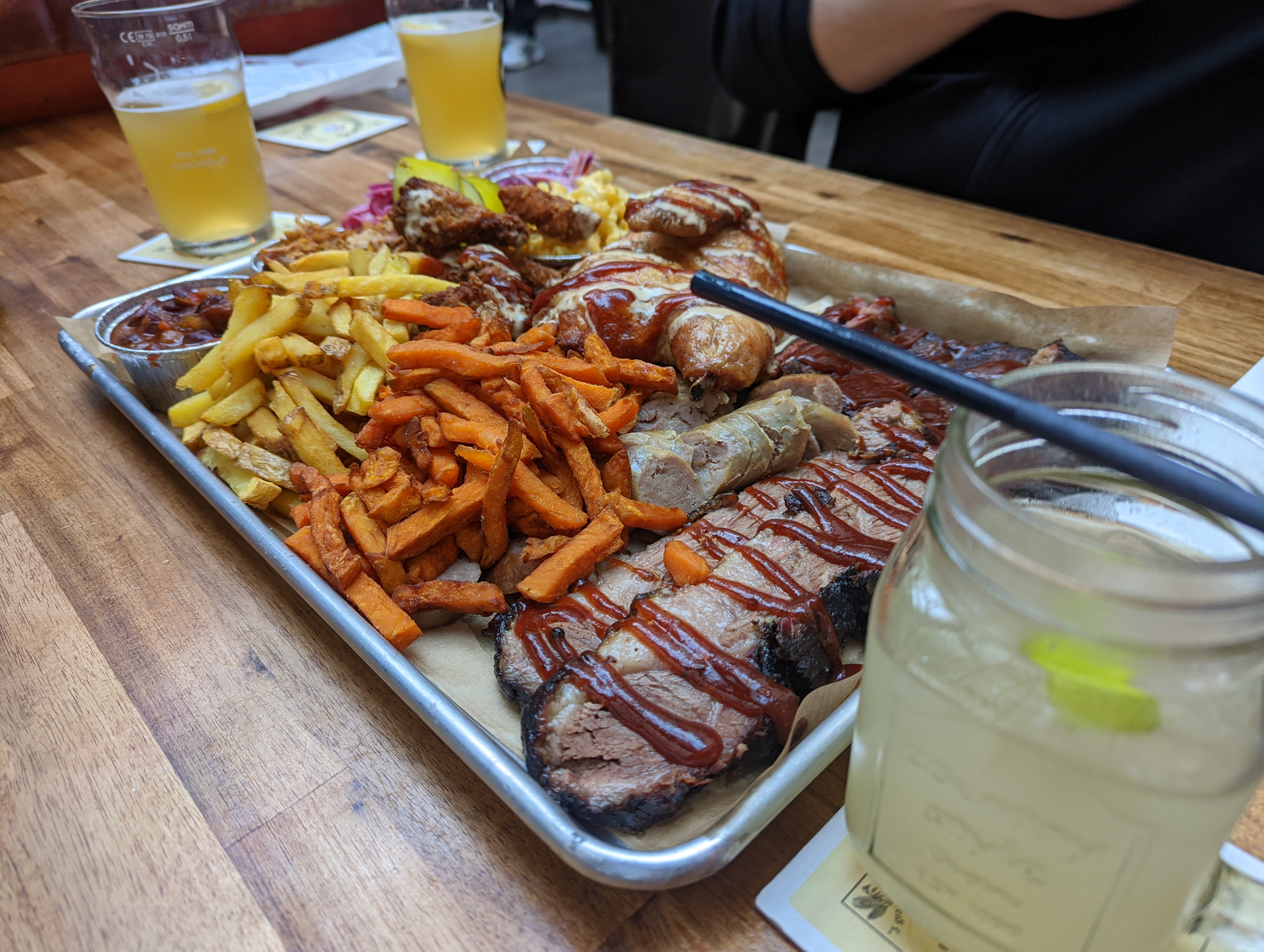 Un ami nous avait recommandé ce restaurant et nous n’avons pas été déçu ! Le choix des bières est très sympas. La nourriture est délicieuse pour tous les fans de BBQ allez y sans réfléchir ! Nous avons pris le plateau avec toutes les viandes et garnitures à 50 euros pour 4 (c’est assez). L’endroit est plutôt grand, on est pas les uns sur les autres il y a de l’espace et les serveurs sont vraiment sympas !