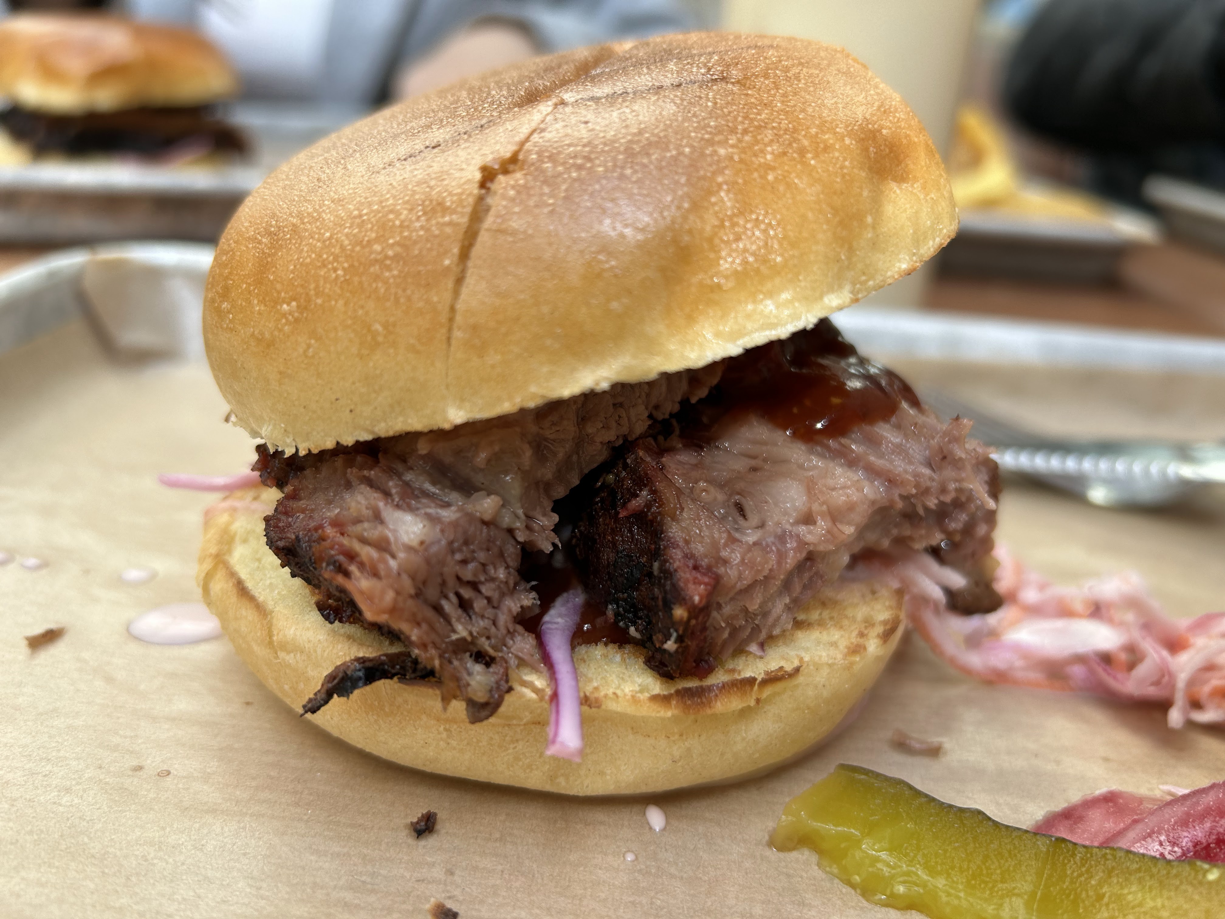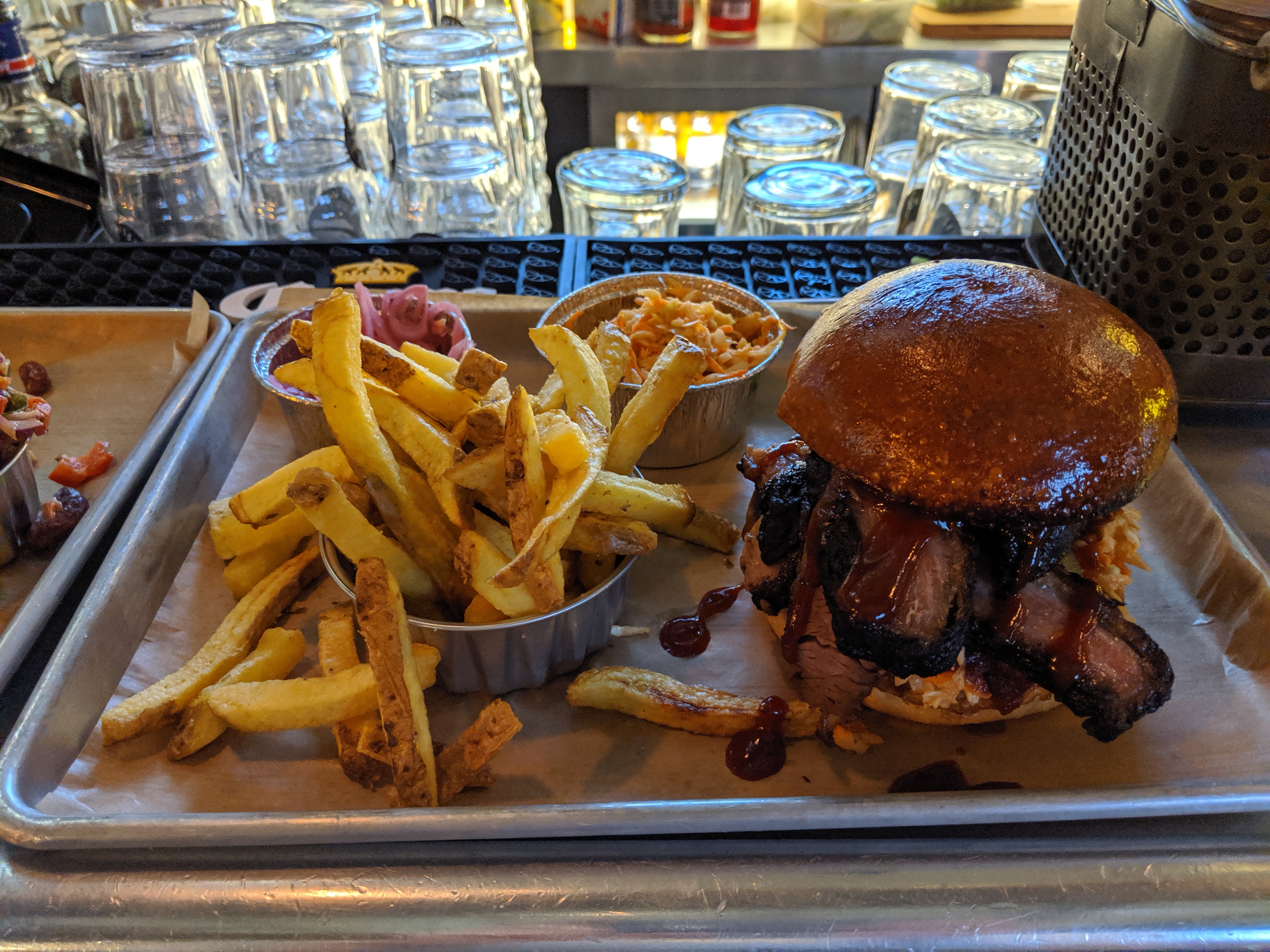 J'ai commandé via Ubereats aujourd'hui pour la deuxième fois. Vous avez 1 assiette de viande (extrémités brûlées avec des fèves au lard en accompagnement) et un sandwich à la poitrine de Old Smokey. Sur leur menu, il est indiqué que tous les sandwichs sont accompagnés de frites, ce que j'ai reçu la dernière fois que j'ai commandé. Aujourd'hui, ma commande est arrivée sans frites, juste le sandwich et quelques tristes morceaux de viande, avec deux petites tasses d'accompagnements (salade de chou et fèves au lard) que l'on voit sur les photos de tout le monde. Je leur ai laissé un message si mes frites étaient omises, pas de réponse. Je ne suis jamais allé au restaurant en personne, mais à en juger par les photos, il semble que l'on y fasse de bien meilleures affaires que par la livraison, ce qui est dommage, surtout dans des moments comme celui-ci. Pour être honnête, la nourriture est bonne, mais les portions que vous recevez sont un peu tristes.