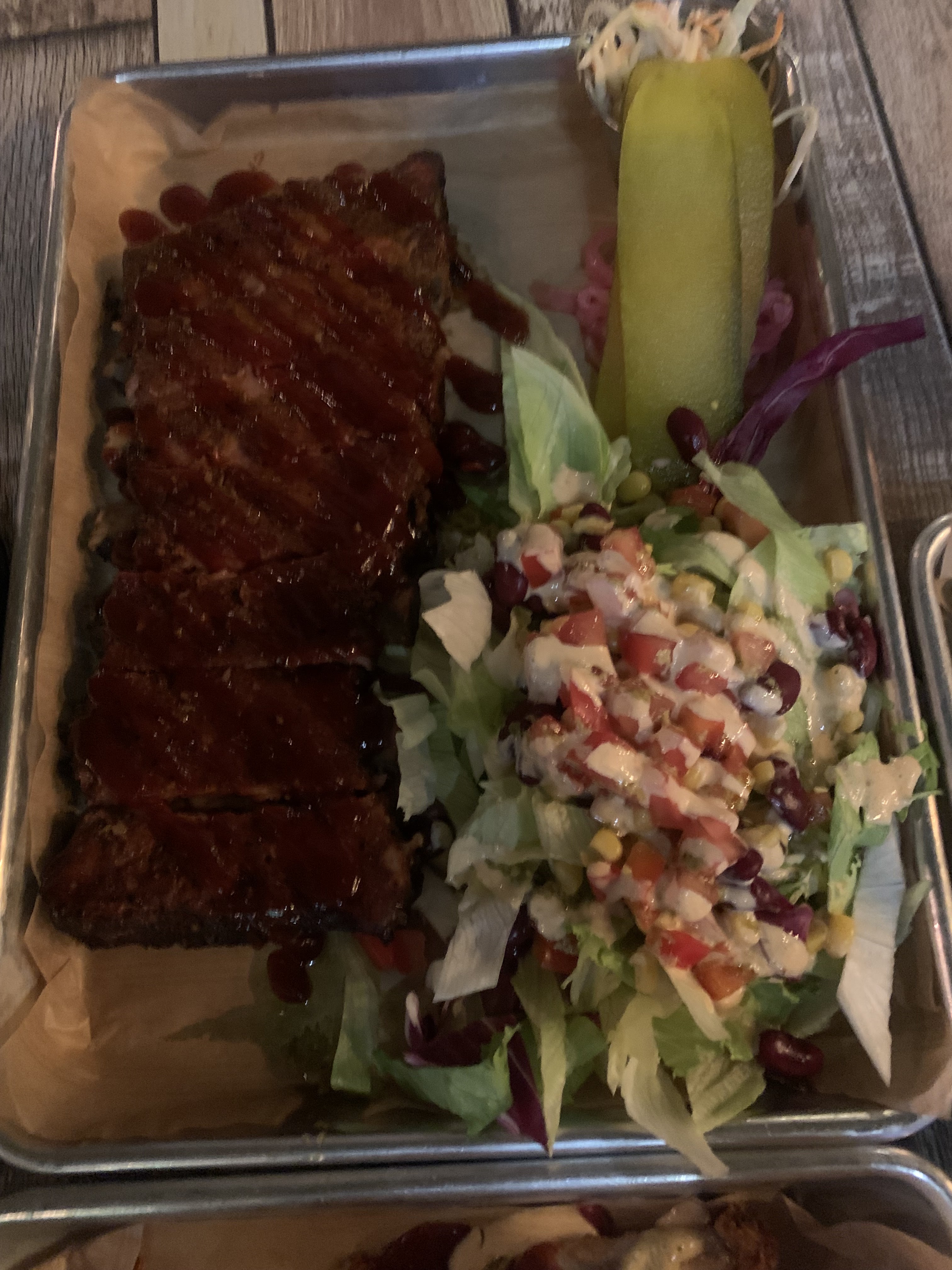 J’ai mangé une partie car affamée et je voulais en avoir pour mon argent. Pour 27€ j’espérais au minimum le goût. Je n’ai mangé que la viande et une partie des frites même si pas ouf. Le rapport qualité prix est médiocre, cher pour ce qui est servi, n’affiche pas les quantités sur la carte, donc très surpris quand on reçoit sa commande. J’avais pris des travers de porc, ils m’ont servi 5 quartiers (je les ai pesé chez moi 209g), secs peu goûteux à 17€, l’épi de maïs pas cuit en supplément 4€, les frites froides molles surgelés 6€ même à ce prix n’espèrerez pas la mayonnaise. Fin bref… si je pouvais mettre -1 étoile je l’aurais fait. À éviter ou alors bien connaître les détails de votre commande avant. La meilleure c’est que je me disais chouette une adresse à faire découvrir à mon copain lui qui aime tant la viande…. Big lol plutôt une adresse à faire découvrir aux services des fraudes oui Photo avant, et après en appuie.