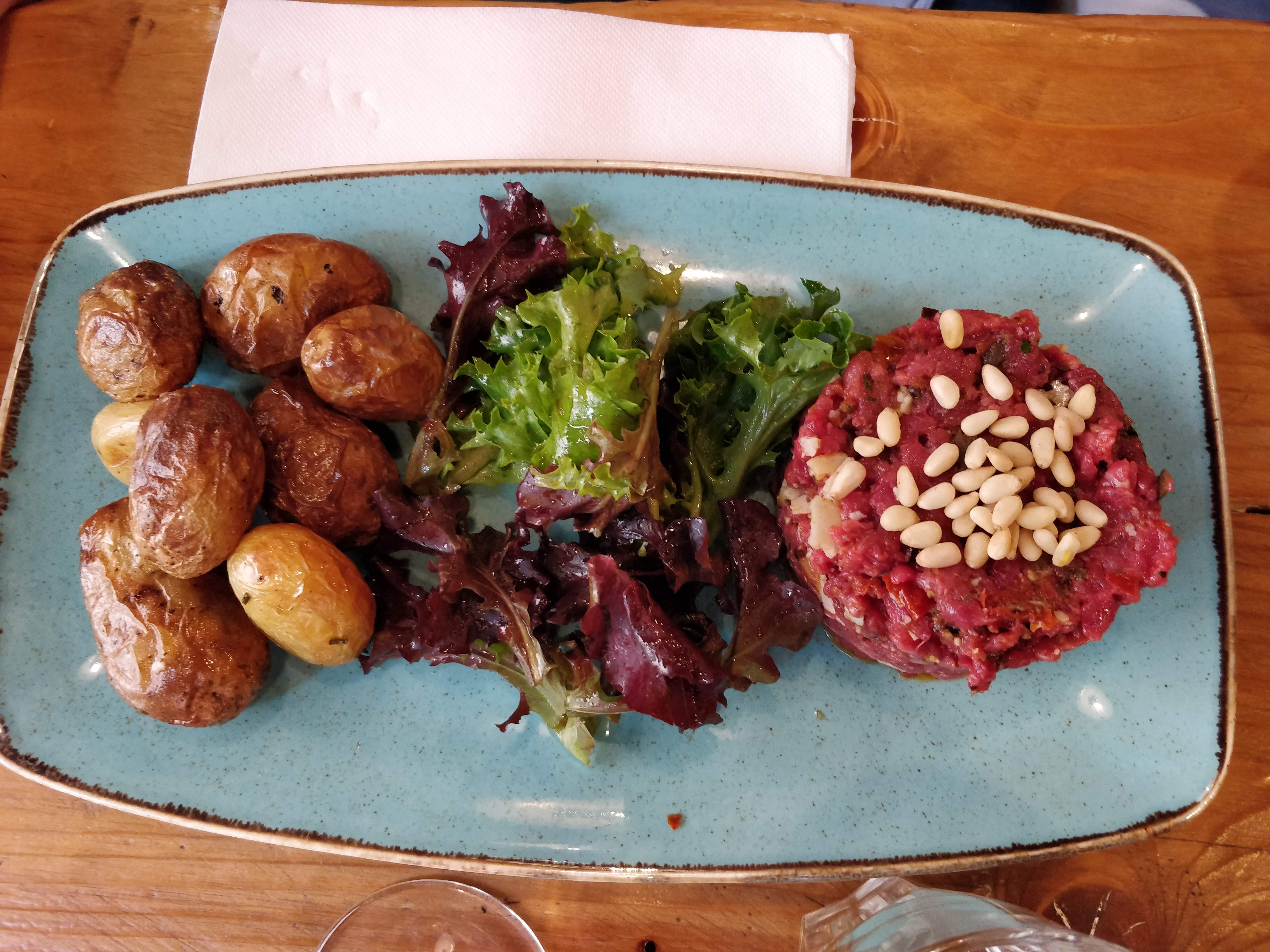 Bon repas, bon accueil, bon vin. En entrée, trio de bruschetta à partager en entrée. Vrai très bon, conséquent, mais pas forcément le plus facile à manger. Hamburger à l'italienne, commandé saignant, reçu très légèrement plus cuit. Mais très bon. En revanche, il faut soit avoir une grande bouche, soit ôter le pain du dessus. D'ailleurs, mention spéciale pour le pain que j'ai trouvé très très bon ! Et les pommes grenailles revenues dans du beurre salé : une tuerie ! Les prix sont corrects : 53€ pour une entrée, 2 burgers et 2 verres de vin.