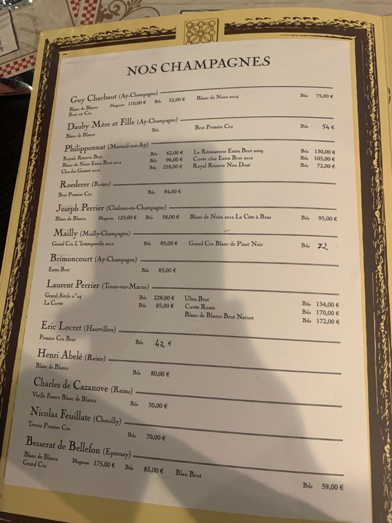 Venu visiter cette belle ville d’Ay-Champagne, aucune identification extérieure de ce restaurant !! Étonnant!! Beaucoup de touristes étrangers en terrasse fermée . Attente avant prise de contact et propositions de menus. Cuisine simple et assiette trop chère ( ris de veau à 42€, entrecôte 36€,salades n’ en parlons pas! Desserts très moyens a12€ .Et les boissons alcoolisées y compris champagne ( breuvage local ) sont excessivement élevées. BREF un piège à TOURISTE de pure rentabilité . A fuir .