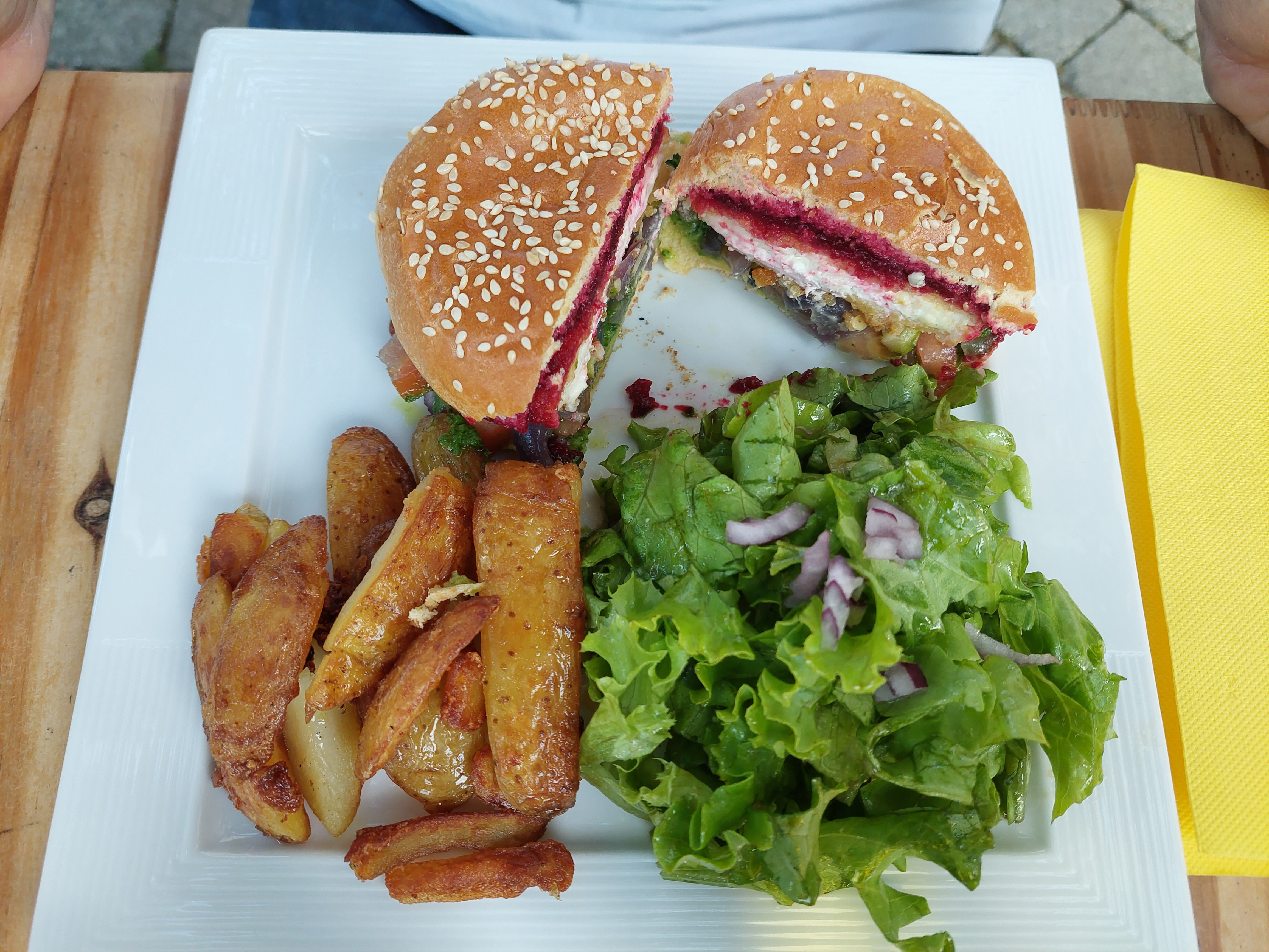 Service sympathique en terrasse. Délicieux burger végétarien au fromage de chèvre.