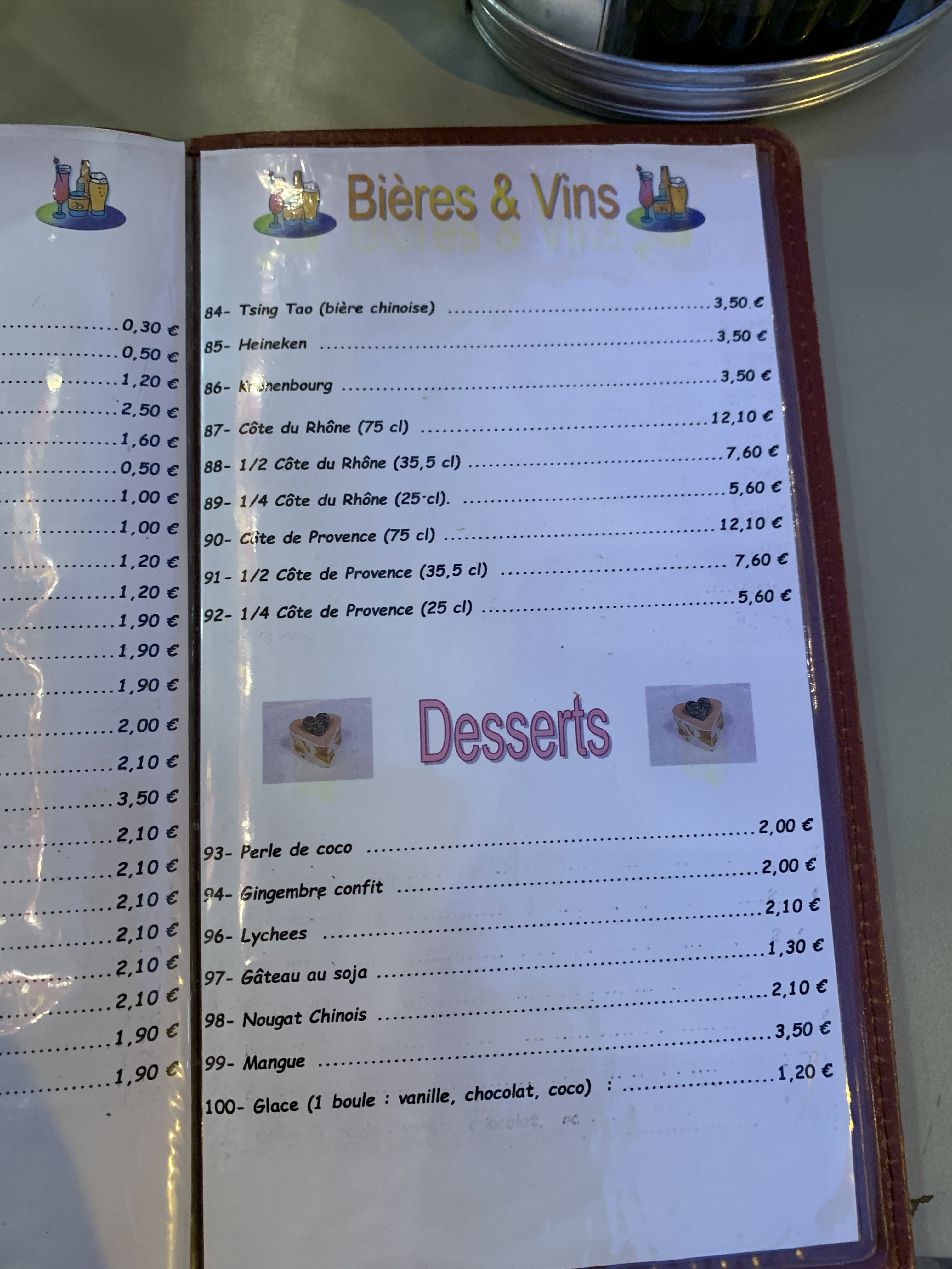 Je suis revenu je me suis pris des raviolis grille toujours aussi bien grille sauce très bonne 4 pièces a 5,20€ en plat nouilles au poulet sauce Extra bonne 8,00€. Nems au porc très très bon a 4,90€, Raviolis grille pâte épaisse sans plus viande bonne a 4,90€, Raviolis Vietnamiens pâte gluante mais avec la sauce ça passe mieux a 4,90€ et Riz Nature a 1,90€ a la carte il y a très peu de plats petite salle, toilette très propre.