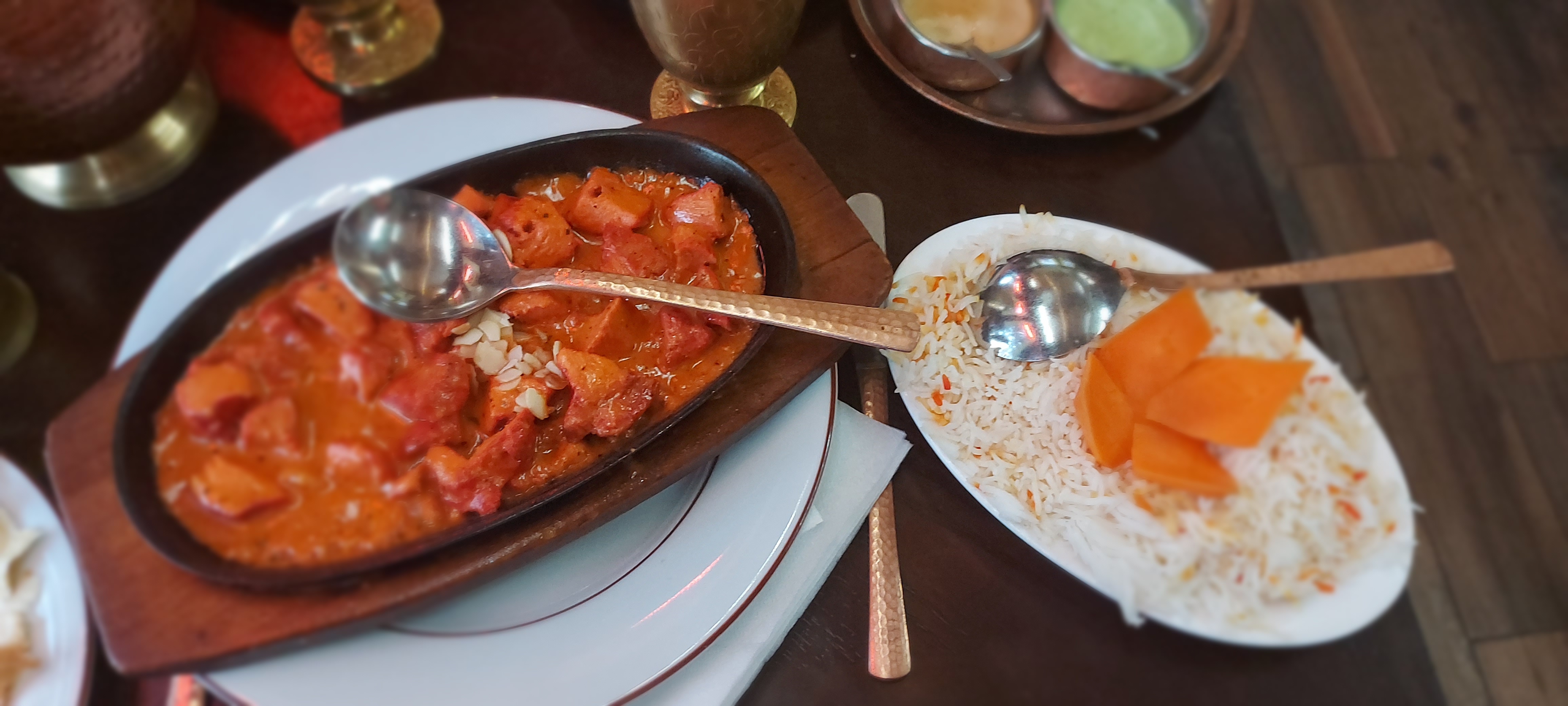J'y suis allé avec madame nous avons commandé un poulet massala et riz et 3 nans le riz était fade les plats étaient sans sauce sachant que nous avons pris 3 nans 😂 Le poulet était tendre mise à part cela l'addition était corsée je déconseille fortement
