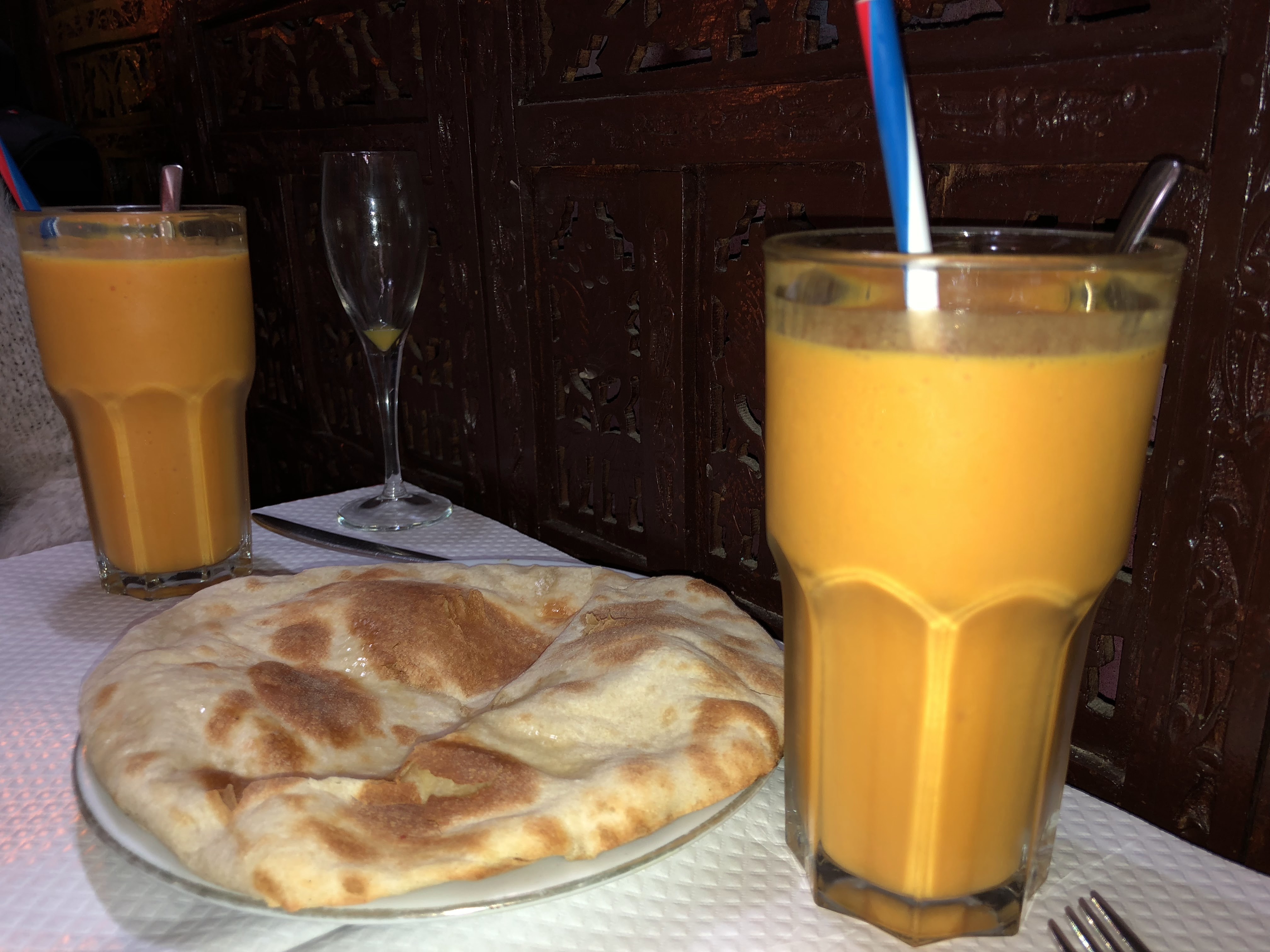 Dès l'entrée un apéritif nous a été offert: des chips de céréales avec de très bonnes sauces plus un cocktail virgin. La déco était magique! J'ai adoré: les chaises lourdes en bois, les verres en métal, les tableaux partout. Le service était attentionné, souriant et sympathique. Les portions étaient généreuses, j'étais juste sceptique en regardant la longueur de la carte mais les plats finalement étaient délicieux. C'est un très bon restaurant indien aux tarifs corrects! Top!