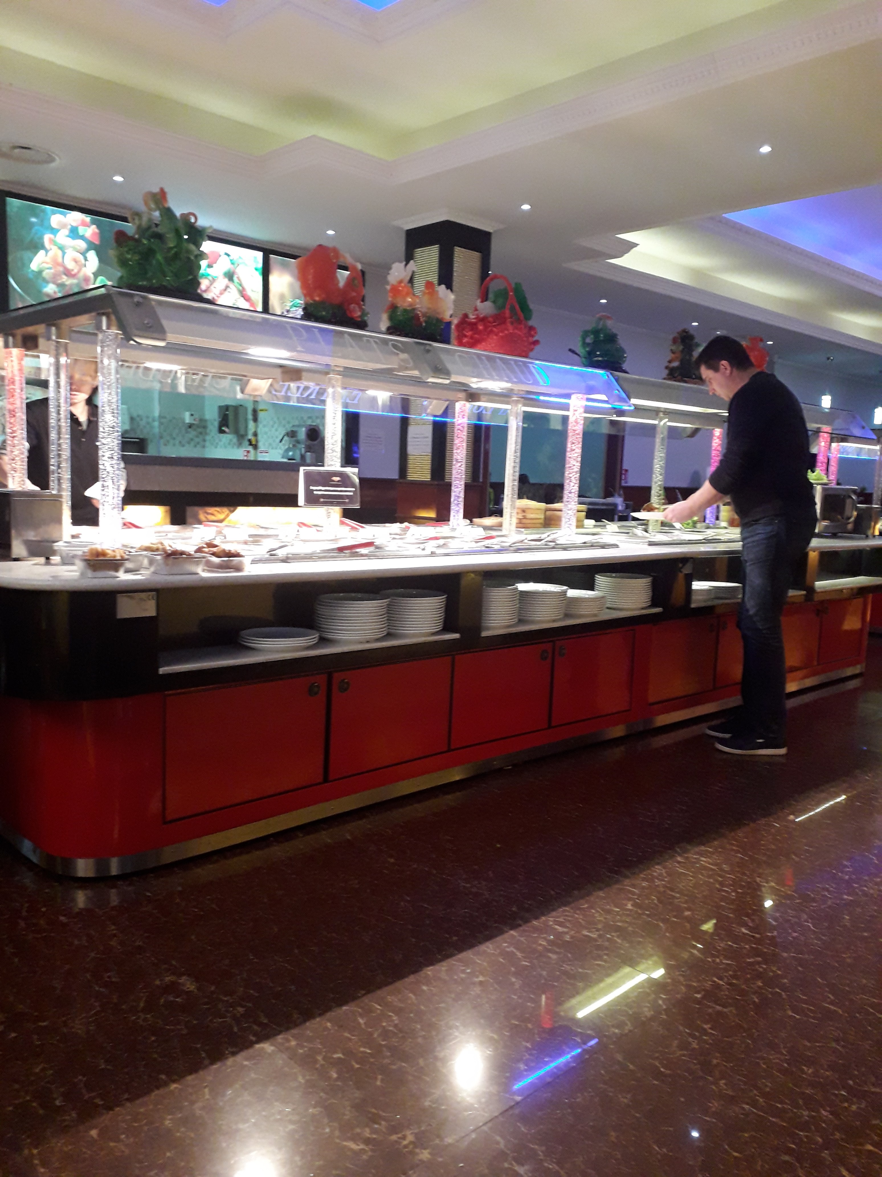 Endroit très bruyant et des enfants qui courent de partout(où sont les parents ?),la nourriture a l'air d'être recuite,entre autre les nems, samoussa,le Buffet est varié,mais le réapprovisionnement des bacs est quasi inexistant si vous venez vers 21h30. Sans parler de la personne à la caisse qui se contente de prendre votre bon de table et encaissé limite sans un regard .... Un peu d aimabilité ne coûte rien...