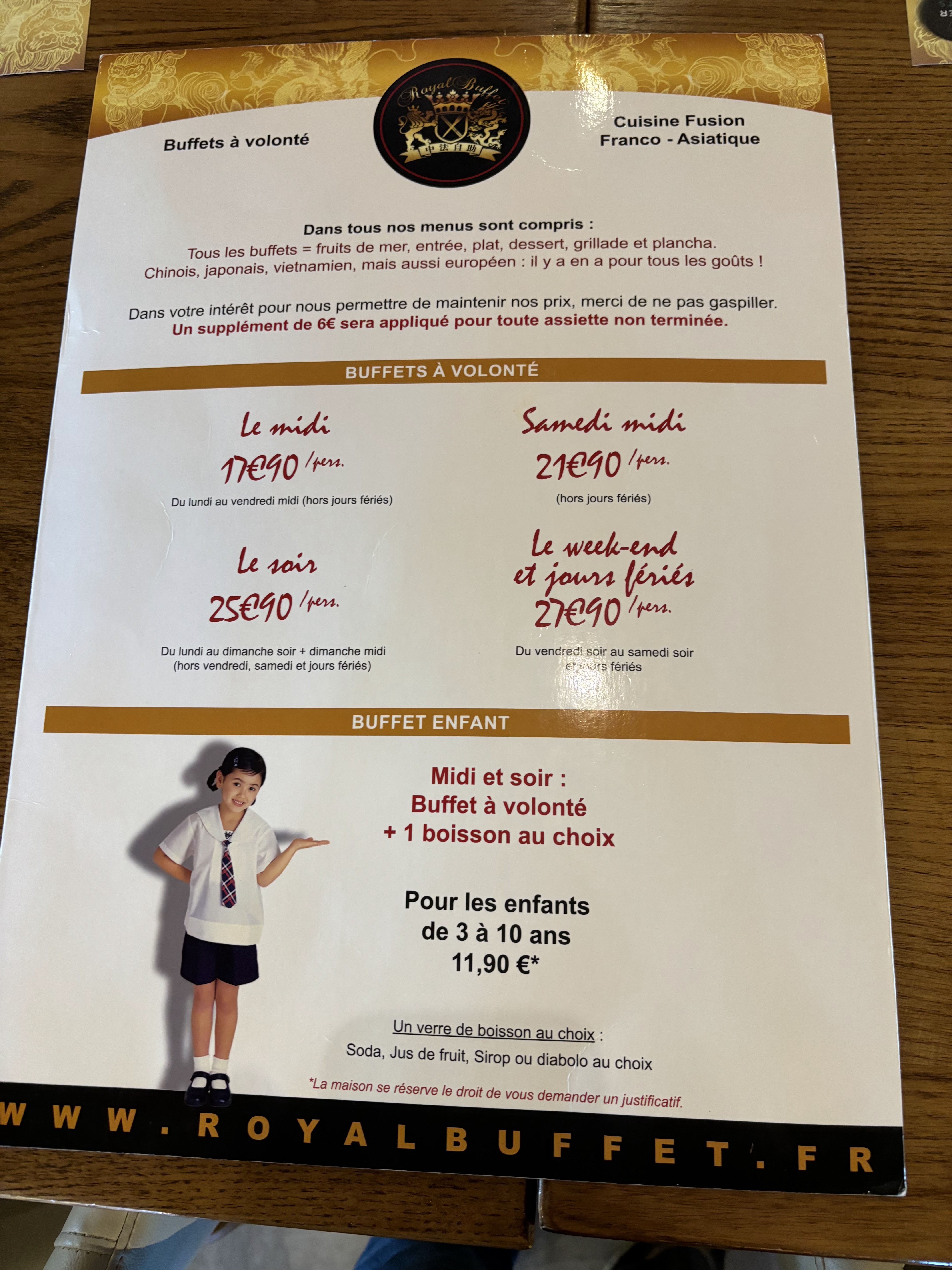 Oh my god comme dirait un ricain. ce restaurant buffet asiatique est a un tout autre niveau ! j'en ai fait dans toute la france mais celui là est exceptionnellement magnifique et de qualitée. Sashimi thon et saumon... Langouste entière...de la bonne viande et de bon desserts et un personnel agréable et sympa comme tout . c'est devenu rare dans des buffet qui sont maintenant devenu radin en france. ce royal buffet est digne de son nom royal c'est tout a fait adapté.