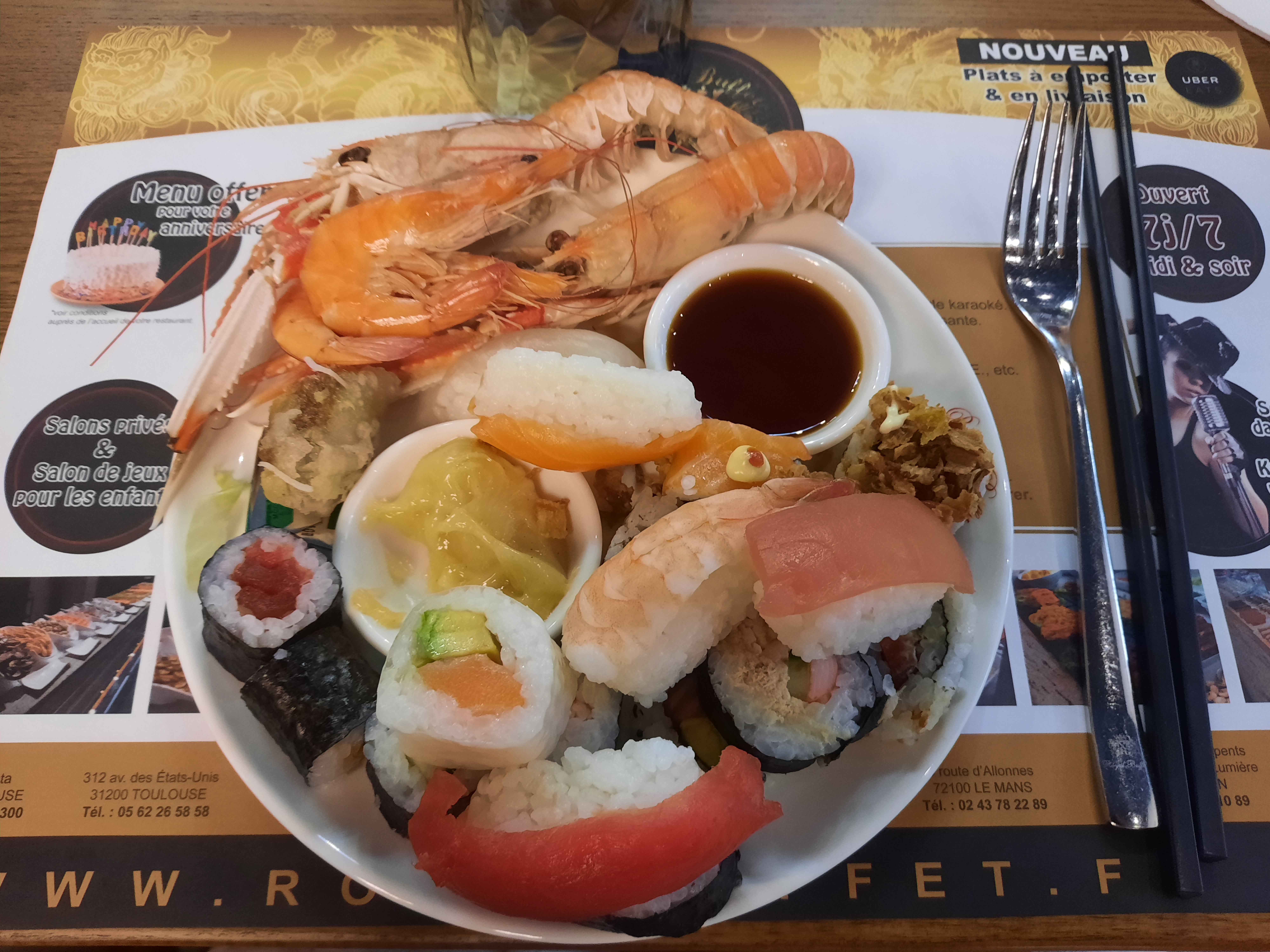Très bon BUFFET à volonté , qui donne envie de revenir ! Prix plus élevé que la concurrence mais justifié. Ce qui donne envie de revenir et justifie le prix : -Présentation du Buffet -Du homard à volonté !!!!! -Des côtes de BŒUF à volonté !!!! (magret de canard ,entrecôte ... ) -Des Sushis à peu près bien proportionnés ,nous ne sommes pas gavé de riz pour très peu de poissons .( Présence de SASHIMI à volonté également !!! ) -Essayer les soirées karaoké (à partir de septembre nous avons bien noté. -La formule avec Apéro + Vin + Thé ou CAFÉ Nous y retournerons pour essayer le KARAOKÉ en espérant que le services et les produits proposés restent constants .