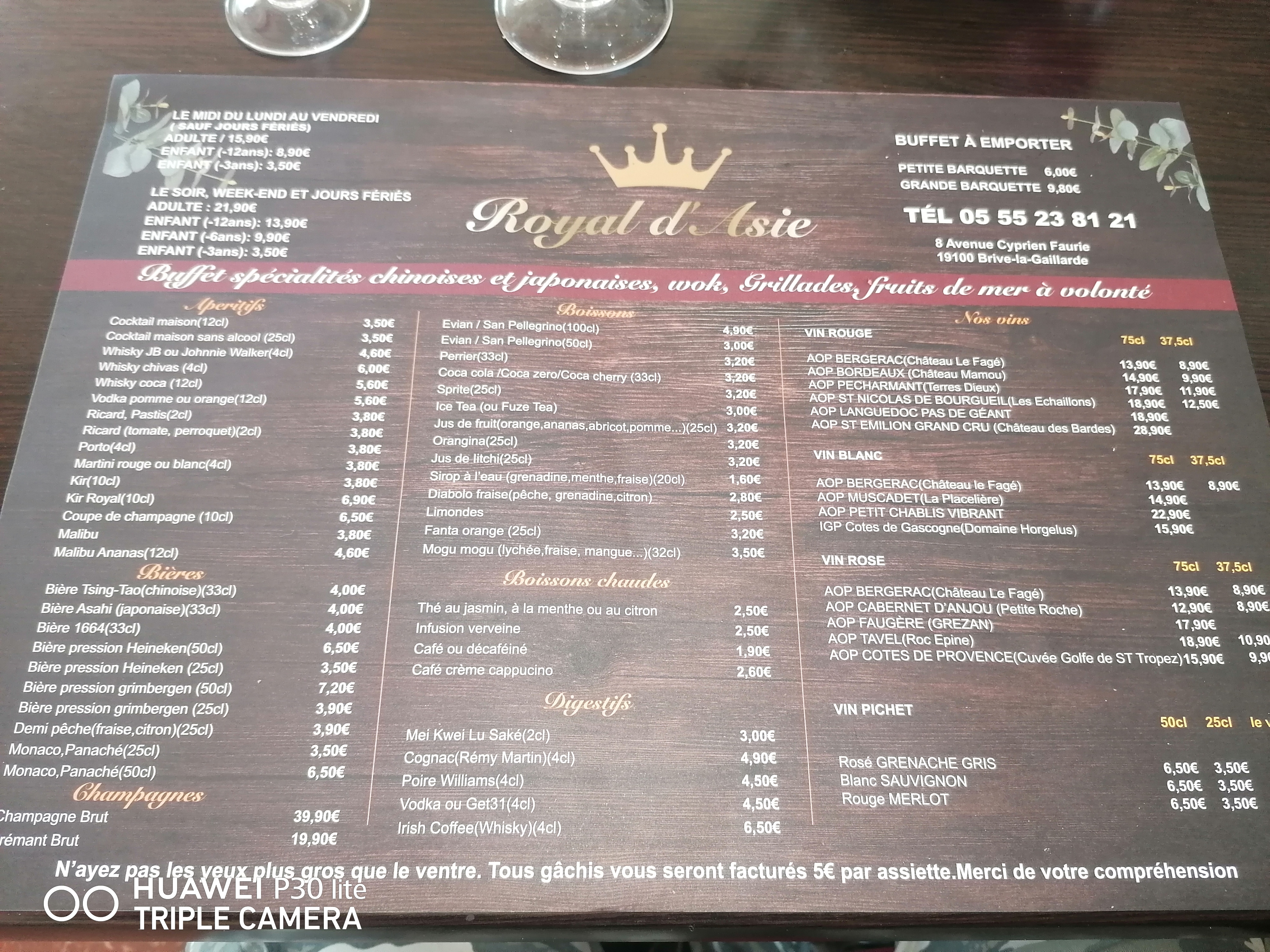 Tres bon restaurant chinois. Un buffet énorme, je pense qu'ils ont le plus gros choix de tout Brive. Je pense qu'ils peuvent plaire a un maximum de personnes. Car en plus des spécialités chinois et des woks au choix,il y a des entrées a la francaise (pas fait maison je pense) des sushis, des crustacés, pizza, saumon, et j'en passe. Un tres bon choix de restaurant pour un groupe de personne au gout multiple. Je recommande. Note covid19 : ils mettent beaucoup en oeuvre. Gants plastique a disposition. Assiettes deja sur table avec pince et louche atitré. Dommage que les clients ne jouent pas trop le jeux