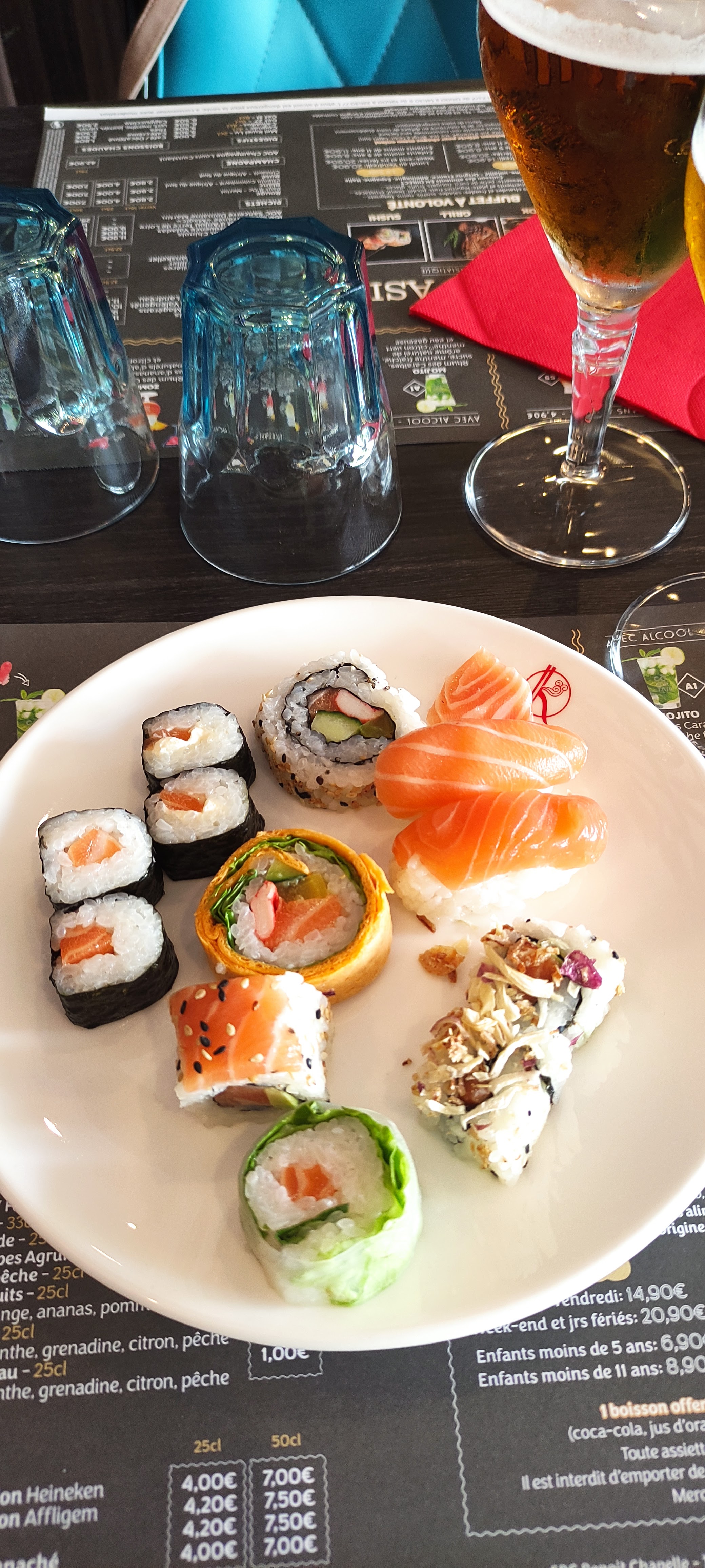Nous avons l'habitude avec mon conjoint d'aller chez les concurrents en face et puis la curiosité nous a emportée ! Nous avons été agréablement supris, c'est propre, bon respect de l'hygiène, pas mal de choix, nous ne sommes pas tous agglutinés les uns sur les autres et surtout la salle est CALME ! Juste dommage de ne pas avoir un petit Saké au moment de payer l'addition :)