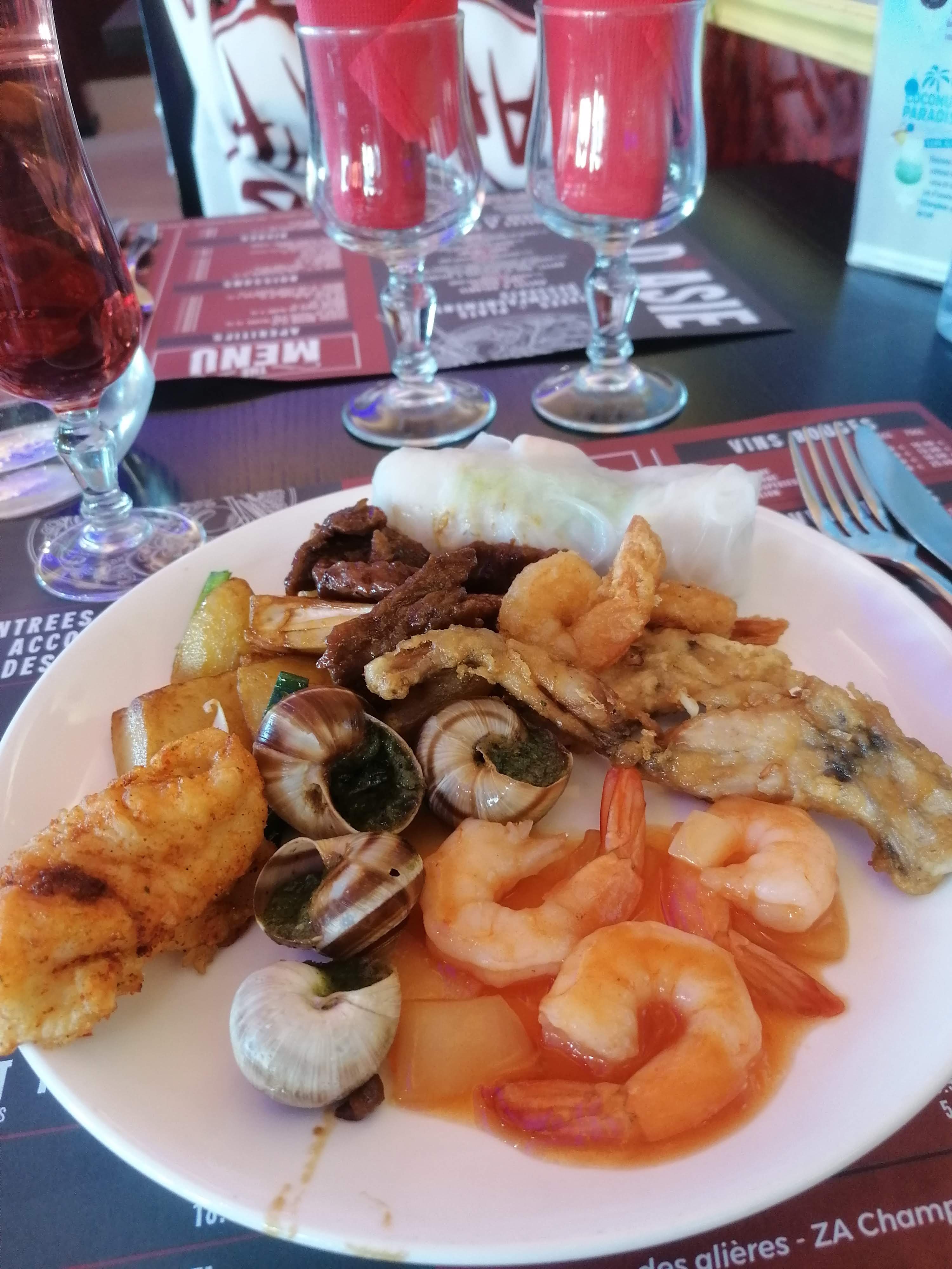 Énormément de choix , restaurant très propre , buffet toujours rempli , escargot , viande très très bonne , plat cuisiné excellent , vraiment beaucoup de choix , fruit frais , et très très bon , énormément de choix , entrée, plat , fromage au choix très bon beaucoup de choix , machine a glace a l'italienne , c'est vraiment un truc de fou , tout est très bon , le choix est énorme , je conseil vraiment se resto , tout est très bon , on est bien reçu et on y mange super bien , je recommande +++++++ , et tout ça pour un prix dérisoire de même pas 19€ le soir