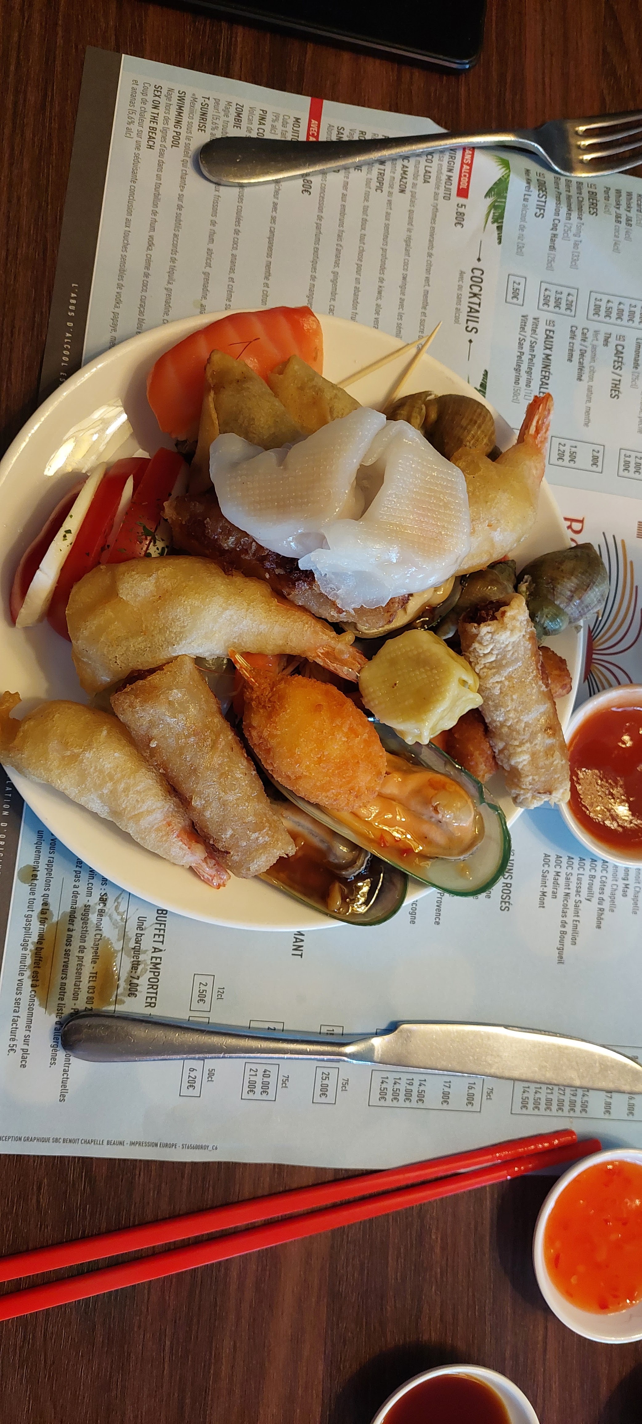 Découverte désastreuse !! A fuir !! Nous étions 4 dont 2 qui étaient déjà venus. Ils ont été très décus eux aussi par rapport à leur dernière expérience dans ce restaurant. Plat fades, moules fraiches à mâcher comme du plastic et huitres fraiches sans gouts. Pouquoi des nugets, saucisses de barbecue, steaks hachés encore sous emballage, frites et tiramissu chez un restaurant chinois ? Morito refait à ma demande car fait à l'eau, pas de glace pilée et tiges de menthe très noircies ... idem pour celui refait !! Le personnel m'as expliqué ne pas savoir le faire et ne mettre que de l'eau à la place de la glace pilée. Je leur ai donc sugéré de l'enlever de la carte mais ils m'ont répondu que les clients ne disaient rien donc ils le laisse !! 6.90€ quand même !! C'est vrai que le restaurant est propre et grand mais 19.90€ pour manger des plats sans gouts c'est très cher ! La qualité n'y est pas du tout ! Je pens qu'il y a beaucoup de surgelés ! Le responsable du restaurant s'est accroché fortement avec un client, tout le monde y a assité ... il aurai pu inviter le client à régler leur différent dans un endroit à l'écart mais le responsable n'en n'as que faire, ses dires sont assez durs ... alors qu'il avait tord !! Le pire c'est qu'en partant les clients font la queue dehors en attendant qu'une table se libère ! PS: Je n'ai pas bu ni payé le morito.