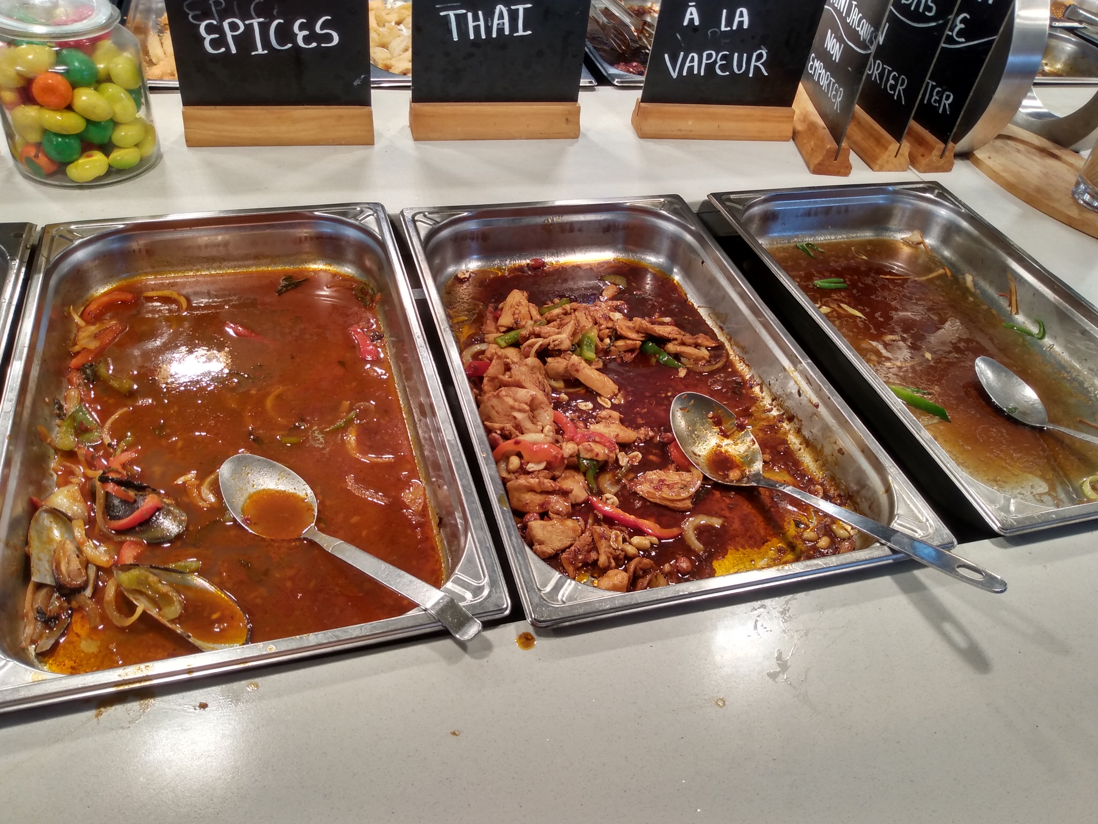 Avis mitigé, certains plats très bons, d'autres très moyens, certains serveurs très aimables, d'autres moins comme le cuisinier au wok pas du tout souriant et froid. Beaucoup de choix dans les desserts notamment. Dommage que les tables soient collées les unes aux autres alors qu'il y a largement de la place pour éviter d'entendre toute la conversation des voisins et pour circuler aussi! On ne peut pas se croiser à deux entre les allées, c'est très désagréable !