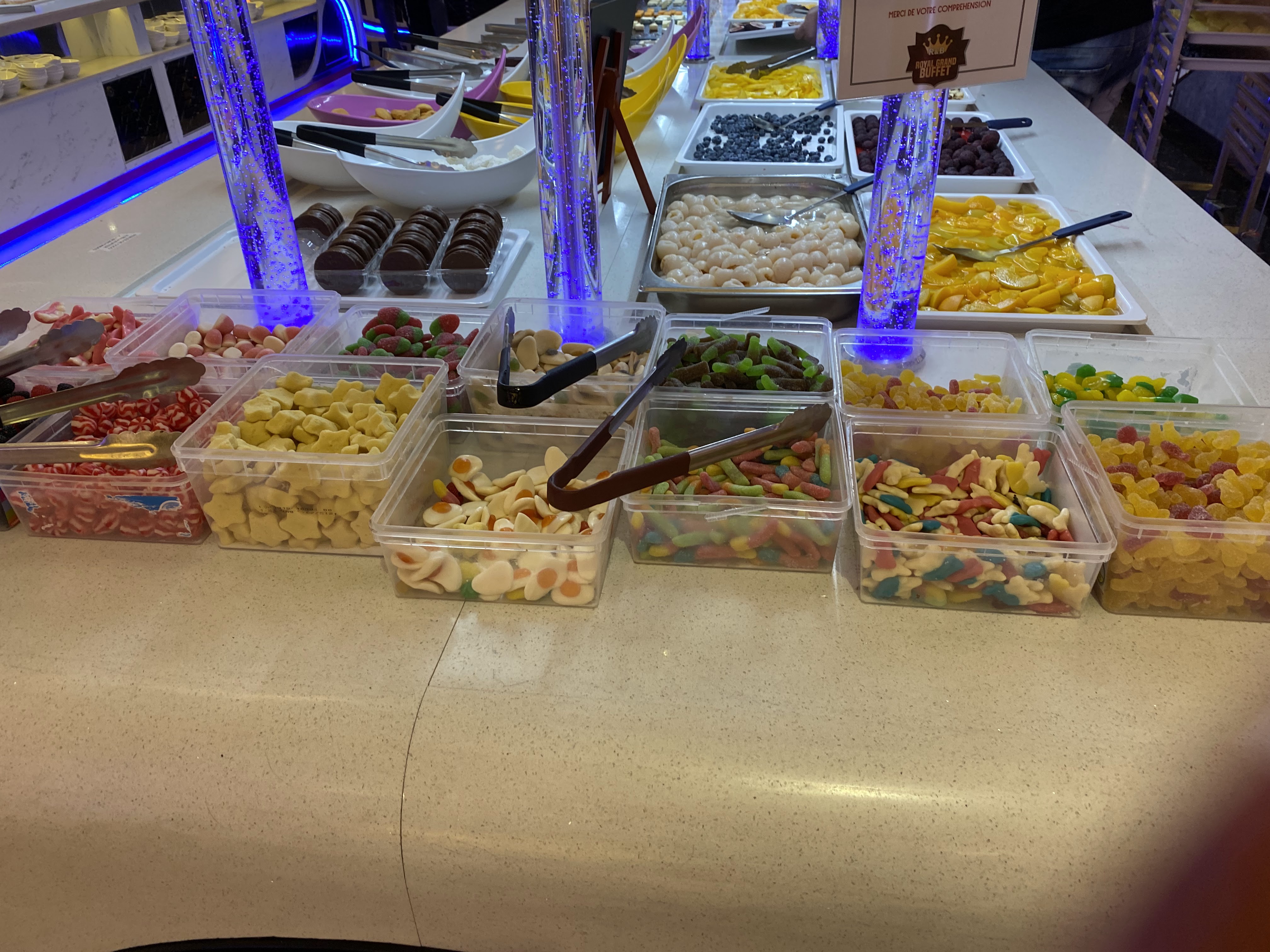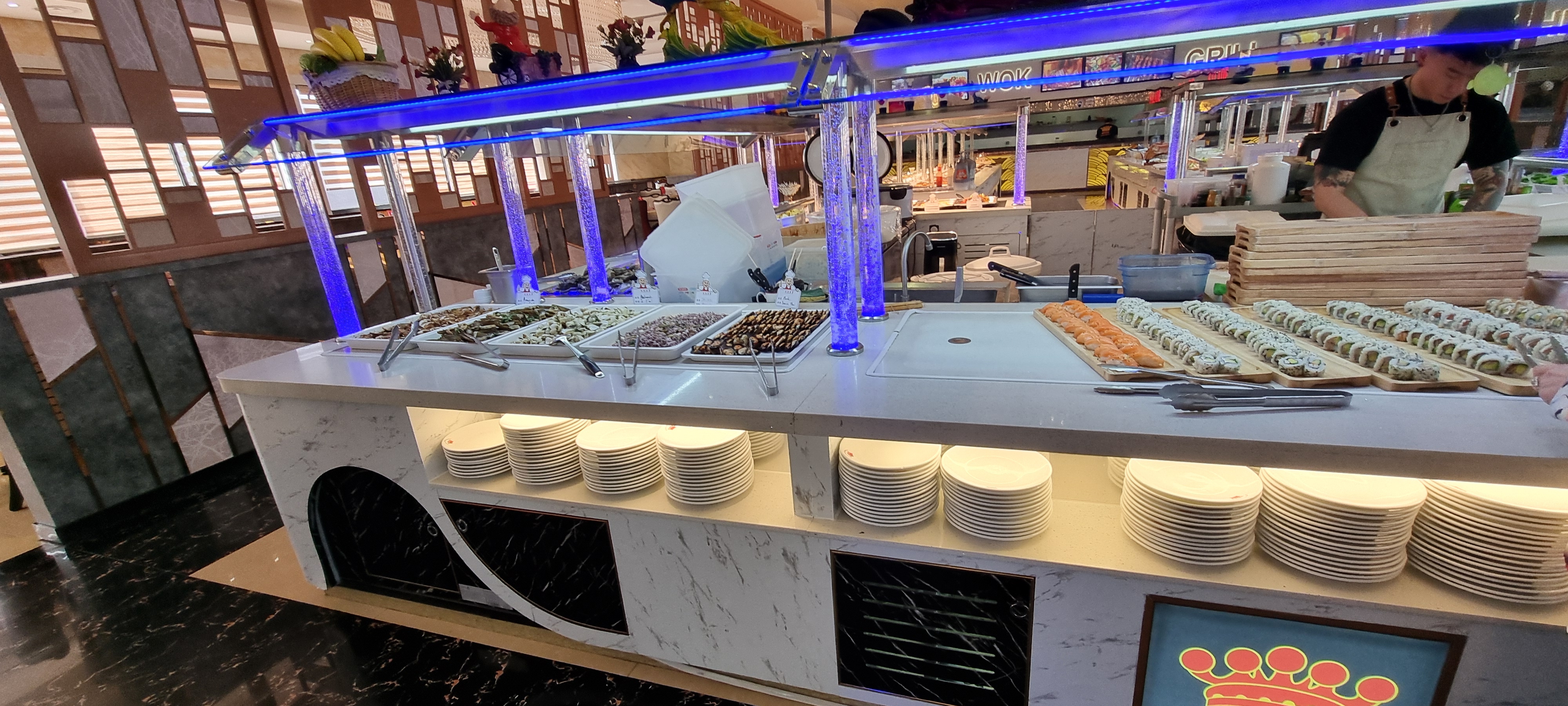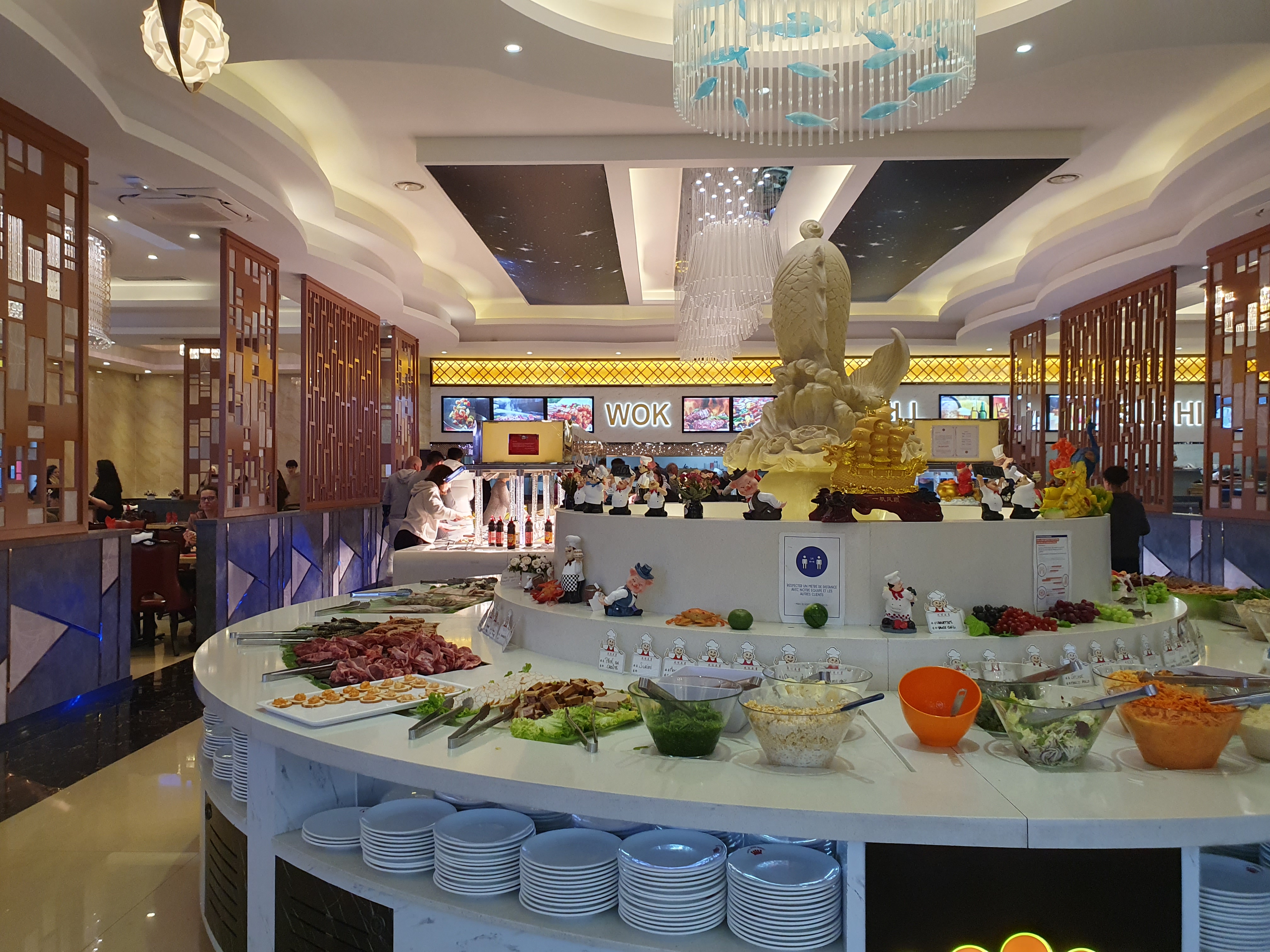 L'espace est gigantesque. Grand choix de plats, des saucisses aux makis en passant par des fritures et produits cuits à la vapeur. Il y a 1 stand grill et 1 stand wok. Un bar à desserts bien fourni. Beaucoup de crustacés disponibles. Pour la 1ère commande de boissons, la livraison est effectuée par 1 robot 😉.